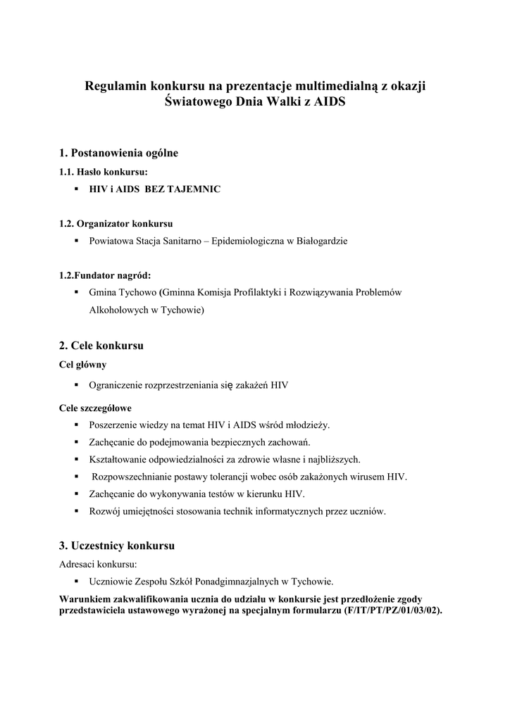 Regulamin konkursu na prezentacje multimedialną z okazji Światowego Dnia Walki z AIDS 1. Postanowienia ogólne 1.1. Hasło konkursu: HIV i AIDS BEZ TAJEMNIC 1.2. Organizator konkursu Powiatowa Stacja Sanitarno – Epidemiologiczna w Białogardzie 1.2.Fundator nagród: Gmina Tychowo (Gminna Komisja Profilaktyki i Rozwiązywania Problemów Alkoholowych w Tychowie) 2. Cele konkursu Cel główny Ograniczenie rozprzestrzeniania się zakaŜeń HIV Cele szczegółowe Poszerzenie wiedzy na temat HIV i AIDS wśród młodzieŜy. Zachęcanie do podejmowania bezpiecznych zachowań. Kształtowanie odpowiedzialności za zdrowie własne i najbliŜszych. Rozpowszechnianie postawy tolerancji wobec osób zakaŜonych wirusem HIV. Zachęcanie do wykonywania testów w kierunku HIV. Rozwój umiejętności stosowania technik informatycznych przez uczniów. 3. Uczestnicy konkursu Adresaci konkursu: Uczniowie Zespołu Szkół Ponadgimnazjalnych w Tychowie. Warunkiem zakwalifikowania ucznia do udziału w konkursie jest przedłoŜenie zgody przedstawiciela ustawowego wyraŜonej na specjalnym formularzu (F/IT/PT/PZ/01/03/02). 4. Ramy czasowe Prezentacje multimedialne naleŜy przesłać do 22 listopada 2010r. 5. Zakres tematyczny Zadanie konkursowe polega na wykonaniu przez młodzieŜ tematycznej prezentacji multimedialnej. Autorzy prac mają zachęcić młodych ludzi do zainteresowania się tematyką HIV/AIDS w ciekawy sposób prezentując zagadnienia z zakresu profilaktyki HIV/AIDS, np.: róŜnica miedzy HIV a AIDS, główne drogi zakaŜenia wirusem HIV, sytuacje, w których nie moŜe dojść do zakaŜenia, aspekty prawne, psychologiczne i społeczne dotyczące osób zakaŜonych wirusem HIV, chorych na AIDS. 6. Zasady przeprowadzenia konkursu 6.1. Liczba etapów konkursu: I. 6.2. Zadania dla uczestników konkursu: prezentację naleŜy wykonać w programie PowerPoint, prezentacja powinna zajmować max 20 slajdów, wskazane jest aby treści zawarte w prezentacji zilustrowane zostały opracowanymi komputerowo elementami multimedialnymi, takimi jak: rysunki, zdjęcia, a takŜe dźwięki czy obraz, prezentacje naleŜy nagrać na płytę CD / DVD, na opakowaniu płyty CD / DVD naleŜy umieścić dane uczestnika: imię i nazwisko, data urodzenia , telefon kontaktowy. 6.3. Do kaŜdej pracy naleŜy dołączyć zgodę przedstawiciela ustawowego dziecka, które nie ukończyło 18 roku Ŝycia na udział w konkursie ( Załącznik nr 2 ) oraz zgodę uczestnika pełnoletniego na udział w konkursie ( Załącznik nr 3 ) 6.4. Miejsce nadsyłania prac: Powiatowa Stacja Sanitarno – Epidemiologiczna w Białogardzie ul. Przechodnia 2, 78-200 Białogard (dopisek: konkurs na prezentację multimedialną) 7. Kryteria oceny Prace będą oceniane pod względem: - Zgodności z tematem konkursu. - Treści merytorycznej. - Estetyki wykonania prezentacji. - Czytelności treści. - Wartości perswazyjnej przekazu. - Form informatycznych. 8. Skład komisji konkursowej minimum 3 osoby, np.: Państwowy Powiatowy Inspektor Sanitarny w Białogardzie, pracownik Oświaty Zdrowotnej i Promocji Zdrowia Powiatowej Stacji Sanitarno – Epidemiologicznej w Białogardzie, przedstawiciel ZSP w Tychowie. 9. Zasady nagradzania 9.1. Liczba laureatów konkursu - 3 (I, II i III miejsce). 9.2. Rodzaj nagród - Nagrody rzeczowe. Organizatorzy zastrzegają sobie prawo do zmiany nagród na równorzędne lub zmiany podziału nagród w związku z ustaleniami podjętymi podczas obrad Komisji Konkursowej. Lista laureatów zostanie zamieszczona na stronie internetowej Powiatowej Stacji SanitarnoEpidemiologicznej w Białogardzie. 10. Prawa autorskie Przystąpienie do konkursu jest równoznaczne z nieodpłatnym przeniesieniem na Powiatową Stację Sanitarno-Epidemiologiczną w Białogardzie całości autorskich praw majątkowych do prac na następujących polach eksploatacji w Polsce i za granicą: • zwielokrotniania jakąkolwiek techniką, w tym m.in.: technikami poligraficznymi, fotograficznymi, cyfrowo, etc; • publicznego wykorzystania albo publicznego odtworzenia; • publikacji; • prezentacji w mediach, w tym takŜe elektronicznych. Przystąpienie do konkursu jest takŜe równoznaczne z nieodpłatnym przeniesieniem na Powiatową Stację Sanitarno – Epidemiologiczną w Białogardzie wyłącznego prawa zezwalania na wykonywanie zaleŜnego prawa autorskiego do pracy.