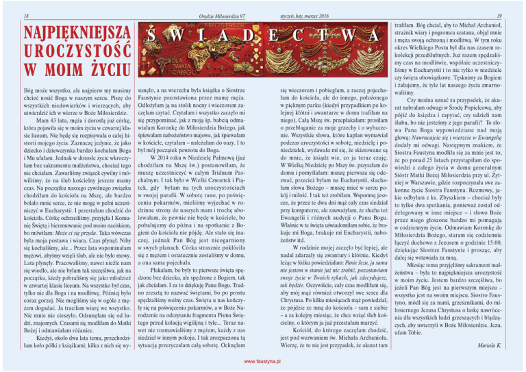 18 Orędzie Miłosierdzia 97 styczeń, luty, marzec 2016 NAJPIÊKNIEJSZA Ś W I A D E C T W A UROCZYSTOŒÆ W MOIM ¯YCIU Bóg może wszystko, ale najpierw my musimy chcieć nosić Boga w naszym sercu. Piszę do wszystkich niedowiarków i wierzących, aby utwierdzić ich w wierze w Boże Miłosierdzie. Mam 43 lata, męża i dorosłą już córkę, która pojawiła się w moim życiu w czwartej klasie liceum. Nie będę się rozpisywała o całej historii mojego życia. Zaznaczę jedynie, że jako dziecko i dziewczynka bardzo kochałam Boga i Mu ufałam. Jednak w dorosłe życie wkroczyłam bez sakramentu małżeństwa, chociaż tego nie chciałam. Zawarliśmy związek cywilny i mówiliśmy, że na ślub kościelny jeszcze mamy czas. Na początku naszego cywilnego związku chodziłam do kościoła na Mszę, ale bardzo bolało mnie serce, że nie mogę w pełni uczestniczyć w Eucharystii. I przestałam chodzić do kościoła. Córkę ochrzciliśmy, przyjęła I Komunię Świętą i bierzmowanie pod moim naciskiem, bo mówiłam: Może ci się przyda. Taka wówczas była moja postawa i wiara. Czas płynął. Niby się kochaliśmy, ale... Przez lata wspominałam mężowi, abyśmy wzięli ślub, ale nie było mowy. Lata płynęły. Pracowaliśmy, nawet nieźle nam się wiodło, ale nie byłam tak szczęśliwa, jak na początku, kiedy pobraliśmy się jako młodzież w czwartej klasie liceum. Na wszystko był czas, tylko nie dla Boga i na modlitwę. Później było coraz gorzej. Nie mogliśmy się w ogóle z mężem dogadać. Ja traciłam wiarę we wszystko. Nic mnie nie cieszyło. Odsunęłam się od ludzi, znajomych. Czasami się modliłam do Matki Bożej i odmawiałam różaniec. Kiedyś, około dwa lata temu, przechodziłam koło półki z książkami; kilka z nich się wy- sunęło, a na wierzchu była książka o Siostrze Faustynie pozostawiona przez mamę męża. Odłożyłam ją na stolik nocny i wieczorem zaczęłam czytać. Czytałam i wszystko zaczęło mi się przypominać, jak z moją śp. babcią odmawiałam Koronkę do Miłosierdzia Bożego, jak śpiewałam nabożeństwo majowe, jak śpiewałam w kościele, czytałam – należałam do oazy. I to był mój początek powrotu do Boga. W 2014 roku w Niedzielę Palmową (już chodziłam na Mszę św.) postanowiłam, że muszę uczestniczyć w całym Triduum Paschalnym. I tak było w Wielki Czwartek i Piątek, gdy byłam na tych uroczystościach w swojej parafii. W sobotę rano, po poświęceniu pokarmów, mieliśmy wyjechać w rodzinne strony do naszych mam i trochę ubolewałam, że pewnie nie będę w kościele, bo pobalujemy do późna i na spotkanie z Bogiem do kościoła nie pójdę. Ale stało się inaczej, jednak Pan Bóg jest nieogarniony w swych planach. Córka strasznie pokłóciła się z mężem i ostatecznie zostaliśmy w domu, a ona sama pojechała. Płakałam, bo były to pierwsze święta spędzone bez dziecka, ale spędzone z Bogiem, tak jak chciałam. I za to dziękuję Panu Bogu. Trudno zresztą to nazwać świętami, bo po prostu spędzaliśmy wolny czas. Święta u nas kończyły się na poświęceniu pokarmów, a w Boże Narodzenie na odczytaniu fragmentu Pisma Świętego przed kolacją wigilijną i tyle... Teraz nawet nie rozmawialiśmy z mężem, każdy z nas siedział w innym pokoju. I tak zrozpaczona tą sytuacją przeryczałam całą sobotę. Ocknęłam się wieczorem i pobiegłam, a raczej pojechałam do kościoła, ale do innego, położonego w pięknym parku (kiedyś przypadkiem po kolejnej kłótni i awanturze w domu trafiłam na niego). Całą Mszę św. przepłakałam: prosiłam o przebłaganie za moje grzechy i o wybaczenie. Wszystkie słowa, które kapłan wymawiał podczas uroczystości w sobotę, niedzielę i poniedziałek, wydawało mi się, że skierowane są do mnie, że ksiądz wie, co ja teraz czuję. W Wielką Niedzielę po Mszy św. przyszłam do domu i pomyślałam: muszę pierwsza się odezwać, przecież byłam na Eucharystii, słuchałam słowa Bożego – muszę mieć w sercu pokój i miłość. I tak też zrobiłam. Wspomnę jeszcze, że przez te dwa dni mąż cały czas siedział przy komputerze, ale zauważyłam, że słucha też Ewangelii i różnych audycji o Panu Bogu. Właśnie w te święta uświadomiłam sobie, że brakuje mi Boga, brakuje mi Eucharystii, nabożeństw itd. W rodzinie mojej zaczęło być lepiej, ale nadal zdarzały się awantury i kłótnie. Kiedyś leżąc w łóżku powiedziałam: Panie Jezu, ja sama nie jestem w stanie już nic zrobić, pozostawiam swoje życie w Twoich rękach, jak zdecydujesz, tak będzie. Oczywiście, cały czas modliłam się, aby mój mąż również otworzył swe serce dla Chrystusa. Po kilku miesiącach mąż powiedział, że pójdzie ze mną do kościoła – sam z siebie – a za kolejny miesiąc, że chce wziąć ślub kościelny, o którym ja już przestałam marzyć. Kościół, do którego zaczęłam chodzić, jest pod wezwaniem św. Michała Archanioła. Wierzę, że to nie jest przypadek, że akurat tam www.faustyna.pl 19 trafiłam. Bóg chciał, aby to Michał Archanioł, strażnik wiary i pogromca szatana, objął mnie i męża swoją ochroną i modlitwą. W tym roku okres Wielkiego Postu był dla nas czasem rekolekcji przedślubnych. Już razem spędzaliśmy czas na modlitwie, wspólnie uczestniczy liśmy w Eucharystii i to nie tylko w niedziele czy święta obowiązkowe. Tęsknimy za Bogiem i żałujemy, że tyle lat naszego życia zmarnowaliśmy. Czy można uznać za przypadek, że akurat nabrałam odwagi w Środę Popielcową, aby pójść do księdza i zapytać, czy udzieli nam ślubu, bo nie jesteśmy z jego parafii? To słowa Pana Boga wypowiedziane nad moją głową: Nawracajcie się i wierzcie w Ewangelię dodały mi odwagi. Następnym znakiem, że Siostra Faustyna modliła się za mnie jest to, że po ponad 25 latach przystąpiłam do spowiedzi z całego życia w domu generalnym Sióstr Matki Bożej Miłosierdzia