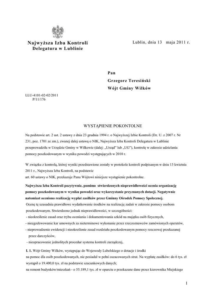 Lublin, dnia 13 maja 2011 r. Najwyższa Izba Kontroli Delegatura w Lublinie Pan Grzegorz Teresiński Wójt Gminy Wilków LLU-4101-02-02/2011 P/11/176 WYSTĄPIENIE POKONTOLNE Na podstawie art. 2 ust. 2 ustawy z dnia 23 grudnia 1994 r. o Najwyższej Izbie Kontroli (Dz. U. z 2007 r. Nr 231, poz. 1701 ze zm.), zwanej dalej ustawą o NIK, Najwyższa Izba Kontroli Delegatura w Lublinie przeprowadziła w Urzędzie Gminy w Wilkowie (dalej: „Urząd” lub „UG”), kontrolę w zakresie udzielania pomocy poszkodowanym w wyniku powodzi występujących w 2010 r. W związku z kontrolą, której wyniki przedstawione zostały w protokole kontroli podpisanym w dniu 13 kwietnia 2011 r., Najwyższa Izba Kontroli, na podstawie art. 60 ustawy o NIK, przekazuje Panu Wójtowi niniejsze wystąpienie pokontrolne. Najwyższa Izba Kontroli pozytywnie, pomimo stwierdzonych nieprawidłowości ocenia organizację pomocy poszkodowanym w wyniku powodzi oraz wykorzystanie przyznanych dotacji. Negatywnie natomiast oceniono realizację wypłat zasiłków przez Gminny Ośrodek Pomocy Społecznej. Ocenę tę uzasadnia prawidłowe wydatkowanie środków na realizację zadań w zakresie pomocy osobom poszkodowanym. Stwierdzono jednak nieprawidłowości, w szczególności: - nieokreślenie zasad oraz trybu oceniania i dokumentowania szkód na majątku osób fizycznych, - nieegzekwowanie kar umownych za nieterminowe wykonanie przez rzeczoznawców zamówionych operatów, - nieprowadzenie ewidencji i nieokreślenie zasad rozdziału poszkodowanym pomocy rzeczowej przekazanej przez darczyńców, - nieopracowanie jednolitych procedur systemu kontroli zarządczej, I. 1. Wójt Gminy Wilków, występując do Wojewody Lubelskiego o dotacje i środki na pomoc dla osób poszkodowanych, nie posiadał w pełni oszacowanych strat. Na wypłatę zasiłków: do 6 tys. zł wystąpił o 19.400,0 tys. zł na podstawie szacunkowych danych; na remont budynków/mieszkań - o 55.189,1 tys. zł w oparciu o przekazane dane przez kierownika Miejskiego 1 Ośrodka Pomocy Społecznej (MOPS) w Opolu Lubelskim (jednostka ta udzielała pomocy w zakresie przyjmowania wniosków, sporządzania wywiadów, opisów uszkodzeń i list uszkodzonych budynków); na zasiłki wspierające rodziny rolnicze i zasiłki na cele edukacyjne - o: 987,0 tys. zł i 647,0 tys. zł na podstawie złożonych wniosków. Na sfinansowanie kosztów wycen kosztorysowych szkód w budynkach wystąpiono o kwotę 586,0 tys. zł w oparciu o złożone wnioski i listy uszkodzonych budynków, a na wynajem kontenerów i mieszkań - o 1.955,0 tys. zł, tj. kwotę wynikającą z zawartej umowy na wynajem kontenerów i w oparciu o przedłożone przez poszkodowanych umowy wynajmu mieszkań. Łącznie wnioskowano o 78.764,1 tys. zł, a otrzymano 68.354,1 tys. zł (tj. 86,8% kwoty wnioskowanej), z czego wykorzystano 67.240,4 tys. zł (tj. 98,3%). Z przekazanych, na podstawie decyzji Wojewody Lubelskiego, środków w 2010 r., do dnia 31 grudnia 2010 r.: - w rozdziale 85415 z otrzymanej kwoty 647,0 tys. zł wykorzystano 599,0 tys. zł (92,6%) na zasiłki powodziowe na cele edukacyjne. Nie wypłacono zasiłków 48 uczniom niespełniającym kryteriów ich przyznania, - w rozdziale 70078 z otrzymanej kwoty 1.448,7 tys. zł wykorzystano 1.402,9 zł (96,8%) na sfinansowanie kosztów wynajmu mieszkań i kontenerów, - w rozdziale 75478 z otrzymanej kwoty 584,4 tys. zł wydatkowano 529,2 zł (90,6%) na sfinansowanie kosztów prac rzeczoznawców majątkowych, - w rozdziale 85278 z otrzymanej kwoty 64.727,0 tys. zł wydatkowano 64.709,3 tys. zł (99,9%) na wypłatę zasiłków celowych dla osób i rodzin poszkodowanych w wyniku powodzi w tym: 10.075,5 tys. zł na wypłatę zasiłków do 6 tys. zł (po I i II fali powodziowej), 54.633,8 tys. zł na wypłatę zasiłków na remont/odbudowę budynków. W 2010 r. niewykorzystano otrzymanych 987,0 tys. zł (rozdział 85295, § 201) na wypłatę zasiłków dla rodzin rolniczych. Wójt Gminy przekazał 28 października 2010 r. środki na realizację tego zadania do OPS, jednak Kierownik OPS wystąpił do Wydziału Polityki Społecznej LUW o przeniesienie tego zadania na 2011 r. uzasadniając to brakiem możliwości wykorzystania tych środków do końca 2010 r. Do czasu zakończenia kontroli Gmina nie zrefundowała 92 poszkodowanym powodzianom, kosztów wynajmu mieszkań za okres I – III 2011 r. w wysokości 287,3 tys. zł ze względu na brak środków. Decyzją budżetową Wojewody Lubelskiego Nr 10 z dnia 23 marca 2011 r. przyznano na ten cel dotację w kwocie 287,3 tys. zł. Otrzymane dotacje zostały rozliczone zgodnie z art. 150 pkt 5 i 168 ust. 1 ustawy z dnia 27 sierpnia 2009 r. o finansach publicznych (Dz. U. Nr 157, poz. 1240 ze zm.), tj. do końca roku budżetowego 2010, a dotacje na pokrycie kosztów wynajmu kontenerów i mieszkań dla poszkodowanych - w terminie określonym w zawartej umowie z Wojewodą Lubelskim, tj. do 15 stycznia 2011 r. 2. Środki przekazane Gminie Wilków przez darczyńców spoza sektora finansów publicznych, w kwocie 3.777,9 tys. zł. gromadzono na wyodrębnionym rachunku bankowym dochodów własnych na podstawie uchwały nr L/160/2010 Rady Gminy Wilków z dnia 16 lipca 2010 r. Wydatkowano je na cele określone przez darczyńców 2 oraz zgodnie zasadami ustalonymi zarządzeniem nr 48/10 z dnia 29 lipca 2010 r. przez Wójta Gminy. Do dnia 2 marca 2011 r. wypłacono zapomogi dla 3.180 osób po 1.170 zł, do wykorzystania pozostało 45.363 zł. 3. Stwierdzono nieegzekwowanie przez Wójta Gminy kar umownych za nieterminowe wykonanie przez rzeczoznawców zamówionych operatów. Na 882 sporządzone operaty, 124 (14,1%) zostały przekazane z opóźnieniem wynoszącym od 1 do 19 dni w stosunku do terminów określonych w umowach. Należne z tego tytułu kary wynosiły 34,5 tys. zł. Uwagi NIK dotyczą również: - nieuwzględnienia w gminnym planie zarządzania kryzysowego zasad oraz trybu oceniania i dokumentowania szkód, co naruszało pr