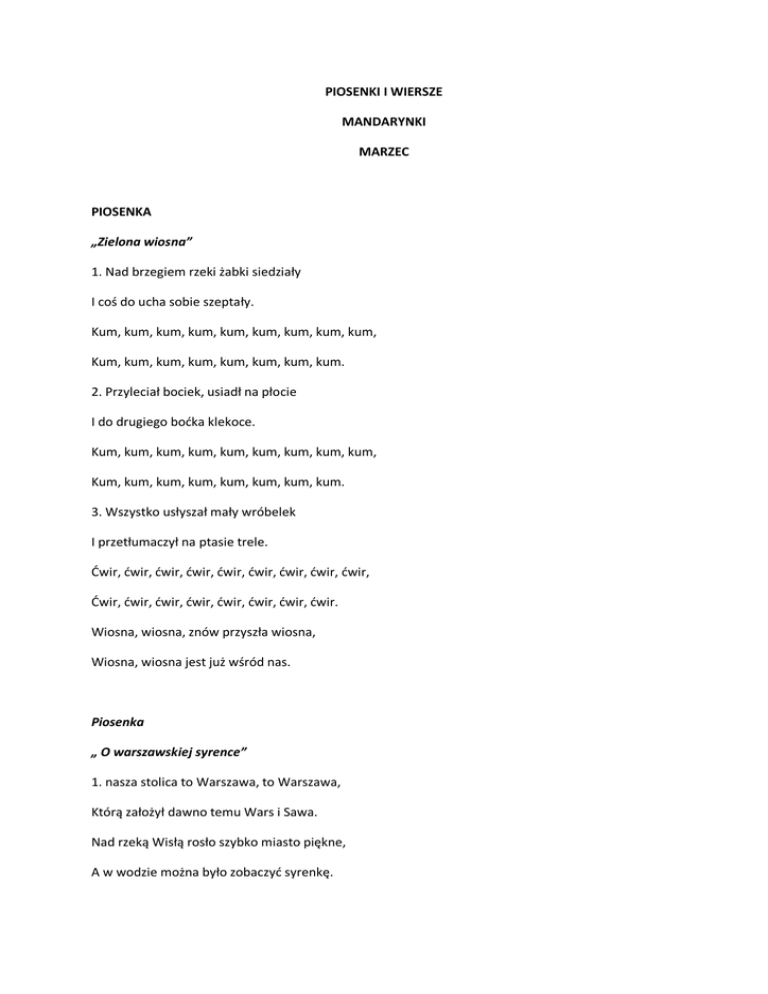 PIOSENKI I WIERSZE MANDARYNKI MARZEC PIOSENKA „Zielona wiosna” 1. Nad brzegiem rzeki żabki siedziały I coś do ucha sobie szeptały. Kum, kum, kum, kum, kum, kum, kum, kum, kum, Kum, kum, kum, kum, kum, kum, kum, kum. 2. Przyleciał bociek, usiadł na płocie I do drugiego boćka klekoce. Kum, kum, kum, kum, kum, kum, kum, kum, kum, Kum, kum, kum, kum, kum, kum, kum, kum. 3. Wszystko usłyszał mały wróbelek I przetłumaczył na ptasie trele. Ćwir, ćwir, ćwir, ćwir, ćwir, ćwir, ćwir, ćwir, ćwir, Ćwir, ćwir, ćwir, ćwir, ćwir, ćwir, ćwir, ćwir. Wiosna, wiosna, znów przyszła wiosna, Wiosna, wiosna jest już wśród nas. Piosenka „ O warszawskiej syrence” 1. nasza stolica to Warszawa, to Warszawa, Którą założył dawno temu Wars i Sawa. Nad rzeką Wisłą rosło szybko miasto piękne, A w wodzie można było zobaczyć syrenkę. Ref. Syrenka, warszawska syrenka, To pół ryba, pół kobieta bardzo piękna. W swoim ręku trzyma mocno ostry miecz, By stolicy naszej strzec. 2. Nasza stolica to Warszawa, to Warszawa, Którą założył dawno temu Wars i Sawa. Coraz piękniejsze miasto, z bardzo dużym wdziękiem, A w wodzie nadal można zobaczyć syrenkę. Wiersz „Idzie wiosna” Wiosna jest już całkiem blisko. Idzie z koszem i walizką. A z koszyka i z walizki, Wyglądają świeże listki. I wystawił nos tulipan, Ciągle Wiosnę o coś pyta - nie nudź! – mówi Wiosna krótko - zaraz znajdziesz się w ogródku! Wiersz „Barwy ojczyste” Powiewa flaga, gdy wiatr się zerwie. A na tej fladze biel jest i czerwień. Czerwień to miłość, biel- serce czyste Piękne są nasze barwy ojczyste.