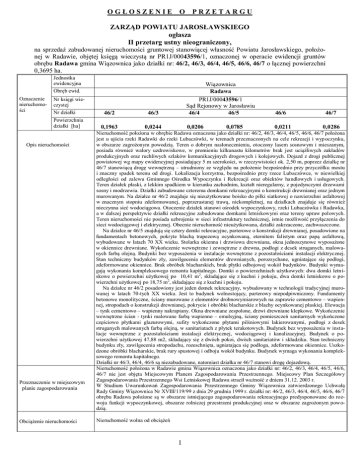 OGŁOSZENIE O PRZETARGU ZARZĄD POWIATU JAROSŁAWSKIEGO ogłasza II przetarg ustny nieograniczony, na sprzedaż zabudowanej nieruchomości gruntowej stanowiącej własność Powiatu Jarosławskiego, położonej w Radawie, objętej księgą wieczystą nr PR1J/00043596/1, oznaczonej w operacie ewidencji gruntów obrębu Radawa gmina Wiązownica jako działki nr: 46/2, 46/3, 46/4, 46/5, 46/6, 46/7 o łącznej powierzchni 0,3695 ha. Jednostka ewidencyjna Obręb ewid. Oznaczenie nieruchomości Nr księgi wieczystej Nr działki Powierzchnia działki [ha] Opis nieruchomości Przeznaczenie w miejscowym planie zagospodarowania Obciążenie nieruchomości 46/2 46/3 0,1963 0,0244 Wiązownica Radawa PR1J/00043596/1 Sąd Rejonowy w Jarosławiu 46/4 46/5 46/6 0,0206 0,0211 0,0785 46/7 0,0286 Nieruchomość położona w obrębie Radawa oznaczona jako działki nr: 46/2, 46/3, 46/4, 46/5, 46/6, 46/7 położona jest u ujścia rzeki Radawki do rzeki Lubaczówki, w terenach przeznaczonych na cele rekreacji i wyp oczynku, w obszarze zagrożonym powodzią. Teren o dobrym nasłonecznieniu, otoczony lasem sosnowym i mieszanym, posiada również walory uzdrowiskowe, w promieniu kilkunastu kilometrów brak jest uciążliwych zakładów produkcyjnych oraz ruchliwych szlaków komunikacyjnych drogowych i kolejowych. Dojazd z drogi publicznej powiatowej wg mapy ewidencyjnej posiadający 5 m szerokości, w rzeczywistości ok. 2,50 m, poprzez działkę nr 46/7 stanowiącą drogę wewnętrzną – utrudniony ze względu na położenie bezpośrednio przy przyczółku mostu i znaczny spadek terenu od drogi. Lokalizacja korzystna, bezpośrednio przy rzece Lubaczówce, w niewielkiej odległości od zalewu Gminnego Ośrodka Wypoczynku i Rekreacji oraz obiektów handlowych i usługowych. Teren działek płaski, z lekkim spadkiem w kierunku zachodnim, kształt nieregularny, z pojedynczymi drzewami sosny i modrzewia. Działki zabudowane czterema domkami rekreacyjnymi o konstrukcji drewnianej oraz jednym murowanym. Na działce nr 46/2 znajduje się nieużytkowane boisko do piłki siatkowej o nawierzchni asfaltowej w znacznym stopniu zdeformowanej, poprzerastanej trawą, niekompletnej, na działkach znajduje się również nieczynna sieć wodociągowa. Otoczenie działek stanowi ośrodek wypoczynkowy, rzeki Lubaczówka i Radawka, a w dalszej perspektywie działki rekreacyjne zabudowane domkami letniskowymi oraz tereny upraw polowych. Teren nieruchomości nie posiada uzbrojenia w sieci infrastruktury technicznej, istnie możliwość przyłączenia do sieci wodociągowej i elektrycznej. Obecnie nieruchomość nieużytkowana, działki zakrzaczone, zachwaszczone. Na działce nr 46/5 znajdują się cztery domki rekreacyjne, parterowe o konstrukcji drewnianej, posadowione na fundamentach betonowych, pokryte blachą trapezową ocynkowaną, eternitem falistym oraz papą asfaltową, wybudowane w latach 70 XX wieku. Stolarka okienna i drzwiowa drewniana, okna jednoszynowe wyposażone w okiennice drewniane. Wykończenie wewnętrzne i zewnętrzne z drewna, podłogi z desek struganych, malowanych farbą olejną. Budynki bez wyposażenia w instalacje wewnętrzne z pozostałościami instalacji elektrycznej. Stan techniczny budynków zły, zawilgocenia elementów drewnianych, porozsychane, ugniatające się podłogi, zdeformowane okiennice. Brak obróbek blacharskich, brak płytki odbojowej wokół budynków. Budynki wymagają wykonania kompleksowego remontu kapitalnego. Domki o powierzchniach użytkowych: dwa domki letniskowe o powierzchni użytkowej po 10,41 m2, składające się z kuchni i pokoju, dwa domki letniskowe o powierzchni użytkowej po 18,75 m2, składające się z kuchni i pokoju. Na działce nr 46/2 posadowiony jest jeden domek rekreacyjny, wybudowany w technologii tradycyjnej murowanej w latach 70-tych XX wieku. Jest to budynek wolnostojący, parterowy niepodpiwniczony. Fundamenty betonowe monolityczne, ściany murowane z elementów drobnowymiarowych na zaprawie cementowo – wapiennej, stropodach o konstrukcji drewnianej, pokrycie i obróbki blacharskie z blachy ocynkowanej płaskiej. Elewacja – tynk cementowo – wapienny nakrapiany. Okna drewniane zespolone, drzwi drewniane klepkowe. Wykończenie wewnętrzne ścian - tynki malowane farbą wapienno – emulsyjną, ściany pomieszczeń sanitarnych wykończone częściowo płytkami glazurowymi, sufity wykończone płytami pilśniowymi lakierowanymi, podłogi z desek struganych malowanych farbą olejną, w sanitariatach z płytek terakotowych. Budynek bez wyposażenia w instalacje wewnętrzne z pozostałościami instalacji elektrycznej, wodociągowej i kanalizacyjnej. Budynek o powierzchni użytkowej 47,88 m2, składający się z dwóch pokoi, dwóch sanitariatów i składziku. Stan techniczny budynku zły, zawilgocenia stropodachu, rozeschnięta, ugniatająca się podłoga, zdeformowane okiennice. Uszkodzone obróbki blacharskie, brak rury spustowej i odboju wokół budynku. Budynek wymaga wykonania kompleksowego remontu kapitalnego. Działki nr 46/3, 46/4, 46/6 są niezabudowane, natomiast działka nr 46/7 stanowi drogę dojazdową. Nieruchomość położona w Radawie gmina Wiązownica oznaczona jako działki nr: 46/2, 46/3, 46/4, 46/5, 46/6, 46/7 nie jest objęta Miejscowym Planem Zagospodarowania Przestrzennego. Miejscowy Plan Szczegółowy Zagospodarowania Przestrzennego Wsi Letniskowej Radawa stracił ważność z dniem 31.12. 2003 r. W Studium Uwarunkowań Zagospodarowania Przestrzennego Gminy Wiązownica zatwierdzonego Uchwałą Rady Gminy Wiązownica Nr XVIII/119/99 z dnia 29 grudnia 1999 r. działki nr: 46/2, 46/3, 46/4, 46/5, 46/6, 46/7 obrębu Radawa położone są w obszarze istniejącego zagospodarowania rekreacyjnego predysponowane do rozwoju funkcji wypoczynkowej, obszarze rolniczej przestrzeni produkcyjnej oraz w obszarze zagrożonym powodzią. Nieruchomość wolna od obciążeń 1 Cena wywoławcza nieruchomości w PLN (brutto) 130 000,00 I. Czas i miejsce przet