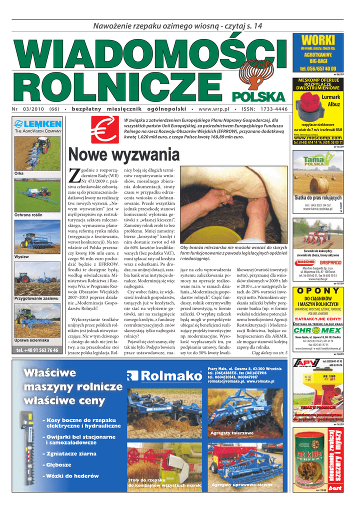 Nawożenie rzepaku ozimego wiosną - czytaj s. 14 wr-062/09 MESKOMP OFERUJE ROZPYLACZE DWUSTRUMIENIOWE Nr 03/2010 (66) • bezpłatny miesięcznik ogólnopolski • www.wrp.pl • ISSN: 1733-4446 W związku z zatwierdzeniem Europejskiego Planu Naprawy Gospodarczej, dla wszystkich państw Unii Europejskiej, za pośrednictwem Europejskiego Funduszu Rolnego na rzecz Rozwoju Obszarów Wiejskich (EFRROW), przyznano dodatkową kwotę 1,020 mld euro, z czego Polsce kwotę 168,89 mln euro. Lurmark Albuz rozpylacze eżektorowe na wiatr do 7 m/s i rozlewaki RSM Nowe wyzwania /CHRONAROyLIN 7YSIEW 0RZYGOTOWANIEZASIEWU 5PRAWAyCIERNISKA tel. +48 91 563 76 46 Z godnie z rozporządzeniem Rady (WE) Nr 473/2009 r. państwa członkowskie zobowiązane są do przeznaczenia dodatkowej kwoty na realizację tzw. nowych wyzwań. „Nowym wyzwaniem” jest w myśl przepisów np. restrukturyzacja sektora mleczarskiego, wymuszona planowaną reformą rynku mleka (rezygnacja z kwotowania, wzrost konkurencji). Na ten właśnie cel Polska przeznaczy kwotę 106 mln euro, z czego 96 mln euro pochodzić będzie z EFRROW. Środki te dostępne będą, według oświadczenia Ministerstwa Rolnictwa i Rozwoju Wsi, w Programie Rozwoju Obszarów Wiejskich 2007–2013 poprzez działanie „Modernizacja Gospodarstw Rolnych”. Wykorzystanie środków unijnych przez polskich rolników jest jednak niewystarczające. Nic w tym dziwnego – dostęp do nich nie jest łatwy, a na przeszkodzie stoi jeszcze polska legislacja. Rol- nicy boją się długich terminów rozpatrywania wniosków, mozolnego zbierania dokumentacji, straty czasu w przypadku odrzucenia wniosku o dofinansowanie. Przede wszystkim jednak przeszkodę stanowi konieczność wyłożenia gotówki z „własnej kieszeni”. Zamożny rolnik zrobi to bez problemu. Mniej zamożny: bierze „korzystny” kredyt i nim dostanie zwrot od 40 do 60% kosztów kwalifikowanych (bez podatku VAT), musi spłacać raty od kredytu wraz z odsetkami. Po drodze, na unijnej dotacji, zarabia bank oraz instytucje doradcze. Modernizują się więc najbogatsi. Czy wobec faktu, że większość średnich gospodarstw, tonących już w kredytach, nie stać na wyłożenie gotówki, ani na zaciągnięcie nowego kredytu, z funduszy restrukturyzacyjnych znów skorzystają tylko najbogatsi rolnicy? Pojawił się cień szansy, aby tak nie było. Podjęto bowiem prace ustawodawcze, ma- wr-138/09 /RKA wr-165/09 Oby branża mleczarska nie musiała wracać do starych form funkcjonowania z powodu legislacyjnych opóźnień i niedociągnięć. jące na celu wprowadzenia systemu zaliczkowania pomocy na operacje realizowane m.in. w ramach działania „Modernizacja gospodarstw rolnych”. Część funduszy, rolnik otrzymywałby przed inwestycją, w formie zaliczki. O wypłatę zaliczek będą mogli w perspektywie ubiegać się beneficjenci realizujący projekty inwestycyjne np. modernizacyjne. Wysokość wypłacanych im, po podpisaniu umowy, funduszy to: do 50% kwoty kwali- fikowanej (wartość inwestycji netto), przyznanej dla wniosków złożonych w 2009 r. lub w 2010 r., a w następnych latach do 20% wartości inwestycji netto. Warunkiem uzyskania zaliczki byłoby poręczenie banku (np. w formie weksla) udzielone potencjalnemu beneficjentowi Agencji Restrukturyzacji i Modernizacji Rolnictwa, będące zabezpieczeniem dla ARiMR, ale mogące stanowić kolejną zaporę dla rolnika. Ciąg dalszy na str. 5 Siewniki do kukurydzy, siewniki do zboża, brony aktywne Maschio-Gaspardo Sp. z o.o. ul. Wapienna 6/8, 87-100 Toruń tel. 56 650 60 51, fax 56 650 50 53 www.maschio.pl wr-197/09 OPONY DO CIĄGNIKÓW I MASZYN ROLNICZYCH UKRAIŃSKIE, ROSYJSKIE, CZESKIE, TURECKIE, POLSKIE, CHIŃSKIE !!!ATRAKCYJNE CENY!!! Dostawa na terenie całego kraju Nowe Opole, ul. Lipowa 18, 08-103 Siedlce tel.: (025) 631 56 23, 631 61 70 • fax: (025) 631 57 55 www.chromex.pl • e-mail: [email protected] wr-168/09 tel. (059)841 41 93 668 224 676 TERAZ W PROMOCJI! Rozsiewacze pneumatyczne do poplonów i podsiewu traw wr-162/09 wr-153/08