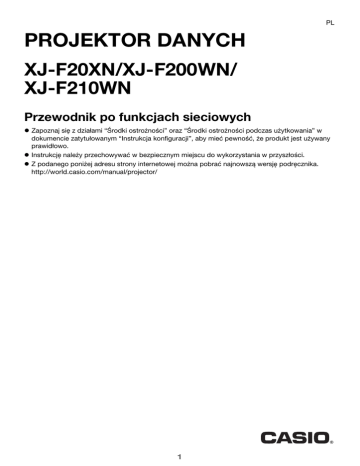 PL PROJEKTOR DANYCH XJ-F20XN/XJ-F200WN/ XJ-F210WN Przewodnik po funkcjach sieciowych z Zapoznaj się z działami “Środki ostrożności” oraz “Środki ostrożności podczas użytkowania” w dokumencie zatytułowanym “Instrukcja konfiguracji”, aby mieć pewność, że produkt jest używany prawidłowo. z Instrukcję należy przechowywać w bezpiecznym miejscu do wykorzystania w przyszłości. z Z podanego poniżej adresu strony internetowej można pobrać najnowszą wersję podręcznika. http://world.casio.com/manual/projector/ 1 z DLP jest zastrzeżonym znakiem towarowym Texas Instruments w Stanach Zjednoczonych. z Microsoft, Windows i Windows Vista są zastrzeżonymi znakami towarowymi lub znakami towarowymi Microsoft Corporation w Stanach Zjednoczonych i w innych krajach. z HDMI, logo HDMI oraz High-Definition Multimedia Interface są znakami towarowymi lub zastrzeżonymi znakami towarowymi HDMI Licensing, LLC. z Mac OS jest znakiem towarowym lub zastrzeżonym znakiem towarowym Apple, Inc. w Stanach Zjednoczonych i w innych krajach. z XGA jest zastrzeżonym znakiem towarowym IBM Corporation w Stanach Zjednoczonych. z PJLink jest znakiem towarowym oczekującym na zastrzeżenie lub zastrzeżonym znakiem towarowym w Japonii, Stanach Zjednoczonych oraz w innych krajach i na innych obszarach. z Crestron jest zastrzeżonym znakiem towarowym Crestron Electronics, Inc. w Stanach Zjednoczonych. z AMX jest zastrzeżonym znakiem towarowym AMX LLC w Stanach Zjednoczonych. z Android jest znakiem towarowym lub zastrzeżonym znakiem towarowym Google Inc. z Inne nazwy firm i produktów mogą być zastrzeżonymi znakami towarowymi lub znakami towarowymi odpowiednich właścicieli. z Niektóre elementy tego produktu są częściowo oparte na pracach zespołu Independent JPEG Group. z Treść niniejszej Instrukcji Obsługi może ulec zmianie bez uprzedniego powiadomienia. z Kopiowanie niniejszego podręcznika, we fragmentach lub w całości, jest zakazane. Podręcznik można wykorzystywać wyłącznie do osobistego użytku. Inne wykorzystanie jest zakazane bez uprzedniej zgody CASIO COMPUTER CO., LTD. z CASIO COMPUTER CO., LTD. nie ponosi odpowiedzialności za utracone korzyści lub roszczenia stron trzecich, wynikające z używania niniejszego produktu lub podręcznika. z CASIO COMPUTER CO., LTD. nie ponosi odpowiedzialności za straty lub utracone korzyści związane z utratą danych na skutek wadliwego działania lub obsługi niniejszego produktu, ani z jakiegokolwiek innego powodu. z Przykładowe ekrany w niniejszym podręczniku zamieszczono wyłącznie w celach instruktażowych i mogą się one różnić od rzeczywistych ekranów. z Wszelkie zrzuty ekranu zamieszczone w tym podręczniku pochodzą z wersji angielskiej. Niektóre z terminów używanych w wyjaśnieniach także są oparte na zrzutach ekranu w wersji angielskiej. 2 Spis treści Przegląd funkcji sieciowych .......................................... 7 Co można uzyskać dzięki funkcjom sieciowym... ..................................7 Oprogramowanie konieczne do korzystania z funkcji sieciowych .........8 Zakres zawartości niniejszej instrukcji ......................................................................... 8 Projekcja zawartości ekranu komputera przez bezprzewodową sieć LAN.............................................. 9 Przepływ pracy z połączenia LAN do projekcji ......................................9 Podłączanie bezprzewodowej karty sieciowej do projektora...............10 Ustanawianie bezpośredniego połączenia bezprzewodowego LAN pomiędzy projektorem i komputerem ..................................................12 Ogólne informacje o bezprzewodowym połączeniu LAN .......................................... 12 Wykorzystywanie wbudowanego SSID projektora (prostego lub generycznego), aby ustanowić połączenie bezprzewodowe LAN ...................................................... 13 Aby skorzystać z prostego połączenia SSID projektora, aby ustanowić bezprzewodowe połączenie LAN i rozpocząć wyświetlanie...................................... 13 Aby użyć generycznego SSID w celu ustanowienia bezprzewodowego połączenia LAN i rozpoczęcia wyświetlania ............................... 16 Wykorzystywanie SSID użytkownika do ustanowienia bezprzewodowego połączenia LAN .......................................................................... 19 Chcąc utworzyć SSID użytkownika.......................................................................... 20 Aby użyć SSID użytkownika w celu ustanowienia bezprzewodowego połączenia LAN i rozpoczęcia wyświetlania ............................... 23 Połączenie projektora z zewnętrzną siecią bez kończenia bezpośredniego połączenia bezprzewodowego LAN z komputerem ....................... 26 Chcąc podłączyć projektor do bezprzewodowego punktu dostępu LAN bez zamykania bezpośredniego bezprzewodowego połączenia LAN z komputerem ...... 27 Aby ustanowić przewodowe połączenie pomiędzy projektorem i routerem, utrzymując bezpośrednie połączenie bezprzewodowe pomiędzy projektorem i komputerem ............................................................................................................ 29 Ustanawianie połączenia pomiędzy projektorem a komputerem za pośrednictwem bezprzewodowego punktu dostępu LAN ...................30 Przegląd połączenia................................................................................................... 30 Procedury podłączenia .............................................................................................. 31 Aby podłączyć projektor do bezprzewodowego punktu dostępu LAN ..................... 31 Aby ustanowić połączenie pomiędzy projektorem a komputerem i prowadzić projekcję przez bezprzewodowy punkt dostępu LAN ....... 34 3 Podłączanie projektora do komputera za pośrednictwem przewodowej sieci LAN .............................................