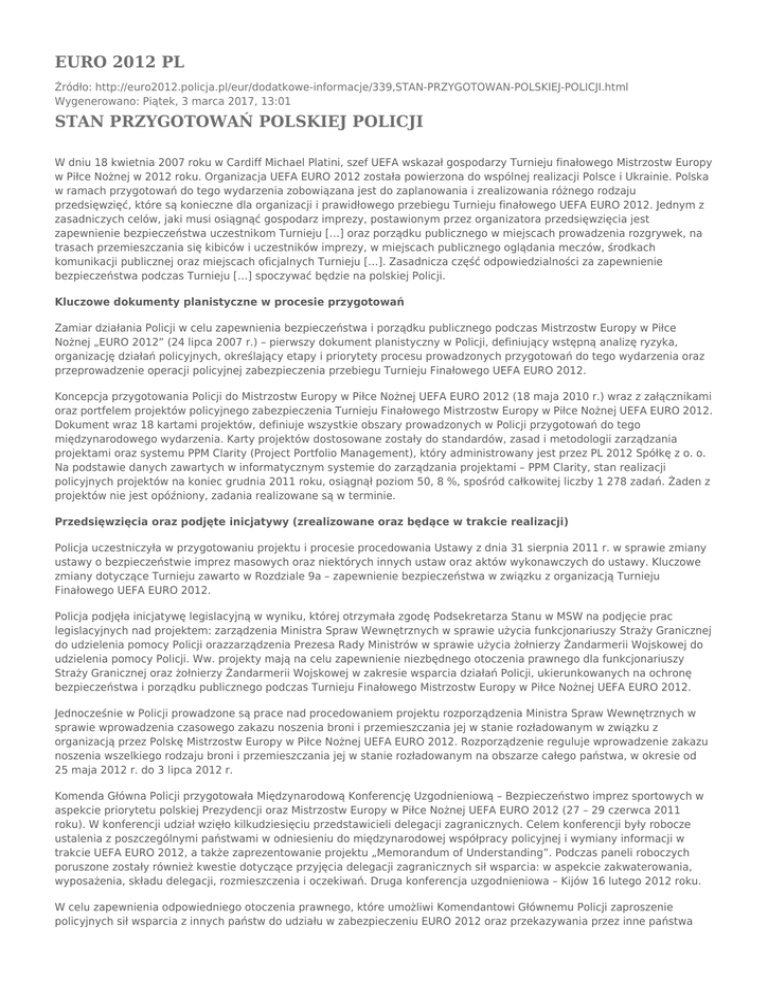 EURO 2012 PL Źródło: http://euro2012.policja.pl/eur/dodatkowe-informacje/339,STAN-PRZYGOTOWAN-POLSKIEJ-POLICJI.html Wygenerowano: Piątek, 3 marca 2017, 13:01 STAN PRZYGOTOWAŃ POLSKIEJ POLICJI W dniu 18 kwietnia 2007 roku w Cardiff Michael Platini, szef UEFA wskazał gospodarzy Turnieju finałowego Mistrzostw Europy w Piłce Nożnej w 2012 roku. Organizacja UEFA EURO 2012 została powierzona do wspólnej realizacji Polsce i Ukrainie. Polska w ramach przygotowań do tego wydarzenia zobowiązana jest do zaplanowania i zrealizowania różnego rodzaju przedsięwzięć, które są konieczne dla organizacji i prawidłowego przebiegu Turnieju finałowego UEFA EURO 2012. Jednym z zasadniczych celów, jaki musi osiągnąć gospodarz imprezy, postawionym przez organizatora przedsięwzięcia jest zapewnienie bezpieczeństwa uczestnikom Turnieju […] oraz porządku publicznego w miejscach prowadzenia rozgrywek, na trasach przemieszczania się kibiców i uczestników imprezy, w miejscach publicznego oglądania meczów, środkach komunikacji publicznej oraz miejscach oficjalnych Turnieju […]. Zasadnicza część odpowiedzialności za zapewnienie bezpieczeństwa podczas Turnieju […] spoczywać będzie na polskiej Policji. Kluczowe dokumenty planistyczne w procesie przygotowań Zamiar działania Policji w celu zapewnienia bezpieczeństwa i porządku publicznego podczas Mistrzostw Europy w Piłce Nożnej „EURO 2012” (24 lipca 2007 r.) – pierwszy dokument planistyczny w Policji, definiujący wstępną analizę ryzyka, organizację działań policyjnych, określający etapy i priorytety procesu prowadzonych przygotowań do tego wydarzenia oraz przeprowadzenie operacji policyjnej zabezpieczenia przebiegu Turnieju Finałowego UEFA EURO 2012. Koncepcja przygotowania Policji do Mistrzostw Europy w Piłce Nożnej UEFA EURO 2012 (18 maja 2010 r.) wraz z załącznikami oraz portfelem projektów policyjnego zabezpieczenia Turnieju Finałowego Mistrzostw Europy w Piłce Nożnej UEFA EURO 2012. Dokument wraz 18 kartami projektów, definiuje wszystkie obszary prowadzonych w Policji przygotowań do tego międzynarodowego wydarzenia. Karty projektów dostosowane zostały do standardów, zasad i metodologii zarządzania projektami oraz systemu PPM Clarity (Project Portfolio Management), który administrowany jest przez PL 2012 Spółkę z o. o. Na podstawie danych zawartych w informatycznym systemie do zarządzania projektami – PPM Clarity, stan realizacji policyjnych projektów na koniec grudnia 2011 roku, osiągnął poziom 50, 8 %, spośród całkowitej liczby 1 278 zadań. Żaden z projektów nie jest opóźniony, zadania realizowane są w terminie. Przedsięwzięcia oraz podjęte inicjatywy (zrealizowane oraz będące w trakcie realizacji) Policja uczestniczyła w przygotowaniu projektu i procesie procedowania Ustawy z dnia 31 sierpnia 2011 r. w sprawie zmiany ustawy o bezpieczeństwie imprez masowych oraz niektórych innych ustaw oraz aktów wykonawczych do ustawy. Kluczowe zmiany dotyczące Turnieju zawarto w Rozdziale 9a – zapewnienie bezpieczeństwa w związku z organizacją Turnieju Finałowego UEFA EURO 2012. Policja podjęła inicjatywę legislacyjną w wyniku, której otrzymała zgodę Podsekretarza Stanu w MSW na podjęcie prac legislacyjnych nad projektem: zarządzenia Ministra Spraw Wewnętrznych w sprawie użycia funkcjonariuszy Straży Granicznej do udzielenia pomocy Policji orazzarządzenia Prezesa Rady Ministrów w sprawie użycia żołnierzy Żandarmerii Wojskowej do udzielenia pomocy Policji. Ww. projekty mają na celu zapewnienie niezbędnego otoczenia prawnego dla funkcjonariuszy Straży Granicznej oraz żołnierzy Żandarmerii Wojskowej w zakresie wsparcia działań Policji, ukierunkowanych na ochronę bezpieczeństwa i porządku publicznego podczas Turnieju Finałowego Mistrzostw Europy w Piłce Nożnej UEFA EURO 2012. Jednocześnie w Policji prowadzone są prace nad procedowaniem projektu rozporządzenia Ministra Spraw Wewnętrznych w sprawie wprowadzenia czasowego zakazu noszenia broni i przemieszczania jej w stanie rozładowanym w związku z organizacją przez Polskę Mistrzostw Europy w Piłce Nożnej UEFA EURO 2012. Rozporządzenie reguluje wprowadzenie zakazu noszenia wszelkiego rodzaju broni i przemieszczania jej w stanie rozładowanym na obszarze całego państwa, w okresie od 25 maja 2012 r. do 3 lipca 2012 r. Komenda Główna Policji przygotowała Międzynarodową Konferencję Uzgodnieniową – Bezpieczeństwo imprez sportowych w aspekcie priorytetu polskiej Prezydencji oraz Mistrzostw Europy w Piłce Nożnej UEFA EURO 2012 (27 – 29 czerwca 2011 roku). W konferencji udział wzięło kilkudziesięciu przedstawicieli delegacji zagranicznych. Celem konferencji były robocze ustalenia z poszczególnymi państwami w odniesieniu do międzynarodowej współpracy policyjnej i wymiany informacji w trakcie UEFA EURO 2012, a także zaprezentowanie projektu „Memorandum of Understanding”. Podczas paneli roboczych poruszone zostały również kwestie dotyczące przyjęcia delegacji zagranicznych sił wsparcia: w aspekcie zakwaterowania, wyposażenia, składu delegacji, rozmieszczenia i oczekiwań. Druga konferencja uzgodnieniowa – Kijów 16 lutego 2012 roku. W celu zapewnienia odpowiedniego otoczenia prawnego, które umożliwi Komendantowi Głównemu Policji zaproszenie policyjnych sił wsparcia z innych państw do udziału w zabezpieczeniu EURO 2012 oraz przekazywania przez inne państwa informacji związanych z bezpieczeństwem tej imprezy sportowej, w Komendzie Głównej Policji opracowany został projekt Wspólnej Deklaracji w sprawie współpracy w zakresie zapewnienia bezpieczeństwa i porządku publicznego w związku z Turniejem Finałowym Mistrzostw Europy w Piłce Nożnej EURO 2012 pomiędzy Ministrem Spraw Wewnętrznych Rzeczypospolitej Polskiej a organem administracji państwowej delegującym na terytorium RP policyjne siły udzielające przedmiotowego wsparci