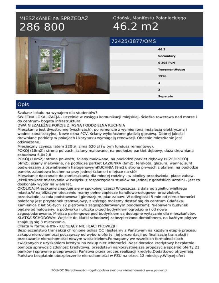 MIESZKANIE na SPRZEDAŻ 286 800 Gdańsk, Manifestu Połanieckiego 46.2 m2 72425/3877/OMS 46.2 Secondary 6 208 PLN TenementHouse 1956 3 2 Separate Opis Szukasz lokalu na wynajem dla studentów? ŚWIETNA LOKALIZACJA - uczelnie w zasięgu komunikacji miejskiej- ścieżka rowerowa nad morze i do centrum- bogata infrastruktura DWA NIEZALEŻNE POKOJE Z JASNĄ I ODDZIELNĄ KUCHNIĄ Mieszkanie jest dwustronne (wsch-zach), po remoncie z wymienioną instalacją elektryczną i wodno–kanalizacyjną. Nowe okna PCV, ściany wykończone gładzią gipsową. Dobrej jakości drewniane parkiety w pokojach i korytarzu wymagają renowacji. Obecnie mieszkanie jest odświeżane. Miesięczny czynsz: latem 320 zł, zimą 520 zł (w tym fundusz remontowy). POKÓJ (18m2): strona pd-zach, ściany malowane, na podłodze parkiet dębowy, duża drewniana zabudowa 5,0x2,8 POKÓJ (10m2): strona pn-wsch, ściany malowane, na podłodze parkiet dębowy PRZEDPOKÓJ (4m2): ściany malowane, na podłodze parkiet ŁAZIENKA (6m2): terakota, glazura, wanna; sufit podwieszany z oświetleniem halogenowymKUCHNIA (9m2): strona pn-wsch z oknem, na podłodze panele, zabudowa kuchenna przy jednej ścianie i miejsce na stół Mieszkanie doskonałe do zamieszkania dla młodej rodziny - w okolicy przedszkola, place zabaw. Jeżeli szukasz mieszkania w związku z rozpoczęciem studiów na jednej z gdańskich uczelni - jest to doskonały wybór na wiele lat. OKOLICA: Mieszkanie znajduje się w spokojnej części Wrzeszcza, z dala od zgiełku wielkiego miasta.W najbliższym otoczeniu mamy pełne zaplecze handlowo-usługowe oraz żłobek, przedszkole, szkoła podstawowa i gimnazjum, plac zabaw. W odległości 5 min od nieruchomości położony jest przystanek tramwajowy, z którego możemy dostać się do centrum Gdańska. Kamienica z lat 50-tych (2 piętrowa z zagospodarowanym poddaszem): Niebawem budynek będzie odmalowany, a podwórko i uliczka przed budynkiem ogrodzona i od nowa zagospodarowana. Miejsca parkingowe pod budynkiem są dostępne wyłącznie dla mieszkańców. KLATKA SCHODOWA: Wejście do klatki schodowej zabezpieczono domofonem, na każdym piętrze znajdują się 3 mieszkania. Oferta w formule 0% - KUPUJĄCY NIE PŁACI PROWIZJI ! Bezpieczeństwo transakcji chronione polisą OC !Jesteśmy z Państwem na każdym etapie procesu zakupu nieruchomości począwszy od wyboru oferty i jej prezentacji po finalizację transakcji i przekazanie nieruchomości nowym właścicielom.Pomagamy we wszelkich formalnościach związanych z uzyskaniem kredytu na zakup nieruchomości. Nasz doradca kredytowy bezpłatnie pomoże sprawdzić zdolność kredytową, przedstawi najkorzystniejszą propozycję spośród oferty 21 banków i sprawnie przeprowadzi Państwa przez proces realizacji kredytu.Dodatkowo otrzymają Państwo bezpłatnie ubezpieczenie nieruchomości w PZU na okres 12 miesięcy.Więcej ofert PÓŁNOC Nieruchomości - ogólnopolska sieć biur nieruchomości www.polnoc.pl znajdziesz na naszej stronie www.polnoc.pl* UWAGA! Zamieszczone na naszych stronach oferty nie stanowią oferty w rozumieniu Kodeksu Cywilnego, a dane w nich zawarte mają jedynie charakter informacyjny.Gorąco polecam i zapraszam na prezentację Więcej ofert znajdziesz na naszej stronie www.polnoc.pl * UWAGA! Zamieszczone na naszych stronach oferty nie stanowią oferty w rozumieniu Kodeksu Cywilnego, a dane w nich zawarte mają jedynie charakter informacyjny. Małgorzata Krzysztofik tel. 530-625-606 email: [email protected] PÓŁNOC Nieruchomości - ogólnopolska sieć biur nieruchomości www.polnoc.pl Powered by TCPDF (www.tcpdf.org)