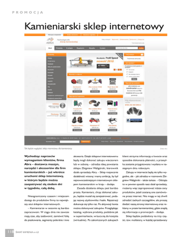 P R OMOCJA Kamieniarski sklep internetowy Tak będzie wyglądać sklep internetowy dla kamieniarzy Wychodząc naprzeciw wymaganiom klientów, firma Abra – dostawca maszyn, narzędzi i akcesoriów dla firm kamieniarskich – już wkrótce uruchomi sklep internetowy, w którym będzie można zaopatrywać się siedem dni w tygodniu, całą dobę. 118 Źródło: Abra akcesoria. Dzięki sklepowi internetowemu klient otrzyma informację o kwocie oraz będą mogli dokonać zakupu wieczorem sposobie dokonania płatności, a przesył- lub w sobotę – zdradza ideę powstania ka zostanie przygotowana i wysłana w na- sklepu Zbigniew Waligórski, kierownik stępnym dniu roboczym. działu sprzedaży Abry. – Sklep rozpocznie Zakupy w internecie będą nie tylko wy- działalność wiosną i mamy ambicję, by był godne, ale – jak zdradza w rozmowie Zbi- najnowocześniejszym internetowym skle- gniew Waligórski – także tańsze. – Odciąża pem kamieniarskim w kraju – dodaje. to w pewien sposób nasz dział sprzedaży, Zasada działania sklepu jest bardzo możemy więc zaproponować niższe ceny prosta. Kamieniarz, chcąc dokonać zaku- produktów, jeżeli zostaną one zamówio- Nieograniczony czasem i miejscem pu, będzie musiał się zarejestrować, poda- ne przez internet. Nie mogę w tej chwili dostęp do produktów firmy to najwięk- jąc nazwę użytkownika i hasło. Rejestracji zdradzić żadnych szczegółów, ale proszę szy atut sklepów internetowych. dokonuje się tylko raz. Po aktywacji konta śledzić naszą stronę internetową oraz re- – Kamieniarze w sezonie są bardzo można dokonywać zakupów. Przeglądając klamy w prasie kamieniarskiej, gdzie znajdą zapracowani. W ciągu dnia nie zawsze katalog, wybrane produkty, podobnie jak się informacje o promocjach – dodaje. mają czas, aby zadzwonić, zamówić folię w supermarkecie, wrzuca się do koszyka Sklep będzie podzielony na trzy czę- do piaskowania, segmenty polerskie i inne (wirtualnie). Po zakończonych zakupach ści, tzw. multistory, w każdej sprzedawany ŚWIAT KAMIENIA nr 63 będzie inny asortyment: maszyny, akcesoria i media, galanteria nagrobna. Obsługiwać będzie wszelkiego rodzaju płatności – od wysyłki za pobraniem poprzez przelewy za pośrednictwem banków internetowych po karty płatnicze. Specjalny moduł będzie również pomagać w zakupach, sugerując inne, komplementarne produkty. – Na przykład jeśli ktoś kupi dyszę do piaskarki, to sklep zasugeruje również szczotkę lub ścierniwo do piaskowania – tłumaczy Waligórski. – Ułatwiony będzie także zakup liter do inskrypcji nagrobnych. Zamiast spisywać ilości zamawianych liter, kupujący może wprowadzić tekst inskrypcji w specjalne okienko, a program sam przeliczy, ile i ja- Sklep będzie podzielony na trzy tzw. multistory, każdy z innym asortymentem Źródło: Abra kie litery zamówić – dodaje. R E K L Sklep będzie również pozwalał na two- jesteśmy jeszcze gotowi do dokonania dziemy musieli ponownie wyszukiwać to- rzenie tzw. list życzeń. To nowatorskie zakupu, możemy wybrać i dodać do listy warów, gdyż będą one widoczne na naszej i bardzo pożyteczne narzędzie w przy- życzeń produkty, które będziemy chcieli liście życzeń. padku sklepów zaopatrujących przez in- kupić w przyszłości. Gdy wrócimy do ta- ternet. Zasada jest następująca: jeśli nie kiego sklepu po miesiącu, dwóch, nie bę- A M A Adam Baran ŚWIAT KAMIENIA nr 63 119
