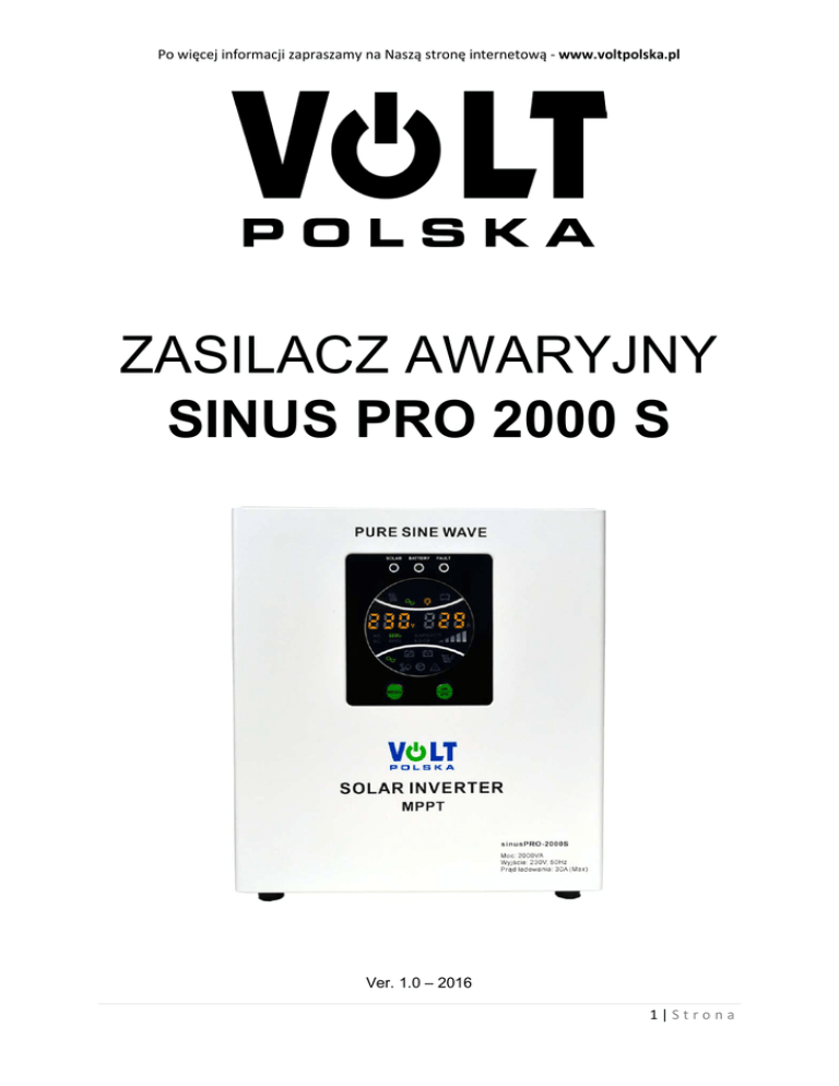 Po więcej informacji zapraszamy na Naszą stronę internetową - www.voltpolska.pl ZASILACZ AWARYJNY SINUS PRO 2000 S Ver. 1.0 – 2016 1|Strona Po więcej informacji zapraszamy na Naszą stronę internetową - www.voltpolska.pl OGÓLNE INFORMACJE DOTYCZĄCE BEZPIECZEŃSTWA INSTRUKCJA JEST INTEGRALNĄ CZĘŚCIĄ URZĄDZEŃ Z SERII POWER SINUS. NIE WYRZUCAJ JEJ, PRZECHOWUJ W ŁATWO DOSTĘPNYM MIEJSCU ORAZ ZAPOZNAJ SIĘ Z JEJ TREŚCIĄ PRZED PIERWSZYM URUCHOMIENIEM URZĄDZENIA. - Nie wystawiać przetwornicy na działanie deszczu, śniegu, kurzu, środków chemicznych, olejów etc. - Nie zakrywać otworów wentylacyjnych. Przetwornica powinna być zainstalowana w łatwo dostępnym miejscu z minimum 30 cm wolnej przestrzeni wokół obudowy w celu zapewnienia swobodnego obiegu powietrza, w przeciwnym wypadku urządzenie może być narażone na przegrzewanie. Minimalna wartość przepływu powietrza to 145 CFM. - Aby zmniejszyć ryzyko pożaru lub porażenia elektrycznego upewnij się, że istniejące okablowanie jest w dobrym stanie, a przewody mają właściwe parametry (przekrój, długość etc.). Nie uruchamiaj przetwornicy z uszkodzonym lub niespełniającym norm okablowaniem. - Urządzenie to zawiera elementy, które mogą powodować iskrzenie. Aby uniknąć pożaru i/lub wybuchu nie należy instalować urządzenia w pomieszczeniach zawierających baterie lub materiały łatwopalne lub w miejscu, w którym znajdują się urządzenia nie mogące mieć kontaktu z ogniem. Obejmuje to wszelkie miejsca w których przechowywane są maszyny zasilane benzyną, zbiorniki na paliwo, łączniki, spoiwa, lub inne połączenia między elementami układu paliwowego. - Nie otwieraj / zdejmuj obudowy z przetwornicy. Urządzenie nie zawiera żadnych części wymagających konserwacji. Próba naprawy może doprowadzić do porażenia prądem lub pożaru. Kondensatory wewnątrz urządzenia pozostają naładowane po odłączeniu zasilania. - Aby zmniejszyć ryzyko porażenia prądem elektrycznym, należy odłączyć zarówno zasilanie od strony AC jak i DC przed przystąpieniem do konserwacji lub czyszczenia. Wyłączanie urządzenia za pomocą przycisku nie zmniejsza ryzyka. - Wyjściowa część okablowania AC w żadnym wypadku nie powinna być podłączona do sieci albo generatora. Takie podłączenie może spowodować uszkodzenia większe niż zwarcie w obwodzie. Wyjście AC przetwornicy pod żadnym pozorem nie może być podłączone do wejścia AC. W szczególności, należy pamiętać, że przetwornica nie powinna być używana do zasilania systemów podtrzymania życia bądź innego sprzętu medycznego. Nie dajemy gwarancji na poprawna pracę przetwornicy wraz z takimi typami urządzeń, w takim układzie używasz jej tylko na własne ryzyko. - Aby zmniejszyć ryzyko obrażeń, należy ładować tylko akumulatory opisane w sekcji TYP AKUMULATORA. 2|Strona Po więcej informacji zapraszamy na Naszą stronę internetową - www.voltpolska.pl PODSTAWOWE INFORMACJE NA TEMAT FUNKCJONALNOŚCI Zasilacz awaryjny sinusPRO 2000 S 24V to kombinacja przetwornicy sieciowej 230V o czystym sinusoidalnym przebiegu napięcia wyjściowego, ładowarki solarnej MPPT oraz modułu UPS wraz z ładowarką sieciową. Urządzenie jest wyposażone w przełączniki umożliwiające wyłączenie lub włączenie ładowarki sieciowej oraz zmianę priorytetu pracy zasilacza (AC / SOLAR). Podstawowe informacje: - czysty sinusoidalny sygnał wyjściowy, dzięki czemu zasilacz jest kompatybilny z m.in.: lodówkami, zamrażalkami, farelkami, telewizorami, lampami fluorescencyjnymi, świetlówkami etc. - budowa oparta o wydajny transformator toroidalny - podwójna kontrola pracy głównego procesora - ładowarka(regulator) solarna MPPT o bardzo wysokiej wydajności - szeroki zakres częstotliwości wejściowej, automatyczne wykrywanie 50/60 Hz - inteligentne przełączanie pomiędzy priorytetami pracy zasilacza w celu uzyskania lepszej wydajności i mniejszych strat w energii - pełen zakres zabezpieczeń i alarmów: przeciążenie, zwarcie, zabezpieczenia nad i pod napięciowe, temperaturowe - łatwy w obsłudze wyświetlacz zapewniający podgląd najważniejszych funkcji 3|Strona Po więcej informacji zapraszamy na Naszą stronę internetową - www.voltpolska.pl SCHEMATY URZĄDZENIA I PODŁĄCZEŃ 4|Strona Po więcej informacji zapraszamy na Naszą stronę internetową - www.voltpolska.pl 5|Strona Po więcej informacji zapraszamy na Naszą stronę internetową - www.voltpolska.pl PODŁĄCZANIE ZASILACZA: 1. Otwórz karton i sprawdź, czy wszystkie elementy są w zestawie, a urządzenie jest nieuszkodzone. Odłącz kabel sieciowy od urządzenia. 2. Podłącz poprawnie akumulator do urządzenia, zgodnie z poprawną polaryzacją + -. 3. Podłącz poprawnie zestaw paneli fotowoltaicznych do urządzenia, zgodnie z poprawną polaryzacją + -. 4. Wybierz odpowiedni priorytet pracy zasilacza. Przy podłączonych panelach wybierz SOLAR PRIORITY, w przeciwnym wypadku wybierz AC PRIORITY. 5. Uruchom urządzenie za pomocą przycisku ON/OFF (przytrzymaj 5s do usłyszenia sygnału dźwiękowego) i podłącz wtyczkę do sieci. 6. Przełącz stycznik uruchamiający ładowanie z paneli fotowoltaicznych na boku urządzenia w pozycje ON. 7. Podłącz wszystkie urządzenia, które chcesz używać z zasilaczem, upewnij się, że są wyłączone i po podłączeniu uruchom je jedno po drugim. PODŁĄCZANIE ZASILACZA: 1. 2. 3. 4. 5. Wyłącz po kolei podłączone do zasilacza urządzenia Przytrzymaj wyłącznik na zasilaczu przez 3 sekund, aby odłączyć wyjście zasilacza. Odłącz kabel sieciowy Wyłącz stycznik od paneli oraz od akumulatorów Odłącz akumulatory oraz zestaw paneli fotowoltaicznych UWAGI: 1. Uważaj przy podłączeniu paneli oraz akumulatora, napięcie wytworzone podczas odwrotnej polaryzacji połączenia może uszkodzić zasilacz. 2. Pamiętaj o poprawnym uziemieniu instalacji. 3. Nie przeciążaj urządzenia powyżej jego mocy nominaln