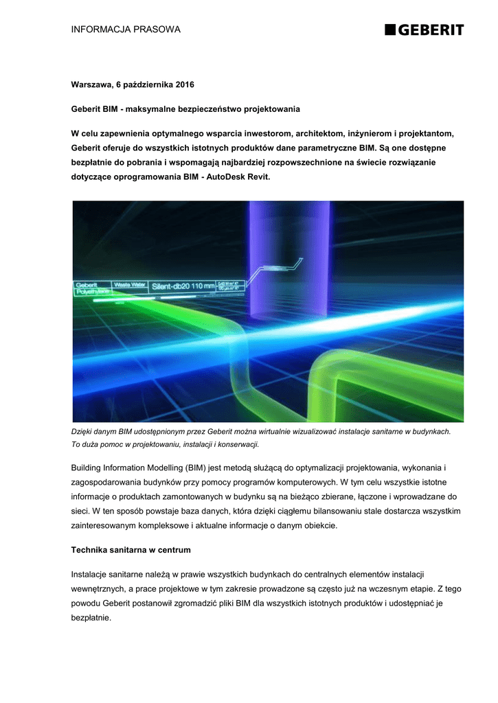 INFORMACJA PRASOWA Warszawa, 6 października 2016 Geberit BIM - maksymalne bezpieczeństwo projektowania W celu zapewnienia optymalnego wsparcia inwestorom, architektom, inżynierom i projektantom, Geberit oferuje do wszystkich istotnych produktów dane parametryczne BIM. Są one dostępne bezpłatnie do pobrania i wspomagają najbardziej rozpowszechnione na świecie rozwiązanie dotyczące oprogramowania BIM - AutoDesk Revit. Dzięki danym BIM udostępnionym przez Geberit można wirtualnie wizualizować instalacje sanitarne w budynkach. To duża pomoc w projektowaniu, instalacji i konserwacji. Building Information Modelling (BIM) jest metodą służącą do optymalizacji projektowania, wykonania i zagospodarowania budynków przy pomocy programów komputerowych. W tym celu wszystkie istotne informacje o produktach zamontowanych w budynku są na bieżąco zbierane, łączone i wprowadzane do sieci. W ten sposób powstaje baza danych, która dzięki ciągłemu bilansowaniu stale dostarcza wszystkim zainteresowanym kompleksowe i aktualne informacje o danym obiekcie. Technika sanitarna w centrum Instalacje sanitarne należą w prawie wszystkich budynkach do centralnych elementów instalacji wewnętrznych, a prace projektowe w tym zakresie prowadzone są często już na wczesnym etapie. Z tego powodu Geberit postanowił zgromadzić pliki BIM dla wszystkich istotnych produktów i udostępniać je bezpłatnie. INFORMACJA PRASOWA Od września 2016 roku dostępne są: - systemy wodociągowe (Geberit Mepla, Geberit C-Stahl, Geberit Mapress Kupfer) - systemy kanalizacyjne (Geberit Silent-PP). Pliki można pobrać ze strony www.geberit.pl/BIM W najbliższym czasie pakiet Geberit BIM zostanie poszerzony o Geberit Silent-db20 i Geberit Mapress EStahl. Systemy instalacyjne będą udostępniane sukcesywnie do połowy 2017 roku. Powstaje baza danych, która dzięki ciągłemu bilansowaniu stale dostarcza wszystkim zainteresowanym kompleksowe i aktualne informacje o danym obiekcie. Geberit oferuje swoje dane BIM w postaci pakietów dostosowanych do konkretnych wymagań rynku. Odpowiadają one wymaganiom LOD 400 i wspomagają bez dodatkowych pluginów od innych usługodawców rozwiązanie programistyczne BIM o nazwie AutoDesk Revit. Regularne aktualizacje gwarantują, że zarówno nowości produktowe, jak i uzupełnienia asortymentu, są zawsze uwzględniane w tych pakietach danych. Wartość dodana dla całego cyklu życia BIM umożliwia już na etapie projektowania i planowania optymalną wymianę informacji między architektami, projektantami i inwestorami. W ten sposób można uniknąć błędów podczas planowania i zwiększyć wydajność. W fazie budowy BIM przyczynia się do zapobiegania deficytom czasowym i przestrzennym. A jeżeli dane o budynku będą aktualizowane również po etapie budowy, BIM umożliwia efektywne gospodarowanie przez cały cykl życia obiektu. Więcej informacji można znaleźć na stronie: www.geberit.pl/BIM Informacje o Grupie Geberit Grupa Geberit to europejski lider w produkcji zaawansowanej technologii sanitarnej. Od momentu jej powstania w roku 1874 jest pionierem w tym sektorze, nieprzerwanie ustanawiając nowe trendy swoimi wszechstronnymi rozwiązaniami. Geberit posiada swoje przedstawicielstwa w ponad 40 krajach w Europie i na świecie, skupia w swoich zasobach 35 zakładów produkcyjnych. Największe zakłady znajdują się w Szwajcarii, Niemczech i Austrii. Siedziba główna znajduje się w Rapperswil-Jona w Szwajcarii, a sama firma jest notowana na Szwajcarskiej Giełdzie Papierów Wartościowych w Zurychu od 1999 r. Grupa Geberit wygenerowała sprzedaż w wysokości 2,6 mld franków szwajcarskich zatrudniając ponad 12.000 pracowników. Zakres produktów obejmuje linię systemów sanitarnych (systemy instalacyjne, spłuczki, baterie umywalkowe, systemy spłukiwania, syfony, toalety myjące), wyposażenie łazienek (ceramikę sanitarną, meble łazienkowe, kabiny i wanny) oraz systemy rurowe (systemy wodociągowe i systemy kanalizacyjne). Kontakt dla mediów 38PR & Content Communication Martyna Solińska, Tel. 502 690 101, [email protected] Alicja Dutkiewicz, Tel. 502 916 813, [email protected] 2