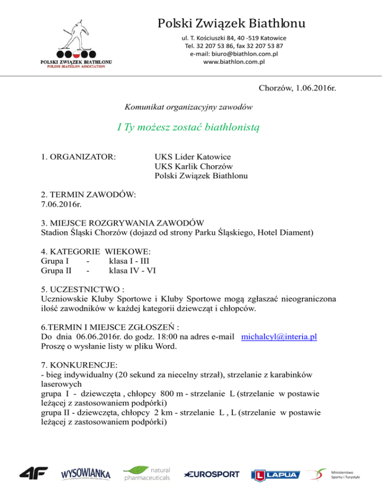 Polski Związek Biathlonu ul. T. Kościuszki 84, 40 -519 Katowice Tel. 32 207 53 86, fax 32 207 53 87 e-mail: [email protected] www.biathlon.com.pl Chorzów, 1.06.2016r. Komunikat organizacyjny zawodów I Ty możesz zostać biathlonistą 1. ORGANIZATOR: UKS Lider Katowice UKS Karlik Chorzów Polski Związek Biathlonu 2. TERMIN ZAWODÓW: 7.06.2016r. 3. MIEJSCE ROZGRYWANIA ZAWODÓW Stadion Śląski Chorzów (dojazd od strony Parku Śląskiego, Hotel Diament) 4. KATEGORIE WIEKOWE: Grupa I klasa I - III Grupa II klasa IV - VI 5. UCZESTNICTWO : Uczniowskie Kluby Sportowe i Kluby Sportowe mogą zgłaszać nieograniczona ilość zawodników w każdej kategorii dziewcząt i chłopców. 6.TERMIN I MIEJSCE ZGŁOSZEŃ : Do dnia 06.06.2016r. do godz. 18:00 na adres e-mail [email protected] Proszę o wysłanie listy w pliku Word. 7. KONKURENCJE: - bieg indywidualny (20 sekund za niecelny strzał), strzelanie z karabinków laserowych grupa I - dziewczęta , chłopcy 800 m - strzelanie L (strzelanie w postawie leżącej z zastosowaniem podpórki) grupa II - dziewczęta, chłopcy 2 km - strzelanie L , L (strzelanie w postawie leżącej z zastosowaniem podpórki) Polski Związek Biathlonu ul. T. Kościuszki 84, 40 -519 Katowice Tel. 32 207 53 86, fax 32 207 53 87 e-mail: [email protected] www.biathlon.com.pl PROGRAM ZAWODÓW godz. 11:00 - 11:45 - trening strzelecki godz. 12:00 - start dziewcząt i chłopców grupa I klasy I-III godz. 12:45 - start dziewcząt i chłopców grupa II klasy IV-V Uwagi organizacyjne: W zawodach mają prawo uczestniczyć dzieci i młodzież posiadający ważne badania lekarskie Zgłoszenia dokonują Uczniowskie Kluby Sportowe i Kluby Sportowe, Start dzieci i młodzieży na odpowiedzialność zgłaszającego. Organizator nie ponosi odpowiedzialności za zaistniałe wypadki podczas zawodów. Koszty organizacji zawodów pokrywa organizator, w tym karabinki laserowe. Organizator ma prawo zmienić godzinę startu zawodów w zależności od ilości startujących zawodników. Opiekunowie UKS-ów, odpowiadają za dyscyplinę i przestrzeganie zarówno regulaminu zawodów jak i zaleceń organizatorów