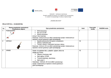 Człowiek – najlepsza inwestycja Projekt współfinansowany ze środków Unii Europejskiej w ramach Europejskiego Funduszu Społecznego „Akademia aktywności” PRACOWNIA - OGRODNIK Lp. Nazwa przedmiotu zamówienia Przykładowe zdjęcia 1 PODKASZARKA 2 SZPADLE 3 GRABIE Opis przedmiotu zamówienia Ilość Silnik dwusuwowy Moc (2,0-2,3) KM Głowica dwużyłowa Uchwyt V (tzw rowerowy) Gwarancja - minimum 24 m-ce; odbiór uszkodzonego sprzętu i dostarczenie po naprawie w ramach gwarancji w gestii sprzedającego Szpadle przeznaczone do kopania i przesadzania Głowica z hartowanej stali Trzonek z drewna, z elementami tworzywa, stalowy Gwarancja - minimum; 24 m-ce odbiór uszkodzonego sprzętu i dostarczenie po naprawie w ramach gwarancji w gestii sprzedającego 1 Grabie do grabienia liści, z płaskimi zębami, które nie wbijają się w liście Głowica z tworzywa, stali Ilość zębów ( 22-26) Trzonek drewniany, aluminiowy Ilość sztuk 5 Gwarancja - minimum; 24 m-ce odbiór uszkodzonego 10 sprzętu i dostarczenie po naprawie w ramach gwarancji w gestii sprzedającego 10 Cena jedn. brutto RAZEM brutto Człowiek – najlepsza inwestycja Projekt współfinansowany ze środków Unii Europejskiej w ramach Europejskiego Funduszu Społecznego „Akademia aktywności” Grabie do spulchniania ziemi, wyrównywania gleby, Głowica z hartowanej stali Grabie o zębach (od 12 do 16 zębów) Trzonek drewniany, aluminiowy Ilość sztuk 5 4 NOŻYCE DO GAŁĘZI 5 SEKATOR MAŁY 6 ZESTAW DO NAWADNIANIA KROPELKOWEGO Gwarancja - minimum; 24 m-ce; odbiór uszkodzonego sprzętu i dostarczenie po naprawie w ramach gwarancji w gestii sprzedającego Nożyce do cięcia gałęzi Ostrze: teflon, stal Rękojeść: stal, tworzywo sztuczne Dł. Narzędzia: (50-62 cm) Waga : (0,6 g-1,42 kg) Gwarancja - minimum 24 m-ce; odbiór uszkodzonego sprzętu i dostarczenie po naprawie w ramach gwarancji w gestii sprzedającego Sekatory do ciecia gałęzi Długość narzędzia (18 -21,5 cm) Ostrze- stal nierdzewna Rękojeść: aluminium , tworzywo sztuczne Gwarancja - minimum 24 m-ce; odbiór uszkodzonego sprzętu i dostarczenie po naprawie w ramach gwarancji w gestii sprzedającego linia kroplująca 40-50 m; min.50 szpilek do mocowania przewodów min.2 złączki spiralne dla przewodów Min. 2 kolanka spiralne dla przewodów, Min.2 trójniki spiralne dla przewodów 10 10 1 Człowiek – najlepsza inwestycja Projekt współfinansowany ze środków Unii Europejskiej w ramach Europejskiego Funduszu Społecznego „Akademia aktywności” 3 zamknięcia końcówki, Min.15 obejm dla przewodu, 2 wewnętrzne adaptery 3/4'' do przewodów 13-16 mm, 1 regulator ciśnienia, 1 filtr siatkowy 3/4'' GZ x GZ Gwarancja - minimum 24 m-ce; odbiór uszkodzonego sprzętu i dostarczenie po naprawie w ramach gwarancji w gestii sprzedającego 7 8 OPRYSKIWACZ RĘCZNY NOŻYCE SPALINOWE DO ŻYWOPŁOTU Opryskiwacz do wykonywania zabiegów pielęgnacyjnych roślin. Zbiornik ( 12-15 l) Lanca Pas nośny o regulowanej długości, szelki nośne Waga bez substancji 4 – 4,6 kg Ciśnienie robocze min. 4 bary Gwarancja - minimum 24 m-ce; odbiór uszkodzonego sprzętu i dostarczenie po naprawie w ramach gwarancji w gestii sprzedającego Spalinowe nożyce do pielęgnacji żywopłotu, krzewów. Silnik spalinowy Długość ostrza 51-60 cm Moc silnika min. 900 W Uchwyt regulowany Hamulec bezpieczeństwa Gwarancja - minimum 24 m-ce; odbiór uszkodzonego sprzętu i dostarczenie po 1 1 Człowiek – najlepsza inwestycja Projekt współfinansowany ze środków Unii Europejskiej w ramach Europejskiego Funduszu Społecznego „Akademia aktywności” 9 10 MODELE DRZEW ZESTAW DO BADANIA GLEBY naprawie w ramach gwarancji w gestii sprzedającego W skład zestawu wchodzi: Brzoza wys. 90-120 mm Sosna wys. 190-220mm Topola piramidalna 190-220mm Olcha 90-120 mm Jesion 170-220 mm Dąb 170-220 mm Świerk 200-220 mm Świerk 300-330 mm Świerk 190-220 mm Buk 170-220 mm Zestaw doświadczalny z wyposażeniem laboratoryjnym i kartami pracy Skład zestawu: sitka gospodarskie zlewki cylinder miarowy szufelka do pobierania próbek łopatka stalowa kreda wapienna tlenek wapnia łyżeczka paski wskaźnikowe pH 0 ÷ 14 papierki lakmusowe obojętne POCH-TEST paskowy azotanów 1 zestaw 1 Człowiek – najlepsza inwestycja Projekt współfinansowany ze środków Unii Europejskiej w ramach Europejskiego Funduszu Społecznego „Akademia aktywności” pręt szklany szkiełka podstawowe szkiełka nakrywkowe donice kwiatowe termometr probówki podstawka do probówek szalki Petriego filtr papierowy woda destylowana woreczki foliowe 11 WYKASZARKA SPALINOWA Głowica żyłkowa Pas nośny Automatyczne ssanie Silnik spalinowy Waga:4,0-12 kg Gwarancja - minimum 24 m-ce; odbiór uszkodzonego sprzętu i dostarczenie po naprawie w ramach gwarancji w gestii sprzedającego 1 12 GLEBOGRYZARAKA Silnik spalinowy o mocy 2,57-3,4 Gł. Robocza (13-20 cm) Waga (29-36 kg) Gwarancja - minimum 24 m-ce; odbiór uszkodzonego sprzętu i dostarczenie po naprawie w ramach gwarancji w gestii sprzedającego 1 Człowiek – najlepsza inwestycja Projekt współfinansowany ze środków Unii Europejskiej w ramach Europejskiego Funduszu Społecznego „Akademia aktywności” 13 WÓZEK DO TRANSPORTU ROŚLIN Wózek do przewozu ładunków. Wózek metalowy 4 koła Długość wózka min. 72 cm Szerokość wózka min. 47 cm Nośność dynamiczna min. 150 kg Gwarancja - minimum 24 m-ce; odbiór uszkodzonego sprzętu i dostarczenie po naprawie w ramach gwarancji w gestii sprzedającego 2 14 ROZDRABNIACZ DO GAŁĘZI Typ silnika elektryczny Moc silnika 1,2-2,8 KW Obudowa z tworzywa wzmocniona metalem Ochrona przed przeciążeniem Worek, pojemnik na ścinki Gwarancja - minimum 24 m-ce; odbiór uszkodzonego sprzętu i dostarczenie po naprawie w ramach gwarancji w gestii sprzedającego 1 15 AERATOR 1 16 KOSIARKA SPALINOWA Typ: aerator plus wertykulator Silnik 900- 1300W Szerokość robocza 30-34 cm Ręczna regulacja ustawienia wysokości ostrz