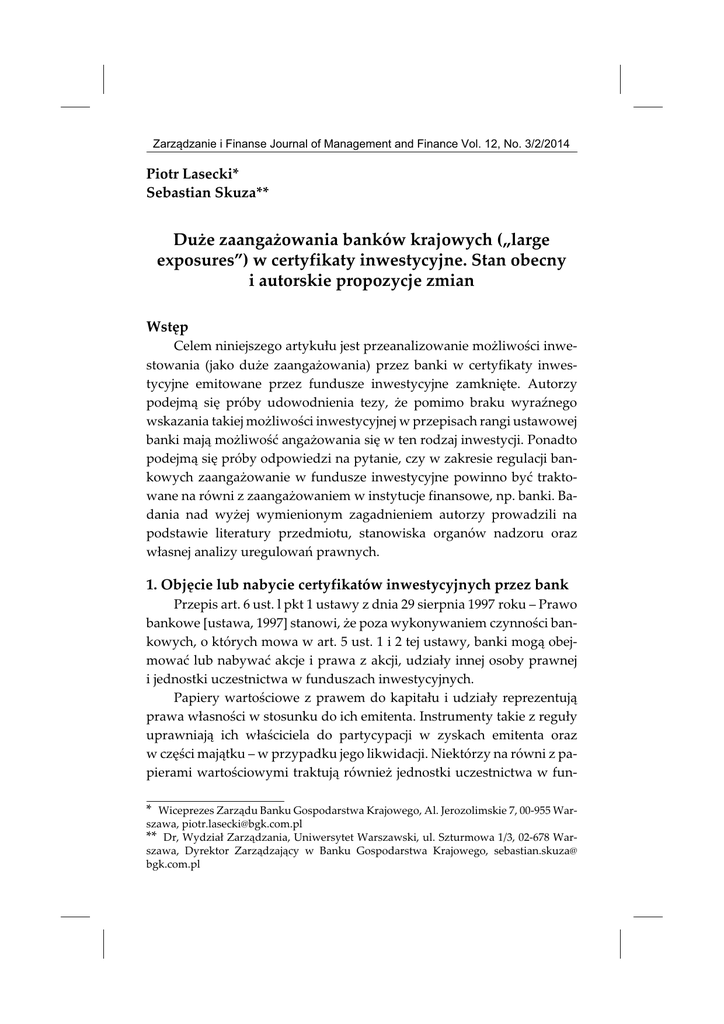 Zarz¹dzanie i Finanse Journal of Management and Finance Vol. 12, No. 3/2/2014 Piotr Lasecki* Sebastian Skuza** Piotr Lasecki, Sebastian Skuza Du¿e zaanga¿owania banków krajowych („large exposures”) w certyfikaty inwestycyjne. Stan obecny i autorskie propozycje zmian Du¿e zaanga¿owania banków krajowych („large exposures”)... Wstêp Celem niniejszego artyku³u jest przeanalizowanie mo¿liwoœci inwestowania (jako du¿e zaanga¿owania) przez banki w certyfikaty inwestycyjne emitowane przez fundusze inwestycyjne zamkniête. Autorzy podejm¹ siê próby udowodnienia tezy, ¿e pomimo braku wyraŸnego wskazania takiej mo¿liwoœci inwestycyjnej w przepisach rangi ustawowej banki maj¹ mo¿liwoœæ anga¿owania siê w ten rodzaj inwestycji. Ponadto podejm¹ siê próby odpowiedzi na pytanie, czy w zakresie regulacji bankowych zaanga¿owanie w fundusze inwestycyjne powinno byæ traktowane na równi z zaanga¿owaniem w instytucje finansowe, np. banki. Badania nad wy¿ej wymienionym zagadnieniem autorzy prowadzili na podstawie literatury przedmiotu, stanowiska organów nadzoru oraz w³asnej analizy uregulowañ prawnych. 1. Objêcie lub nabycie certyfikatów inwestycyjnych przez bank Przepis art. 6 ust. l pkt 1 ustawy z dnia 29 sierpnia 1997 roku – Prawo bankowe [ustawa, 1997] stanowi, ¿e poza wykonywaniem czynnoœci bankowych, o których mowa w art. 5 ust. 1 i 2 tej ustawy, banki mog¹ obejmowaæ lub nabywaæ akcje i prawa z akcji, udzia³y innej osoby prawnej i jednostki uczestnictwa w funduszach inwestycyjnych. Papiery wartoœciowe z prawem do kapita³u i udzia³y reprezentuj¹ prawa w³asnoœci w stosunku do ich emitenta. Instrumenty takie z regu³y uprawniaj¹ ich w³aœciciela do partycypacji w zyskach emitenta oraz w czêœci maj¹tku – w przypadku jego likwidacji. Niektórzy na równi z papierami wartoœciowymi traktuj¹ równie¿ jednostki uczestnictwa w fun* Wiceprezes Zarz¹du Banku Gospodarstwa Krajowego, Al. Jerozolimskie 7, 00-955 Warszawa, [email protected] ** Dr, Wydzia³ Zarz¹dzania, Uniwersytet Warszawski, ul. Szturmowa 1/3, 02-678 Warszawa, Dyrektor Zarz¹dzaj¹cy w Banku Gospodarstwa Krajowego, sebastian.skuza@ bgk.com.pl 176 Piotr Lasecki, Sebastian Skuza duszach inwestycyjnych innych ni¿ fundusze rynku pieniê¿nego [Skopowski, 2007, s. 95]. Pojêcie „jednostki uczestnictwa w funduszach inwestycyjnych” mo¿e powodowaæ w¹tpliwoœci interpretacyjne ze wzglêdu na brak precyzyjnoœci terminologicznej. Powy¿sze pojêcie odnosi siê wy³¹cznie do tytu³ów uczestnictwa w otwartych funduszach inwestycyjnych prowadz¹cych dzia³alnoœæ na podstawie ustawy z dnia 27 maja 2004 roku o funduszach inwestycyjnych [ustawa, 2004], nie obejmuj¹c swoim zakresem tytu³ów uczestnictwa w funduszach inwestycyjnych zamkniêtych (certyfikatów inwestycyjnych), a tak¿e tytu³ów uczestnictwa funduszy zagranicznych, funduszy inwestycyjnych otwartych z siedzib¹ w pañstwach EEA oraz funduszy inwestycyjnych otwartych z siedzib¹ w pañstwach nale¿¹cych do OECD innych ni¿ pañstwo cz³onkowskie lub pañstwo nale¿¹ce do EEA. W tym miejscu nale¿y wskazaæ na podzia³ instytucjonalny, wprowadzony art. 32 ust. 2 ustawy z dnia 27 maja 2004 roku o funduszach inwestycyjnych, a tak¿e na definicjê uczestnictwa w instytucjach wspólnego inwestowania okreœlon¹ w art. 3 pkt 3 ustawy z dnia 29 lipca 2005 roku o obrocie instrumentami finansowymi [ustawa, 2005]. Tytu³y uczestnictwa w instytucjach wspólnego inwestowania zosta³y zdefiniowane w wy¿ej wymienionym przepisie ustawy z dnia 29 lipca 2005 roku o obrocie instrumentami finansowymi jako wyemitowane na podstawie w³aœciwych przepisów prawa polskiego lub obcego papiery wartoœciowe lub niebêd¹ce papierami wartoœciowymi instrumenty finansowe reprezentuj¹ce prawa maj¹tkowe przys³uguj¹ce uczestnikom instytucji wspólnego inwestowania, w tym w szczególnoœci jednostki uczestnictwa funduszy inwestycyjnych [Szuster, Wejman, 2005, s. 108–114]. Przepis art. 6 ust. l pkt 1 in fine ustawy – Prawo bankowe wskazuje na dopuszczalnoœæ nabywania przez banki jednostek uczestnictwa funduszy inwestycyjnych, nie reguluje natomiast wprost mo¿liwoœci nabywania certyfikatów inwestycyjnych. Jednostki uczestnictwa i certyfikaty inwestycyjne, pomimo ¿e nie s¹ tym samym produktem, maj¹ jednak wiele cech wspólnych, zatem maj¹c na wzglêdzie cel wydania przepisu art. 6 ust. 1 pkt 1, nale¿y obj¹æ dyspozycj¹ tego przepisu równie¿ certyfikaty inwestycyjne. Celowoœæ takiej wyk³adni potwierdzi³ Generalny Inspektor Nadzoru Bankowego (GINB), który stwierdzi³, i¿ „jednostki uczestnictwa i certyfikaty inwestycyjne, nie bêd¹c tym samym produktem, maj¹ wiele cech wspólnych. Z tego te¿ wzglêdu, uznaj¹c wyk³adniê celowoœciow¹ za w³aœciw¹ dla interpretacji art. 6 ust. 1 pkt 1 Prawa bankowego, wydaje siê, Du¿e zaanga¿owania banków krajowych („large exposures”)... 177 ¿e za uzasadniony nale¿y uznaæ pogl¹d dopuszczaj¹cy mo¿liwoœæ nabywania, obok jednostek uczestnictwa w funduszach powierniczych (inwestycyjnych), równie¿ emitowanych przez te fundusze certyfikatów inwestycyjnych. Nale¿y jednak pamiêtaæ, ¿e równie¿ do tego typu dzia³alnoœci konieczne bêdzie stosowanie ograniczeñ anga¿owania œrodków finansowych banku” [Opinia GINB, 2000]. Powy¿sze stanowisko organu nadzoru znalaz³o wyraz w wieloletniej praktyce bankowej. Mo¿na równie¿ przyj¹æ pogl¹d, i¿ czynnoœci pozabankowe banków obejmuj¹ nabywanie akcji, udzia³ów i jednostek uczestnictwa. W zakresie art. 6 ust. 1 pkt 1 ustawy – Prawo bankowe mieœci siê nabywanie akcji emitowanych przez spó³kê akcyjn¹ i spó³kê komandytowo-akcyjn¹, nabywanie udzia³ów w spó³ce z ograniczon¹ odpowiedzialnoœci¹, spó³dzielniach, zamkniêtych funduszach inwestycyjnych (certyfikatów inwestycyjnych) oraz jednostek uczestnictwa w otwartych funduszach inwestycyjnych. Inwestycja w certyfikaty inwestycyjne emitowane przez 