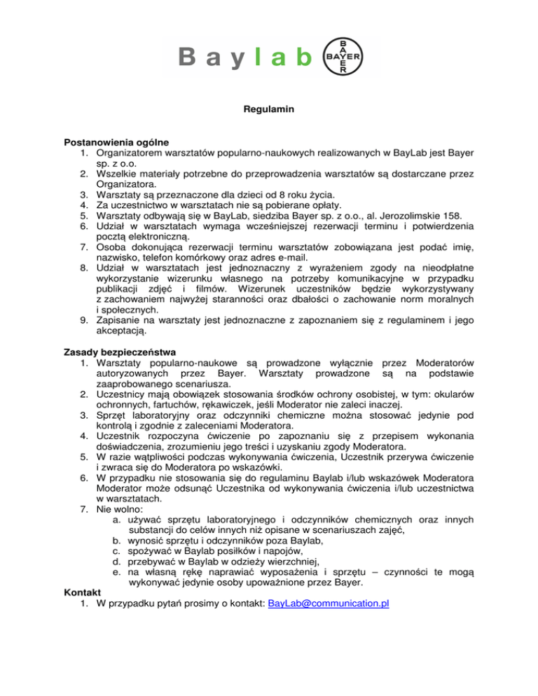 Regulamin Postanowienia ogólne 1. Organizatorem warsztatów popularno-naukowych realizowanych w BayLab jest Bayer sp. z o.o. 2. Wszelkie materiały potrzebne do przeprowadzenia warsztatów są dostarczane przez Organizatora. 3. Warsztaty są przeznaczone dla dzieci od 8 roku życia. 4. Za uczestnictwo w warsztatach nie są pobierane opłaty. 5. Warsztaty odbywają się w BayLab, siedziba Bayer sp. z o.o., al. Jerozolimskie 158. 6. Udział w warsztatach wymaga wcześniejszej rezerwacji terminu i potwierdzenia pocztą elektroniczną. 7. Osoba dokonująca rezerwacji terminu warsztatów zobowiązana jest podać imię, nazwisko, telefon komórkowy oraz adres e-mail. 8. Udział w warsztatach jest jednoznaczny z wyrażeniem zgody na nieodpłatne wykorzystanie wizerunku własnego na potrzeby komunikacyjne w przypadku publikacji zdjęć i filmów. Wizerunek uczestników będzie wykorzystywany z zachowaniem najwyżej staranności oraz dbałości o zachowanie norm moralnych i społecznych. 9. Zapisanie na warsztaty jest jednoznaczne z zapoznaniem się z regulaminem i jego akceptacją. Zasady bezpieczeństwa 1. Warsztaty popularno-naukowe są prowadzone wyłącznie przez Moderatorów autoryzowanych przez Bayer. Warsztaty prowadzone są na podstawie zaaprobowanego scenariusza. 2. Uczestnicy mają obowiązek stosowania środków ochrony osobistej, w tym: okularów ochronnych, fartuchów, rękawiczek, jeśli Moderator nie zaleci inaczej. 3. Sprzęt laboratoryjny oraz odczynniki chemiczne można stosować jedynie pod kontrolą i zgodnie z zaleceniami Moderatora. 4. Uczestnik rozpoczyna ćwiczenie po zapoznaniu się z przepisem wykonania doświadczenia, zrozumieniu jego treści i uzyskaniu zgody Moderatora. 5. W razie wątpliwości podczas wykonywania ćwiczenia, Uczestnik przerywa ćwiczenie i zwraca się do Moderatora po wskazówki. 6. W przypadku nie stosowania się do regulaminu Baylab i/lub wskazówek Moderatora Moderator może odsunąć Uczestnika od wykonywania ćwiczenia i/lub uczestnictwa w warsztatach. 7. Nie wolno: a. używać sprzętu laboratoryjnego i odczynników chemicznych oraz innych substancji do celów innych niż opisane w scenariuszach zajęć, b. wynosić sprzętu i odczynników poza Baylab, c. spożywać w Baylab posiłków i napojów, d. przebywać w Baylab w odzieży wierzchniej, e. na własną rękę naprawiać wyposażenia i sprzętu – czynności te mogą wykonywać jedynie osoby upoważnione przez Bayer. Kontakt 1. W przypadku pytań prosimy o kontakt: [email protected]