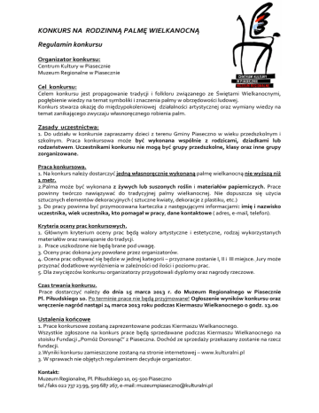KONKURS NA RODZINNĄ PALMĘ WIELKANOCNĄ Regulamin konkursu Organizator konkursu: Centrum Kultury w Piasecznie Muzeum Regionalne w Piasecznie Cel konkursu: Celem konkursu jest propagowanie tradycji i folkloru związanego ze Świętami Wielkanocnymi, pogłębienie wiedzy na temat symboliki i znaczenia palmy w obrzędowości ludowej. Konkurs stwarza okazję do międzypokoleniowej działalności artystycznej oraz wymiany wiedzy na temat zanikającego zwyczaju własnoręcznego robienia palm. Zasady uczestnictwa: 1. Do udziału w konkursie zapraszamy dzieci z terenu Gminy Piaseczno w wieku przedszkolnym i szkolnym. Praca konkursowa może być wykonana wspólnie z rodzicami, dziadkami lub rodzeństwem. Uczestnikami konkursu nie mogą być grupy przedszkolne, klasy oraz inne grupy zorganizowane. Praca konkursowa. 1. Na konkurs należy dostarczyć jedną własnoręcznie wykonaną palmę wielkanocną nie wyższą niż 1 metr. 2.Palma może być wykonana z żywych lub suszonych roślin i materiałów papierniczych. Prace powinny twórczo nawiązywać do tradycyjnej palmy wielkanocnej. Nie dopuszcza się użycia sztucznych elementów dekoracyjnych ( sztuczne kwiaty, dekoracje z plastiku, etc.) 3. Do pracy powinna być przymocowana karteczka z następującymi informacjami: imię i nazwisko uczestnika, wiek uczestnika, kto pomagał w pracy, dane kontaktowe ( adres, e-mail, telefon). Kryteria oceny prac konkursowych. 1. Głównym kryterium oceny prac będą walory artystyczne i estetyczne, rodzaj wykorzystanych materiałów oraz nawiązanie do tradycji. 2. Prace uszkodzone nie będą brane pod uwagę. 3. Oceny prac dokona jury powołane przez organizatorów. 4. Ocena prac odbywać się będzie w jednej kategorii – przyznane zostanie I, II i III miejsce. Jury może przyznać dodatkowe wyróżnienia w zależności od ilości i poziomu prac. 5. Dla zwycięzców konkursu organizatorzy przygotowali dyplomy oraz nagrody rzeczowe. Czas trwania konkursu. Prace dostarczyć należy do dnia 15 marca 2013 r. do Muzeum Regionalnego w Piasecznie Pl. Piłsudskiego 10. Po terminie prace nie będą przyjmowane! Ogłoszenie wyników konkursu oraz wręczenie nagród nastąpi 24 marca 2013 roku podczas Kiermaszu Wielkanocnego o godz. 13.00 Ustalenia końcowe 1. Prace konkursowe zostaną zaprezentowane podczas Kiermaszu Wielkanocnego. Wszystkie zgłoszone na konkurs prace będą sprzedawane podczas Kiermaszu Wielkanocnego na stoisku Fundacji „Pomóż Dorosnąć” z Piaseczna. Dochód ze sprzedaży przekazany zostanie na rzecz fundacji. 2.Wyniki konkursu zamieszczone zostaną na stronie internetowej – www.kulturalni.pl 3. W sprawach nie objętych regulaminem decyduje organizator. Kontakt: Muzeum Regionalne, Pl. Piłsudskiego 10, 05-500 Piaseczno tel./ faks 022 737 23 99, 509 687 267, e-mail: [email protected]