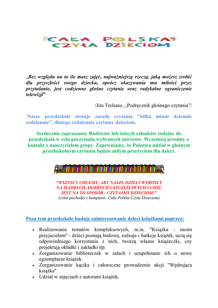 „Bez względu na to ile masz zajęć, najważniejszą rzeczą, jaką możesz zrobić dla przyszłości swego dziecka, oprócz okazywania mu miłości przez przytulanie, jest codzienne głośne czytanie oraz radykalne ograniczenie telewizji” /Jim Trelease, „Podręcznik głośnego czytania”/ Nasze przedszkole stosuje zasadę czytania "kilka minut dziennie codziennie", dlatego codziennie czytamy dzieciom. Serdecznie zapraszamy Rodziców lub innych członków rodziny do przedszkola w celu poczytania wybranych utworów. Wcześniej prosimy o kontakt z nauczycielem grupy. Zapewniamy, że Państwa udział w głośnym przedszkolnym czytaniu będzie miłym przeżyciem dla dzieci. "WSZYSCY CHCEMY, ABY NASZE DZIECI WYROSŁY NA MĄDRYCH, DOBRYCH I SZCZĘŚLIWYCH LUDZI. JEST NA TO SPOSÓB - CZYTAJMY DZIECIOM!" (cytat pochodzi z kampanii- Cała Polska Czyta Dzieciom) Poza tym przedszkole buduje zainteresowanie dzieci książkami poprzez:     Realizowanie tematów kompleksowych, m.in. "Książka - moim przyjacielem" - dzieci poznają budowę, rodzaje i funkcje książek, uczą się odpowiedniego korzystania z nich, tworzą własne książeczki, czy projektują okładki i zakładki itp. Zorganizowanie biblioteczek w salach i uzupełnianie ich o nowe egzemplarze książek. Zorganizowanie kącika i całoroczne prowadzenie akcji "Wędrująca książka" Udział w zajęciach z autorami książek.    Udział w lekcjach bibliotecznych w Gminnej Bibliotece i pobliskiej Bibliotece Szkolnej. Wypożyczanie albumów, encyklopedii, map, filmów i innych z biblioteki przedszkolnej do grup. Umożliwienie Rodzicom korzystania z literatury fachowej, oraz dziecięcej znajdującej się w przedszkolnej bibliotece. Zgodnie z ideą czytania dzieciom - propagowaną w ramach akcji CAŁA POLSKA CZYTA DZIECIOM : "NIKT NIE RODZI SIĘ CZYTELNIKIEM, CZYTELNIKA TRZEBA WYCHOWAĆ, CODZIENNIE CZYTAJĄC DZIECKU DLA PRZYJEMNOŚCI”, RODZICU, dlatego:  Wprowadź rytuał głośnego czytania dziecku 20 minut dziennie.  Jeśli dziecko o to prosi - wielokrotnie czytaj tę samą książkę lub wiersz.  Pozwalaj na pytania, rozmowy, powrót do poprzedniej strony.  Unikaj podziałów na książki dla chłopców i dla dziewcząt.  Tzw. książki dla dziewcząt warto przeczytać zanim chłopiec zacznie się wstydzić "babskiej literatury". Da mu to wgląd w słabo mu znany świat emocji.  Bądź przykładem - dzieci powinny widzieć dorosłych zagłębionych we własnych lekturach książek i czasopism.