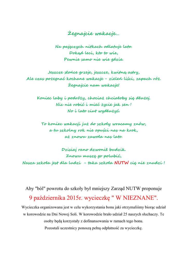 Żegnajcie wakacje… Na pajęczych nitkach odlatuje lato. Dokąd leci, kto to wie, Pewnie samo nie wie gdzie. Jeszcze słońce grzeje, jeszcze, kwitną astry, Ale czas pożegnać kochane wakacje - zieleń liści, zapach róż. Żegnajcie nam wakacje! Koniec laby i podróży, chociaż chciałoby się dłużej. Nic nie robić i mieć życie jak sen ! No i lato ciut wydłużyć. To koniec wakacji już do szkoły wracamy znów, a tu szkolny rok nie opuści nas na krok, aż znowu zawoła nas lato. Dzisiaj rano dzwonił budzik. Znowu muszę go polubić, Nasza szkoła jest dla ludzi - taka szkoła NUTW cię nie znudzi ! Aby "ból" powrotu do szkoły był mniejszy Zarząd NUTW proponuje 9 października 2015r. wycieczkę " W NIEZNANE". Wycieczka organizowana jest w celu wykorzystania bonu jaki otrzymaliśmy biorąc udział w korowodzie na Dni Nowej Soli. W korowodzie brało udział 25 naszych słuchaczy. Te osoby będą korzystały z dofinansowania w ramach tego bonu. Pozostali uczestnicy ponoszą pełną odpłatność za wycieczkę. Program wycieczki w "NIEZNANE" 1. Wyjazd autobusu o godz. 8.00, a powrót ok. godz. 17.00. (wycieczka całodniowa) Przystanki: przystanek ul. Zielonogórska - w stronę centrum miasta naprzeciw wejścia na stadion ul. 1-Maja - od strony Kościoła ul. Kościuszki - przystanek przy przychodni ALLMED 2. Trasa wycieczki - w woj. lubuskim. Do celu wycieczki ok. 45 km. 3. Posiłki - spotkanie przy kawie i obiad. 4. Spojrzenie na małą ojczyznę ludzi bardzo zaangażowanych - samorząd lokalny i mieszkańcy. 5. Spotkanie z ciekawymi ludźmi. 6. Jeżdżąc lub chodząc po małej ojczyźnie, na każdym kroku można spotykać się z jej historią i z nowoczesnością. Z jednej strony można zobaczyć domy pamiętające przynależność naszych terenów do Niemiec, a z drugiej – liczne, nowoczesne, pięknie zaprojektowane budynki. 7. Dofinansowanie unijne wykorzystane na utworzenie pięknych terenów rekreacyjnych. 8. Miejscowość, jako jedna z pierwszych w Polsce, objęta jest bezpłatnym dostępem do bezprzewodowego Internetu. Odwdzięczając się gospodarzom za przyjęcie nas , prosimy o upieczenie ciasta przez wspomagającą grupę słuchaczy zorganizowaną przez Krystynę Herzog. Pozostali uczestnicy wycieczki, proszeni są przy wpłacie na wycieczkę o przyniesienie do biura 20 dkg cukierków (takich jak na spotkanie z Mikołajem). Koszt wycieczki to 50,00 zł. Wpłata w biurze NUTW do 30.09.2015r. Biuro NUTW będzie czynne 3,9,10,16,17,23,24 i 30.09.2015r. i dalej.
