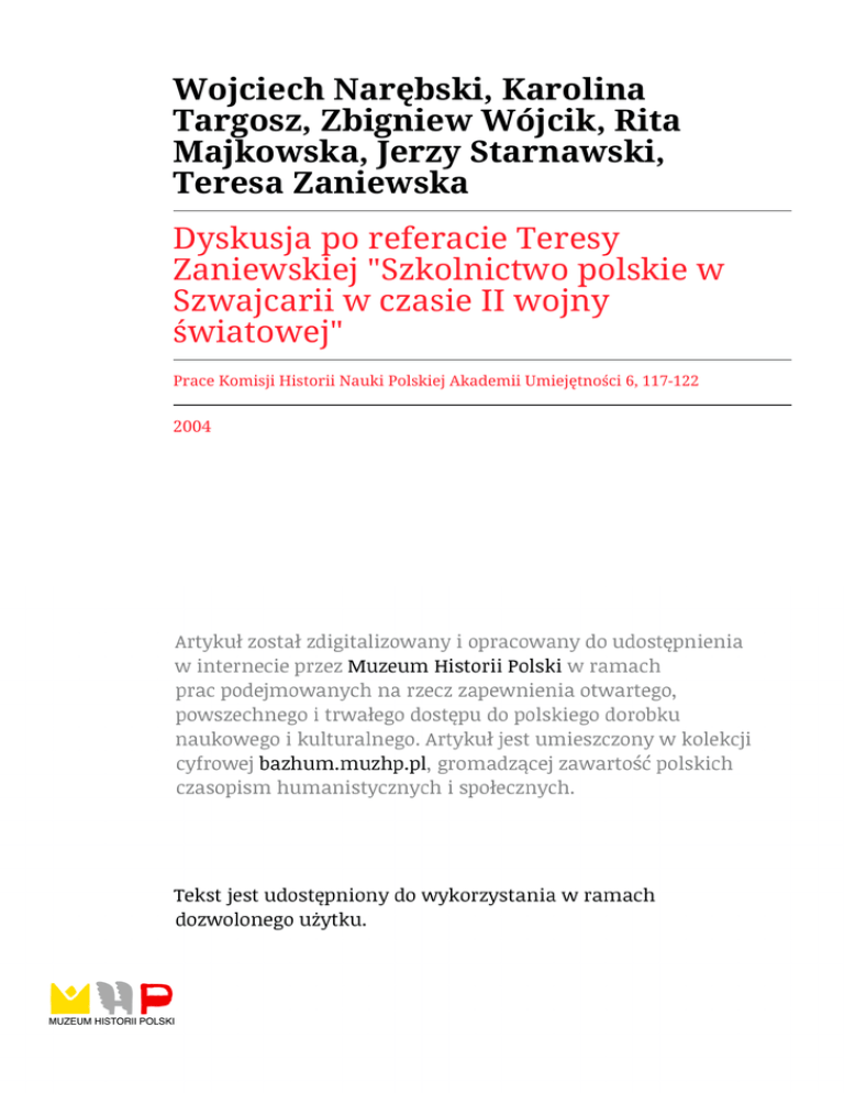 Wojciech Narębski, Karolina Targosz, Zbigniew Wójcik, Rita Majkowska, Jerzy Starnawski, Teresa Zaniewska Dyskusja po referacie Teresy Zaniewskiej "Szkolnictwo polskie w Szwajcarii w czasie II wojny światowej" Prace Komisji Historii Nauki Polskiej Akademii Umiejętności 6, 117-122 2004 Szkolnictwo polskie w Szwajcarii w czasie II wojny światowej 117 strony bardzo odmienieni. Kompleks niższości wobec Francuzów zanikł już w 1940 r. Wielu, dzięki akcji szkolenia zawodowego, uzyskało nowe możliwości życiowe, szczególnie wobec kryzysu w przemyśle górniczym. W iększość żołnierzy przestała pić i nauczyła się oszczędzać, co następowało stopniowo pod wpływem otoczenia w Szwajcarii niemieckiej. Nie było zasługą dywizji, lecz wynikiem pracy u rolników szwajcarskich, że żoł nierze poznali doskonałe metody gospodarki rolnej. W rezultacie, jak podawano, po wojnie, w północnej Francji, byłego żołnierza 2 DSP uwa żano za „dobrą partię"43. W iększość żołnierzy z Polski po wojnie albo powróciła do kraju, albo pozostała na Zachodzie. Byli to przeważnie inteligenci, co można było zaobserwować podczas studiów żołnierzy 2 DSP. W ówczas, gdy obaj najeźdźcy, ze W schodu i Zachodu, systematycznie niszczyli inteligencję polską, szczególne znaczenie miało tworzenie w Szwajcarii dobrze przygotowanej kadry inteligencji zawodowej. Sporządzone przez W ładysława Drobnego zestawienie samego personelu naukowego o kwalifikacjach nabytych w Szwajcarii zawiera 42 nazwiska byłych żoł nierzy 2 DSP wykładających po wojnie na wyższych uczelniach w Pol sce44. Znane też są nazwiska byłych żołnierzy 2 DSP wykładających na uczelniach akademickich lub piastujących wyższe stanowiska na Za chodzie. Dużym wysiłkiem nauczycieli i uczniów dywizja nie pozwoliła, by okres internowania stał się czasem straconym, gdyż - jak zauważył to już Michał Anioł - „nad czas stracony nic bardziej nie boli". Dyskusja po referacie Teresy Zaniewskiej: Szkolnictwo polskie w Szwajcarii w czasie II wojny światowej Wojciech Narębski: Chciałbym bardzo podziękować Pani Profesor i Zakładowi, którym Pani kieruje, za zajęcie się tą problematyką. Ja jestem przykładem żołnierza, w tym przypadku II Korpusu Generała Andersa, który przeszedł tę drogę. Zrobiłem małą maturę w Palestynie, w Ziemi Świętej, jeszcze przed kam panią włoską, pierwszą licealną we Włoszech, a drugą licealną i maturę robiłem już w Anglii. Korpus zaczynał od 45 000 żołnierzy, przy końcu 43 Tamże, s. 61. 44 W. Drobny, Walka bez oręża..., s. 337-338. 118 TERESA ZANIEW SKA było nas 100 000. Dzięki ukończeniu szkół w czasie wojny kilka tysięcy spośród nich mogło po powrocie do kraju zaraz podjąć studia. Bardzo ważne są konferencje, które Pani organizuje pod patrona tem Pana Prezydenta Ryszarda Kaczorowskiego, który skończył również takie gim nazjum . Mój kolega i przyjaciel, z którym robiłem i m ałą m a turę, i I licealną, i maturę, Bolesław Szkuta, który jest w iceprezesem Instytutu Sikorskiego w Londynie, przygotowuje wielką m onografię na temat szkolnictw a polskiego przy II Korpusie, zwłaszcza we W łoszech, gdzie było wtedy 5 czy 6 szkół. Ukazały się już publikacje o tych szkołach i po włosku i po polsku, w jednej jest reprodukowane moje świadectwo m aturalne. Teraz oczekujemy na monografię Olka Szkuty. Dysponuje on odpowiednim i do tego m ateriałam i, bo całe archiwa są w Londynie. Teresa Zaniewska: Zachęcam y w szystkich do współpracy. Ja oczywiście pom inęłam w m oim referacie pewne wątki, zrobiłam to celowo. Istnieje znakom ite opracowanie pani Agnieszki Pruszyńskiej, która pracuje w Bibliotece Lekarskiej w W arszaw ie, zajm uje się zbioram i specjalnymi, a jej oczkiem w głow ie są losy i osiągnięcia Polaków, absolwentów z czasów wojny zachodnich uniwersytetów. Opublikowała na ten temat mnóstwo arty kułów. Ja organizuję spotkania z uczestnikam i tych szkół z czasów wojny głównie z m yślą o m oich studentach, aby przedstawić osoby, które w spółtw orzyły to szkolnictw o i brały w nim udział, przedstawić jako żywych św iadków tych wydarzeń. Takie spotkania i konferencje stają się przez to spotkaniam i pokoleń. Na I M iędzynarodowej Konferencji N aukowej „Szkolnictw o i oświata polska na Zachodzie, w czasie drugiej wojny Św iatow ej", która odbyła się w dniach 5 -7 września 2000 r. w Ciechanow cu, był na przykład Prof. Jan Kobryner, który uczył języka angielskiego w W yższej Szkole Handlowej w St. Gallen, był nestor pol skich lekarzy Prof. Edward Rużyłło, który tworzył Polski W ydział M e dyczny na U niw ersytecie w Edynburgu. Są to osoby, które dają żywe św iadectw o i ocalają od zapom nienia te wydarzenia, ale jednocześnie są to żyw e w zory osobowe. Student inaczej odbiera to, co ja m ówię, a inaczej jeżeli m ów i o tym naoczny świadek tamtych wydarzeń. H erbert pisał: „O calałem nie po to, żeby żyć. Ocalałem po to, żeby dać św ia dectw o". N iestety, prawa czasu są nieubłagane. Jest to ostatnia okazja, żeby zebrać i ocalić od zapom nienia to, co jeszcze istnieje. Żyje jeszcze w W arszaw ie Prof. Jerzy Preibisch, zw iązany z Polskim Wydziałem M e dycznym w Edynburgu, w Zakopanem mieszka Prof. Józef Jappa. Za Szkolnictwo polskie w Szwajcarii w czasie II wojny światowej 119 praszam ich na nasze konferencje. Do wielu osób zwróciłam się z prośbą 0 pisanie wspomnień. W iele z nich odpowiedziało, że nie są już w stanie tego zrobić, ale chętnie zajmują się tym studenci, którzy nagrywają 1 spisują to, co bohaterow ie tych zdarzeń opowiadają. Ale jest ich już niestety coraz mniej. Karolina Targosz: Uczestniczyłam kiedyś w posiedzeniu Komitetu Historii Nauki i Tech niki PAN pod przewodnictwem pani Prof. Ireny Stasiewicz, poświęconym kształceniu w Edynburgu. Główny referat m iał tam Pro