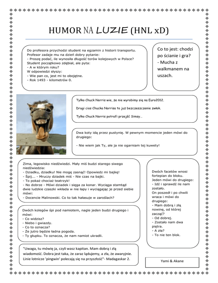 HUMOR NA LUZIE (HNL xD) Do profesora przychodzi student na egzamin z historii transportu. Profesor zadaje mu na dzień dobry pytanie: - Proszę podać, ile wynosiła długość torów kolejowych w Polsce? Student początkowo zdębiał, ale pyta: - A w którym roku? W odpowiedzi słyszy: - Wie pan co, jest mi to obojętne. - Rok 1493 - kilometrów 0. Co to jest: chodzi po ścianie i gra? - Mucha z walkmanem na uszach. Tylko Chuck Norris wie, że nie wyrobimy się na Euro2012. Drugi cios Chucka Norrisa to już bezczeszczenie zwłok. Tylko Chuck Norris potrafi przejść Simsy… Dwa koty idą przez pustynię. W pewnym momencie jeden mówi do drugiego: - Nie wiem jak Ty, ale ja nie ogarniam tej kuwety! Zima, legowisko niedźwiedzi. Mały miś budzi starego siwego niedźwiedzia: - Dziadku, dziadku! Nie mogę zasnąć! Opowiedz mi bajkę! - Śpij... - Mruczy dziadek miś - Nie czas na bajki. - To pokaż chociaż teatrzyk! - No dobrze - Mówi dziadek i sięga za konar. Wyciąga stamtąd dwie ludzkie czaszki wkłada w nie łapy i wyciągając je przed siebie mówi: - Docencie Malinowski. Co to tak hałasuje w zaroślach? - Eee to pewnie świstaki panie profesorze... Dwóch kolegów śpi pod namiotem, nagle jeden budzi drugiego i mówi: - Co widzisz? - Niebo i gwiazdy. - Co to oznacza? - Że jutro będzie ładna pogoda. - Ty głupku. To oznacza, że nam namiot ukradli. "Uwaga, tu mówię ja, czyli wasz kapitan. Mam dobrą i złą wiadomośd. Dobra jest taka, że zaraz lądujemy, a zła, że awaryjnie. Linie lotnicze 'pingwin' polecają się na przyszłośd"- Madagaskar 2. Dwóch facetów wnosi fortepian do bloku. Jeden mówi do drugiego: - Idź i sprawdź ile nam zostało. On poszedł i po chwili wraca i mówi do drugiego: - Mam dobrą i złą nowinę, od której zacząć? - Od dobrej. - Zostało nam dwa piętra. - A zła? - To nie ten blok. Yami & Akane