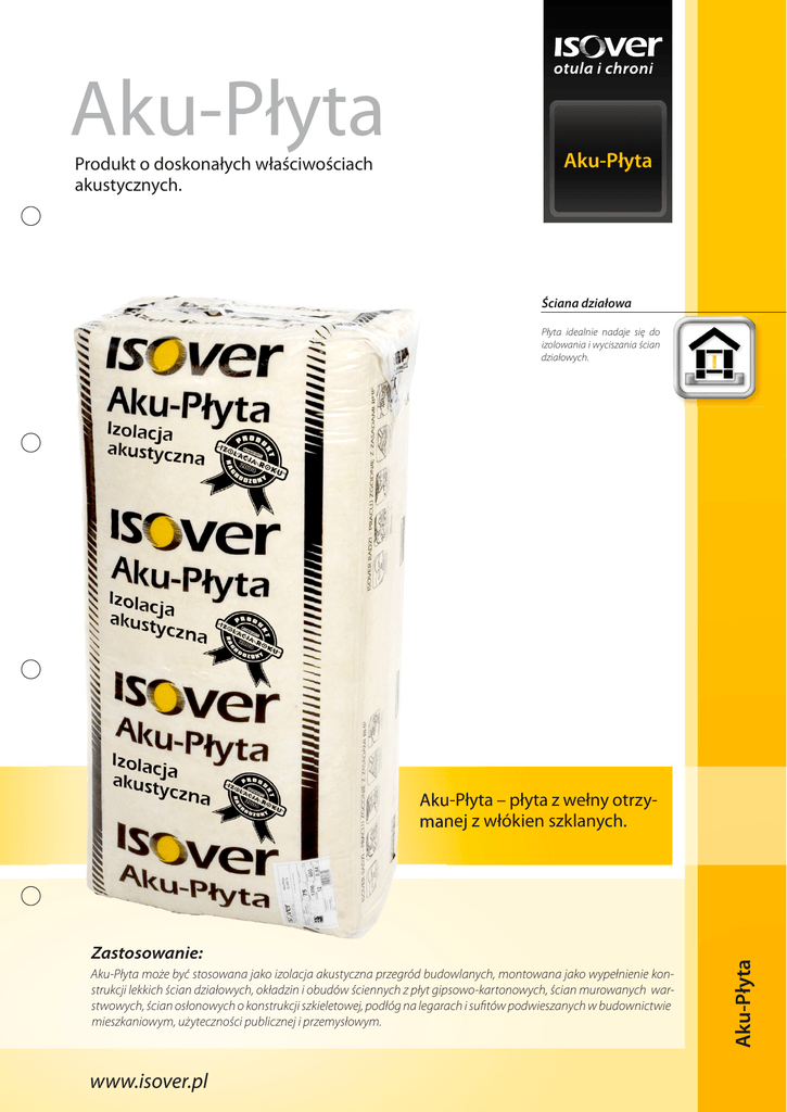 Aku-Płyta Produkt o doskonałych właściwościach akustycznych. Aku-Płyta Ściana działowa Płyta idealnie nadaje się do izolowania i wyciszania ścian działowych. Zastosowanie: Aku-Płyta może być stosowana jako izolacja akustyczna przegród budowlanych, montowana jako wypełnienie konstrukcji lekkich ścian działowych, okładzin i obudów ściennych z płyt gipsowo-kartonowych, ścian murowanych warstwowych, ścian osłonowych o konstrukcji szkieletowej, podłóg na legarach i sufitów podwieszanych w budownictwie mieszkaniowym, użyteczności publicznej i przemysłowym. www.isover.pl Aku-Płyta Aku-Płyta – płyta z wełny otrzymanej z włókien szklanych. Aku-Płyta Płyta charakteryzująca się doskonałymi właściwościami akustycznymi. Dopuszczenia: Polska Norma PN-EN 13162:2002, Atest higieniczny PZH: HK/B/2486/04/2000 Właściwości: nie absorbuje wilgoci doskonałe właściwości akustyczne typowe wymiary do montażu w ściankach działowych wyjątkowa sprężystość gwarantuje dokładne wypełnienie izolowanej przestrzeni Opakowanie: Aku-Płyta jako produkt skompresowany jest dostępna w opakowaniach zbiorczych MPS. Jeden MPS to 20 paczek. Transport i przechowywanie: Aku-Płyta powinna być transportowana i składowana w warunkach uniemożliwiających jej zawilgocenie oraz uszkodzenia mechaniczne. Opór cieplny R: Wymiary: Grubość [mm] RD Numer produktu Grubość [mm] Długość [mm] Szerokość [mm] m2/opak. 50 1,35 1221050 50 1200 600 14,40 75 2,00 1221075 75 1200 600 8,64 100 2,70 1221100 100 1200 600 7,20 120 3,20 1221120 120 1200 600 5,76 150 4,05 1221150 150 1200 600 4,32 Parametry techniczne: Współczynnik przewodzenia ciepła λD = 0,037 [W/mK] Maksymalna temperatura stosowania: tmax = 200°C Klasyfikacja ogniowa: A1 Kod oznaczenia (dla grubości 50 mm): MW-EN13162-T2-MV1-AW0,90 (dla grubości 75 mm i wyższych: MW-EN13162-T2-MV1-AW0,1) Współczynnik pochłaniania dźwięku αp Aku-Płyta Grubość [mm] *AKPROJEKTOWAÃyCIANYWEWNÇTRZNE ZGODNIEZPRZEPISAMI $OBÐRROZWIZAÎWG r)ZOLACYJNOyCIAKUSTYCZNEJ2o! r/DPORNOyCIOGNIOWEJ%)2%) Częstotliwość [Hz] 125 250 500 1000 2000 4000 50 0,20 0,55 0,95 0,95 0,95 1,00 75 0,30 0,85 1,00 1,00 1,00 1,00 75 0,55 1,00 1,00 1,00 1,00 1,00 Aku-Płyta stanowi integralną część Akusto-Matrix, narzędzia ISOVER do projektowania ścianek działowych zgodnie z Polską Normą – akustyka Budowlana. Akusto-Matrix to specjalnie opracowane tabele doboru lekkich ścian działowych, precyzyjnie określających technologię, materiały i sposób ich montażu, tak, aby były spełnione wymogi przepisów pod względem odporności ogniowej, statyki oraz izolacyjności akustycznej w rzeczywistych warunkach budowy. SAINT-GOBAIN ISOVER POLSKA ul. Okrężna 16, 44-100 Gliwice tel.: (032) 339 63 00, faks: (032) 339 64 44; e-mail: [email protected]; Infolinia: 0800 163 121