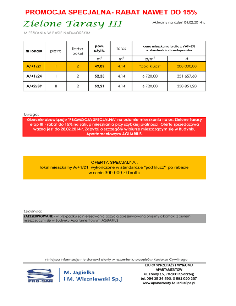 PROMOCJA SPECJALNA - RABAT NAWET DO 15% Aktualny na dzień 04.02.2014 r. MIESZKANIA W PASIE NADMORSKIM nr lokalu piętro liczba pokoi pow. użytk. taras m2 m2 zł/m2 zł cena mieszkania brutto z VAT=8% w standardzie deweloperskim A/+1/21 I 2 49,09 4,14 "pod klucz" 300 000,00 A/+1/24 I 2 52,33 4,14 6 720,00 351 657,60 A/+2/39 II 2 52,21 4,14 6 720,00 350 851,20 Uwaga: Obecnie obowiązuje "PROMOCJA SPECJALNA" na ostatnie mieszkania na os. Zielone Tarasy etap III - rabat do 15% na zakup mieszkania przy szybkiej płatności. Oferta sprzedażowa ważna jest do 28.02.2014 r. Zapytaj o szczegóły w biurze mieszczącym się w Budynku Apartamentowym AQUARIUS. OFERTA SPECJALNA : lokal mieszkalny A/+1/21 wykończone w standardzie "pod klucz" po rabacie w cenie 300 000 zł brutto Legenda: ZAREZERWOWANE - w przypadku zainteresowania pozycją zarezerwowaną prosimy o kontakt z biurem mieszczącym się w Budynku Apartamentowym AQUARIUS niniejsza informacja nie stanowi oferty w rozumieniu przepisów Kodeksu Cywilnego BIURO SPRZEDAŻY I WYNAJMU APARTAMENTÓW ul. Fredry 15, 78-100 Kołobrzeg tel. 094 35 36 590, 0 691 020 237 www.Apartamenty.AquariusSpa.pl ..