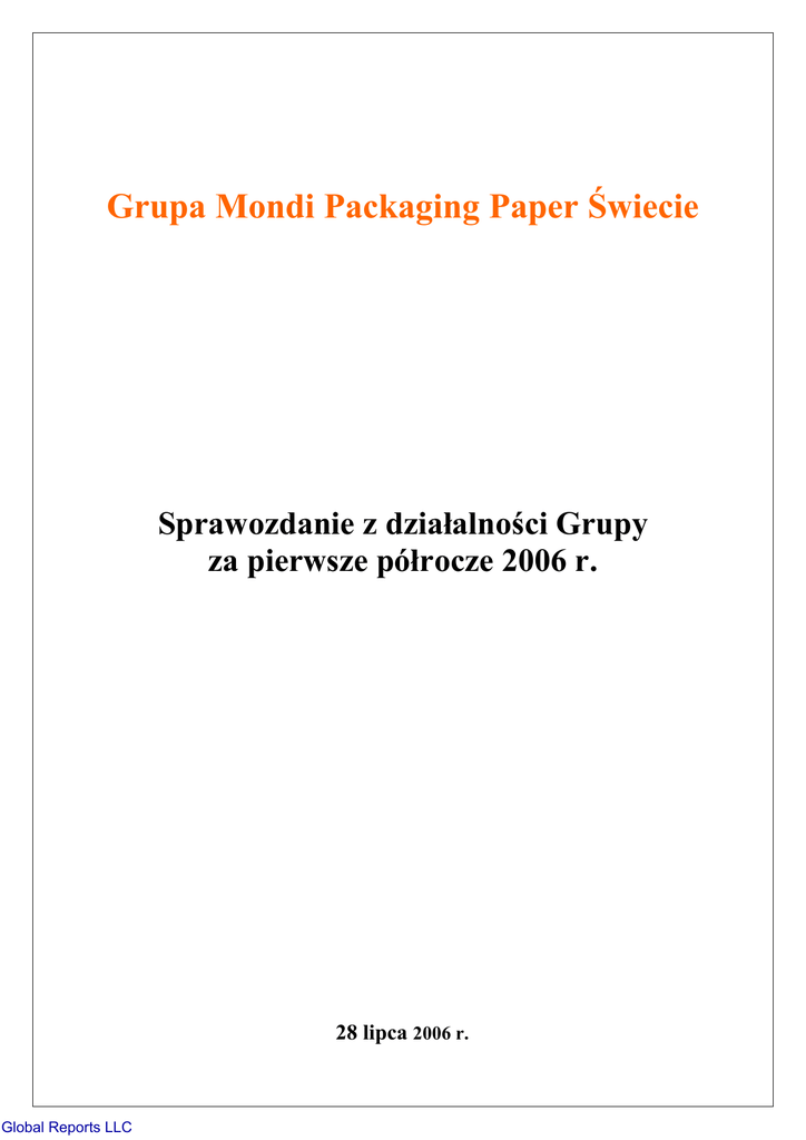 Grupa Mondi Packaging Paper Świecie Sprawozdanie z działalności Grupy za pierwsze półrocze 2006 r. 28 lipca 2006 r. Global Reports LLC Grupa Mondi Packaging Paper Świecie Sprawozdanie z działalności Grupy za pierwsze półrocze 2006 r. SPIS TREŚCI 1. HISTORIA GRUPY 4 2. INFORMACJA O PODSTAWOWYCH PRODUKTACH 4 2.1. Branża 4 2.2. Rodzaje produktów 5 2.3. Wielkość produkcji 6 2.4. Grupa na tle branży i konkurencji 7 2.5. Struktura sprzedaży 8 2.6. Rynki zbytu 8 2.7. Źródła zaopatrzenia w materiały do produkcji 9 3. INFORMACJE O INNYCH ZDARZENIACH W I PÓŁROCZU 2006 ROKU 10 3.1. Informacja o znaczących umowach 10 3.2. Zmiany w powiązaniach organizacyjnych lub kapitałowych 10 3.3. Transakcje z podmiotami powiązanymi 10 3.4. Kredyty, umowy pożyczek, poręczenia i gwarancje 11 3.5. Wykorzystanie wpływów z emisji 11 3.6. Różnice w stosunku do ostatnio publikowanej prognozy 11 3.7. Zarządzanie zasobami finansowymi i ocena płynności 12 3.8. Możliwości realizacji zamierzeń inwestycyjnych 12 3.9. Wpływ czynników i nietypowych zdarzeń na wynik 12 3.10. Charakterystyka czynników rozwoju i funkcjonowania 12 3.10.1. Czynniki zewnętrzne 12 3.10.2. Przewidywany rozwój Grupy 13 3.10.3. Osiągnięcia w zakresie badań i rozwoju 13 3.10.4. Aktualna i przewidywana sytuacja finansowa 14 3.10.5. Cele i metody zarządzania ryzykiem finansowym 14 3.11. Zarządzanie i komputeryzacja 16 3.12. Zmiany w podstawowych zasadach zarządzania przedsiebiorstwem emitenta i jego grupą kapitałową 16 3.13. Zmiany w składzie osób zarządzających i nadzorujących 16 3.14. Umowy zawarte między emitentem a osobami zarządzającymi 17 3.15. Wynagrodzenie dla osób zarządzających i nadzorujących 17 3.16. Wartość niespłaconych pożyczek udzielonych osobom zarządzającym i nadzorującym 17 3.17. Akcje w posiadaniu osób zarządzających i nadzorujących 17 3.18. Znaczący akcjonariusze 18 3.19. Zmiany w strukturze akcjonariuszy 18 3.20. Posiadacze wszelkich papierów wartościowych, które dają specjalne uprawnienia kontrolne w stosunku do emitenta 18 3.21. Informacje o systemie kontroli programów akcji pracowniczych 18 2 Global Reports LLC Grupa Mondi Packaging Paper Świecie Sprawozdanie z działalności Grupy za pierwsze półrocze 2006 r. 4. 3.22. Ograniczenia dotyczące przenoszenia prawa własności papierów wartościowych emitenta oraz ograniczenia w zakresie wykonywania prawa głosu przypadających na akcje emitenta 18 3.23. 19 Umowy z podmiotem uprawnionym do badania sprawozdań finansowych OŚWIADCZENIA ZARZĄDU 19 4.1. Prawdziwość i rzetelność prezentowanych sprawozdań 19 4.2. Wybór podmiotu uprawnionego do badania sprawozdań finansowych 19 3 Global Reports LLC Grupa Mondi Packaging Paper Świecie Sprawozdanie z działalności Grupy za pierwsze półrocze 2006 r. 1. HISTORIA GRUPY Historia firmy Mondi Packaging Paper Świecie S.A. sięga początku lat 90-tych. W styczniu 1991 roku przedsiębiorstwo państwowe – Zakłady Celulozy i Papieru w Świeciu – zostało przekształcone w jednoosobową spółkę Skarbu Państwa. W kwietniu 1997 roku 15% akcji spółki wprowadzono na warszawską giełdę. W sierpniu tegoż roku sprzedano większościowy pakiet akcji inwestorowi strategicznemu, spółce Framondi NV, zarejestrowanej w Holandii. Zmianie uległa też nazwa Spółki na Frantschach Świecie. Grupa Frantschach należała w 100% do Mondi - jednego z liderów przemysłu papierniczego i opakowań. Mondi jest częścią Anglo American Group plc, która jest światowym liderem w przemyśle wydobywczym i surowców naturalnych. W listopadzie 2004, na skutek połączenia Grupy Frantschach z Grupą Mondi Packaging Europe, powstała jedna zintegrowana grupa, tj. Mondi Packaging, z jednolitą marką i logo. Na skutek tych przeobrażeń 20 stycznia 2005 r. zmianie ulega także nazwa firmy z Frantschach Swiecie S.A. na Mondi Packaging Paper Świecie S.A. Spółka Świecie Recykling rozpoczęła działalność w styczniu 2002 roku na bazie działającego w strukturach Frantschach Swiecie S.A, Działu Zaopatrzenia w Makulaturę. Frantschach Świecie S.A (obecnie Mondi Packaging Paper Świecie S.A.) objął 100% udziałów w spółce z ograniczoną odpowiedzialnością stając się jej jedynym wspólnikiem. Firma jako jedyna na rynku krajowym, zabezpiecza Mondi Packaging Paper Świecie S.A. w makulaturę – jeden z kluczowych surowców do produkcji papieru. W grudniu 2004 r. Nadzwyczajne Zgromadzenie Wspólników podjęło uchwałę o zmianie nazwy firmy z Frantschach Świecie Recykling Sp. z o.o. na Świecie Recykling Sp. z o.o. Wpisu do KRS dokonano 6 stycznia 2005 r. 2. INFORMACJA O PODSTAWOWYCH PRODUKTACH 2.1. Branża Zgodnie z założeniami strategii realizowanej przez Mondi Packaging Paper Świecie, Grupa koncentruje swoją działalność na wytwarzaniu papierów do produkcji tektury falistej oraz papieru workowego. Grupa jest krajowym liderem w zakresie produkowanych asortymentów oraz znaczącym producentem europejskim na rynku papieru do produkcji tektury falistej i papieru workowego. W wyniku realizacji planu inwestycyjnego uzyskano znaczną poprawę parametrów jakościowych produkowanych papierów, co umożliwia Grupie skuteczne konkurowanie z czołowymi producentami papieru w Europie i na świecie. W pierwszym kwartale 2005 przebudowany został układ mielenia na maszynie nr 4, co znacznie poprawiło parametry wytrzymałościowe, przerabialność oferowanego przez Grupę flutingu półchemicznego, zwiekszając jednocześnie wydajność produkcji. Na maszynie nr 1 zainstalowany został gładzik, w wyniku czego poprawie uległy parametry związane z drukowością papieru workowego oraz niskogramaturowego kraftlinera. 4 Global Reports LLC Grupa Mondi Packaging Paper Świecie Sprawozdanie z działalności Grupy za pierwsze półrocze 2006 r. Po przebudowie maszyny nr 5, produkowany na niej kraftliner charakteryzuje się bardzo dobrą jakością. Skutkuje to wzroste