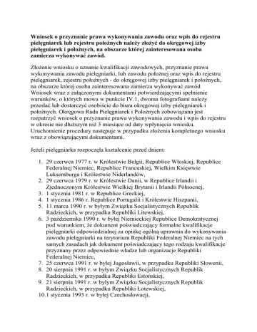 Wniosek o przyznanie prawa wykonywania zawodu oraz wpis do rejestru pielęgniarek lub rejestru połoŜnych naleŜy złoŜyć do okręgowej izby pielęgniarek i połoŜnych, na obszarze której zainteresowana osoba zamierza wykonywać zawód. ZłoŜenie wniosku o uznanie kwalifikacji zawodowych, przyznanie prawa wykonywania zawodu pielęgniarki, lub zawodu połoŜnej oraz wpis do rejestru pielęgniarek, rejestru połoŜnych - do okręgowej izby pielęgniarek i połoŜnych, na obszarze której osoba zainteresowana zamierza wykonywać zawód Wniosek wraz z załączonymi dokumentami potwierdzającymi spełnienie warunków, o których mowa w punkcie IV.1, dwoma fotografiami naleŜy przesłać lub dostarczyć osobiście do biura okręgowej izby pielęgniarek i połoŜnych. Okręgowa Rada Pielęgniarek i PołoŜnych zobowiązana jest rozpatrzyć wniosek o przyznanie prawa wykonywania zawodu i wpis do rejestru w okresie nie dłuŜszym niŜ 3 miesiące od daty wpłynięcia wniosku. Uruchomienie procedury następuje w przypadku złoŜenia kompletnego wniosku wraz z obowiązującymi dokumentami. JeŜeli pielęgniarka rozpoczęła kształcenie przed dniem: 1. 29 czerwca 1977 r. w Królestwie Belgii, Republice Włoskiej, Republice Federalnej Niemiec, Republice Francuskiej, Wielkim Księstwie Luksemburga i Królestwie Niderlandów, 2. 29 czerwca 1979 r. w Królestwie Danii, w Republice Irlandii i Zjednoczonym Królestwie Wielkiej Brytanii i Irlandii Północnej, 3. 1 stycznia 1981 r. w Republice Greckiej, 4. 1 stycznia 1986 r. Republice Portugalii i Królestwie Hiszpanii, 5. 11 marca 1990 r. w byłym Związku Socjalistycznych Republik Radzieckich, w przypadku Republiki Litewskiej, 6. 3 października 1990 r. w byłej Niemieckiej Republice Demokratycznej pod warunkiem, Ŝe dokument poświadczający formalne kwalifikacje pielęgniarki odpowiedzialnej za opiekę ogólną uprawnia do wykonywania zawodu pielęgniarki na terytorium Republiki Federalnej Niemiec na tych samych zasadach jak dokument poświadczający tego rodzaju kwalifikacje przyznany przez odpowiednie władze lub organizacje Republiki Federalnej Niemiec, 7. 25 czerwca 1991 r. w byłej Jugosławii, w przypadku Republiki Słowenii, 8. 20 sierpnia 1991 r. w byłym Związku Socjalistycznych Republik Radzieckich, w przypadku Republiki Estońskiej, 9. 21 sierpnia 1991 r. w byłym Związku Socjalistycznych Republik Radzieckich, w przypadku Republiki Łotewskiej, 10.1 stycznia 1993 r. w byłej Czechosłowacji, 11.1 stycznia 1994 r. w Republice Austrii, Republice Finlandii, Królestwie Szwecji, Królestwie Norwegii, Republice Islandii, 12.1 maja 1995 r. w Księstwie Lichtensteinu, 13.1 czerwca 2002 r. w Konfederacji Szwajcarskiej, 14.1 maja 2004 r. w Republice Czeskiej, Republice Słowackiej, Republice Słowenii, Republice Litewskiej, Republice Łotewskiej, Republice Estońskiej, Republice Węgierskiej, Republice Malty lub Republice Cypryjskiej, do wniosku naleŜy dołączyć: • • zaświadczenie wydane przez odpowiednie władze lub organizacje państwa członkowskiego Unii Europejskiej potwierdzające, Ŝe osoba ta wykonywała zawód pielęgniarki odpowiedzialnej za opiekę ogólną przez okres co najmniej 3 kolejnych lat z ostatnich 5 bezpośrednio poprzedzających wydanie zaświadczenia, albo • zaświadczenie wydane przez odpowiednie władze lub organizacje państwa członkowskiego Unii Europejskiej potwierdzające, Ŝe dyplom, świadectwo lub inny dokument potwierdzający posiadanie formalnych kwalifikacji do wykonywania zawodu pielęgniarki, został uzyskany po ukończeniu kształcenia zgodnego z przepisami Unii Europejskiej i jest traktowany przez te władze lub organizacje za równowaŜny z dokumentami, o których mowa w Obwieszczeniu Ministra Zdrowia (patrz punkt IV.4.). JeŜeli połoŜna rozpoczęła kształcenie przed dniem: 1. 23 stycznia 1983 r. w Królestwie Belgii, Królestwie Danii, Republice Federalnej Niemiec, Republice Greckiej, Republice Francuskiej, Republice Irlandii, Republice Włoskiej, Wielkim Księstwie Luksemburga, Królestwie Niderlandów i Zjednoczonym Królestwie Wielkiej Brytanii i Irlandii Północnej, 2. 1 stycznia 1986 r. w Królestwie Hiszpanii i Republice Portugalii, 3. 11 marca 1990 r. w byłym Związku Socjalistycznych Republik Radzieckich, w przypadku Republiki Litewskiej, 4. 3 października 1990 r. w byłej Niemieckiej Republice Demokratycznej pod warunkiem, Ŝe dokument poświadczający formalne kwalifikacje połoŜnej uprawnia do wykonywania zawodu połoŜnej na terytorium Republiki Federalnej Niemiec na tych samych zasadach jak dokument poświadczający tego rodzaju kwalifikacje przyznany przez odpowiednie władze lub organizacje Republiki Federalnej Niemiec, 5. 25 czerwca 1991 r. w byłej Jugosławii, w przypadku Republiki Słowenii, 6. 20 sierpnia 1991 r. w byłym Związku Socjalistycznych Republik Radzieckich, w przypadku Republiki Estońskiej, 7. 21 sierpnia 1991 r. w byłym Związku Socjalistycznych Republik Radzieckich, w przypadku Republiki Łotewskiej, 8. 1 stycznia 1993 r. w byłej Czechosłowacji, 9. 1 stycznia 1994 r. w Republice Austrii, Republice Finlandii, Królestwie Szwecji, Królestwie Norwegii, Republice Islandii, 10.1 maja 1995 r. w Księstwie Lichtensteinu, 11.1 czerwca 2002 r. w Konfederacji Szwajcarskiej, 12.1 maja 2004 r. w Republice Czeskiej, Republice Słowackiej, Republice Słowenii, Republice Litewskiej, Republice Łotewskiej, Republice Estońskiej, Republice Węgierskiej, Republice Malty lub Republice Cypryjskiej, do wniosku naleŜy dołączyć: • - zaświadczenie wydane przez odpowiednie władze lub organizacje państwa członkowskiego Unii Europejskiej potwierdzające, Ŝe osoba ta wykonywała zawód połoŜnej przez okres co najmniej 3 kolejnych lat z ostatnich 5 bezpośrednio poprzedzających wydanie zaświadczenia, albo • - zaświadczenie wydane przez odpowiednie władze lub organizacje państwa członkowskiego Unii Europejskiej potwierdzające, Ŝe dyplom, świadectwo 