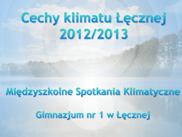 POŁOŻENIE Łęczna leży: • w centrum województwa lubelskiego, • w widłach dwóch rzek – Wieprza i Świnki, • w obszarze Wyżyny Lubelskiej, • w pobliżu jezior, • w powiecie łęczyńskim. Miasto położone jest na bezleśnym płaskowyżu lessowym. Najwyższa temperatura – 2012r. 40 35 30 25 20 15 10 5 0 °C 40 35 30 25 20 15 10 5 0 °C Najwyższa temperatura – 2013r. 25 20 15 10 5 0 -5 -10 -15 -20 °C 25 20 15 10 5 0 -5 -10 -15 °C Najniższa temperatura – 2012r. Najniższa temperatura – 2013r. 30 25 20 15 10 5 0 -5 -10 Średnia miesięczna temperatura powietrza 2012r. °C 30 25 20 15 10 5 0 -5 °C Średnia miesięczna temperatura powietrza 2013r. Temperatura powietrza 2012 LATO: * najwyższa temperatura 35˚C – lipiec, sierpień * najniższa temperatura 12˚C - sierpień ZIMA: * najwyższa temperatura 13˚C – grudzień * najniższa temperatura -17˚C – luty Temperatura powietrza 2013 LATO: * najwyższa temperatura 36˚C – sierpień * najniższa temperatura 17˚C – czerwiec ZIMA: * najwyższa temperatura 10˚C – luty * najniższa temperatura -9˚C - styczeń Ciśnienie rok 2012 *najwyższe 1028 hPa – (styczeń) *najniższe 980 hPa – (styczeń) Ciśnienie rok 2013 *najwyższe 1029 hPa – (październik) *najniższe 896 hPa –(styczeń) WIATR 2012 NW (północno-zachodni) – styczeń, marzec, październik SW (południowo-zachodni) – czerwiec, lipiec, sierpień, wrzesień WIATR 2013 NW (północno-zachodni) – luty, czerwiec, lipiec NE (północno-wschodni) – styczeń, marzec, kwiecień