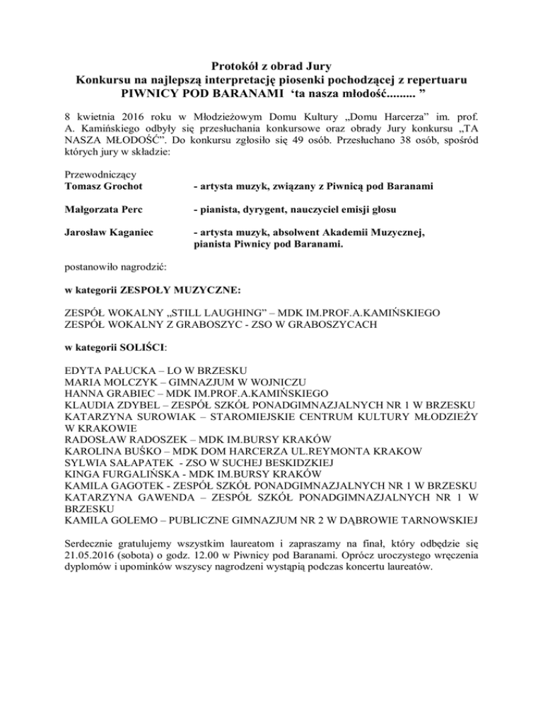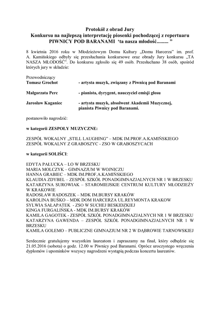 Protokół z obrad Jury Konkursu na najlepszą interpretację piosenki pochodzącej z repertuaru PIWNICY POD BARANAMI ‘ta nasza młodość......... ” 8 kwietnia 2016 roku w Młodzieżowym Domu Kultury „Domu Harcerza” im. prof. A. Kamińskiego odbyły się przesłuchania konkursowe oraz obrady Jury konkursu „TA NASZA MŁODOŚĆ”. Do konkursu zgłosiło się 49 osób. Przesłuchano 38 osób, spośród których jury w składzie: Przewodniczący Tomasz Grochot - artysta muzyk, związany z Piwnicą pod Baranami Małgorzata Perc - pianista, dyrygent, nauczyciel emisji głosu Jarosław Kaganiec - artysta muzyk, absolwent Akademii Muzycznej, pianista Piwnicy pod Baranami. postanowiło nagrodzić: w kategorii ZESPOŁY MUZYCZNE: ZESPÓŁ WOKALNY „STILL LAUGHING” – MDK IM.PROF.A.KAMIŃSKIEGO ZESPÓŁ WOKALNY Z GRABOSZYC - ZSO W GRABOSZYCACH w kategorii SOLIŚCI: EDYTA PAŁUCKA – LO W BRZESKU MARIA MOLCZYK – GIMNAZJUM W WOJNICZU HANNA GRABIEC – MDK IM.PROF.A.KAMIŃSKIEGO KLAUDIA ZDYBEL – ZESPÓŁ SZKÓŁ PONADGIMNAZJALNYCH NR 1 W BRZESKU KATARZYNA SUROWIAK – STAROMIEJSKIE CENTRUM KULTURY MŁODZIEŻY W KRAKOWIE RADOSŁAW RADOSZEK – MDK IM.BURSY KRAKÓW KAROLINA BUŚKO – MDK DOM HARCERZA UL.REYMONTA KRAKOW SYLWIA SAŁAPATEK - ZSO W SUCHEJ BESKIDZKIEJ KINGA FURGALIŃSKA - MDK IM.BURSY KRAKÓW KAMILA GAGOTEK - ZESPÓŁ SZKÓŁ PONADGIMNAZJALNYCH NR 1 W BRZESKU KATARZYNA GAWENDA – ZESPÓŁ SZKÓŁ PONADGIMNAZJALNYCH NR 1 W BRZESKU KAMILA GOLEMO – PUBLICZNE GIMNAZJUM NR 2 W DĄBROWIE TARNOWSKIEJ Serdecznie gratulujemy wszystkim laureatom i zapraszamy na finał, który odbędzie się 21.05.2016 (sobota) o godz. 12.00 w Piwnicy pod Baranami. Oprócz uroczystego wręczenia dyplomów i upominków wszyscy nagrodzeni wystąpią podczas koncertu laureatów.
