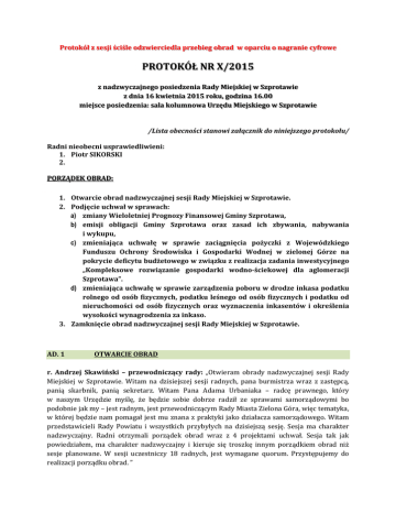 Protokół z sesji ściśle odzwierciedla przebieg obrad w oparciu o nagranie cyfrowe PROTOKÓŁ NR X/2015 z nadzwyczajnego posiedzenia Rady Miejskiej w Szprotawie z dnia 16 kwietnia 2015 roku, godzina 16.00 miejsce posiedzenia: sala kolumnowa Urzędu Miejskiego w Szprotawie /Lista obecności stanowi załącznik do niniejszego protokołu/ Radni nieobecni usprawiedliwieni: 1. Piotr SIKORSKI 2. PORZĄDEK OBRAD: 1. Otwarcie obrad nadzwyczajnej sesji Rady Miejskiej w Szprotawie. 2. Podjęcie uchwał w sprawach: a) zmiany Wieloletniej Prognozy Finansowej Gminy Szprotawa, b) emisji obligacji Gminy Szprotawa oraz zasad ich zbywania, nabywania i wykupu, c) zmieniająca uchwałę w sprawie zaciągnięcia pożyczki z Wojewódzkiego Funduszu Ochrony Środowiska i Gospodarki Wodnej w zielonej Górze na pokrycie deficytu budżetowego w związku z realizacja zadania inwestycyjnego „Kompleksowe rozwiązanie gospodarki wodno-ściekowej dla aglomeracji Szprotawa”. d) zmieniająca uchwałę w sprawie zarządzenia poboru w drodze inkasa podatku rolnego od osób fizycznych, podatku leśnego od osób fizycznych i podatku od nieruchomości od osób fizycznych oraz wyznaczenia inkasentów i określenia wysokości wynagrodzenia za inkaso. 3. Zamknięcie obrad nadzwyczajnej sesji Rady Miejskiej w Szprotawie. AD. 1 OTWARCIE OBRAD r. Andrzej Skawiński – przewodniczący rady: „Otwieram obrady nadzwyczajnej sesji Rady Miejskiej w Szprotawie. Witam na dzisiejszej sesji radnych, pana burmistrza wraz z zastępcą, panią skarbnik, panią sekretarz. Witam Pana Adama Urbaniaka – radcę prawnego, który w naszym Urzędzie myślę, że będzie sobie dobrze radził ze sprawami samorządowymi bo podobnie jak my – jest radnym, jest przewodniczącym Rady Miasta Zielona Góra, więc tematyka, w której będzie nam pomagał jest mu znana z praktyki jako działacza samorządowego. Witam przedstawicieli Rady Powiatu i wszystkich przybyłych na dzisiejszą sesję. Sesja ma charakter nadzwyczajny. Radni otrzymali porządek obrad wraz z 4 projektami uchwał. Sesja tak jak powiedziałem, ma charakter nadzwyczajny i kieruje się troszkę innym porządkiem obrad niż sesje planowane. W sesji uczestniczy 18 radnych, jest wymagane quorum. Przystępujemy do realizacji porządku obrad. ” Strona |2 AD. 2 PODJĘCIE UCHWAŁ W SPRAWACH: a) zmiany Wieloletniej Prognozy Finansowej Gminy Szprotawa r. Andrzej Skawiński – przewodniczący rady: „Proszę Komisję Budżetu o przedstawienie opinii do projektu uchwały.” r. Monika Zarzecka: „Opinia Komisji Budżetu jest pozytywna.” r. Andrzej Skawiński – przewodniczący rady: „Otwieram dyskusję w temacie.” BRAK DYSKUSJI r. Andrzej Skawiński – przewodniczący rady: „Projekt uchwały poddaję pod głosowanie.” Rada jednomyślnie 18”za”, 0”przeciw”, 0”wstrz.” uchwałę podjęła. Uchwała o numerze X/47/2015 stanowi załącznik do niniejszego protokołu. b) emisji obligacji Gminy Szprotawa oraz zasad ich zbywania, nabywania i wykupu r. Andrzej Skawiński – przewodniczący rady: „Proszę Komisję Budżetu o przedstawienie opinii do projektu uchwały.” r. Monika Zarzecka: „Opinia Komisji Budżetu jest pozytywna.” r. Andrzej Skawiński – przewodniczący rady: „Otwieram dyskusję w temacie.” GŁOS ZABRALI: r. Ryszard Barylak: ”W sprawie uchwały dotyczącej obligacji chciałem zabrać swój głos i wypowiedzieć kilka zdań, a mianowicie chodzi mi o wielkość o wysokość obligacji, które planuje się na kwotę 20 mln. Uważam, że jest to za duże obciążenie. Rozumiem, że potrzeby finansowe gminy są ogromne, że realizujemy potężną inwestycję, za którą trzeba będzie zapłacić – wiadomo, ale nie mniej jednak trochę mnie do tego zmusza troska o spłaty obligacji, które rozłożone bardzo dobrze, że na długie lata do bodajże 2030 roku, może i dłużej do 2031, ale będzie to niezmiernie duże obciążenie. W projekcie uchwały czytam, że te środki uzyskane z emisji obligacji będą na realizację planowanego deficytu w związku z realizacją zadań majątkowych, na zadania realizowane również na ujęty w budżecie gminy dot. inwestycji bieżącej tzn. praktycznie rolnictwo, łowiectwo, transport, łączność, gospodarka mieszkaniowa itd. Obawiam się, czy my tych pieniędzy nie przejemy wypuszczając obligacje, mając środki i wykorzystując je na wszystko. Rozumiem, że gmina nie może się zamknąć. My musimy żyć, inwestować, spłacać długi, tylko czy nie należałoby wybrać jakiś priorytet, maksymalne Protokół nr X/2015 z nadzwyczajnego posiedzenia RM w Sz-wie z dnia 16 kwietnia 2015 roku Strona |3 oszczędności założyć, bo nie wiem, czy ta perspektywa tych lat nas tutaj nie zniszczy. W latach 2028 trzeba będzie wykupić obligacje za 4 mln. To samo 2029, 2030, 2031 po 4 mln. rocznie. To jest wykupienie samych obligacji, a my nie emitujemy tylko obligacji, ale również zaciągamy kredyt i wszelkiego rodzaju pożyczki, a więc obciążenia są niesamowite. Mógłbym powiedzieć, że jako radny i z racji swojego wieku, że nie powinienem się tym martwić bo w latach 2031 i dalej nie wiem czy opatrzność pozwoli mi na tym świecie chodzić i te długi jako mieszkaniec i obywatel ziemi szprotawskiej spłacać, ale są młodzi radni, którzy nie raz głosują za tym, że będą musieli być świadomi, że te obciążenia będą bardzo, bardzo mocne i obawiam się, że za mocne. Dlatego przestrzegam, że to jest za duża kwota obligacji, tym bardziej, że one będą później popędzane pożyczkami, pożyczki obligacjami i koło będzie się zamykało. W § 6 w pkt. 2 jest zapisane, że wydatki związane z wykupem obligacji zostaną pokryte z dochodów własnych gminy. Wiemy jakie będą dochody, za 15 – 20 lat to już prawie wszystko sprzedamy co będzie możliwe – oby były duże ! Dalej jest napisane: lub z przychodów z tytułu zaciąganych kredytów lub emisji w latach 2024-2031, czyli będzie