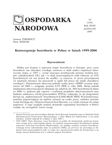 OSPODARKA NARODOWA 10 (194) Rok XVIII październik 2007 Joanna Tyrowicz* Piotr Wójcik* Konwergencja bezrobocia w Polsce w latach 1999-2006 Wprowadzenie Polska jest krajem o najwyżej stopie bezrobocia w Europie, przy czym bezrobocie ma charakter trwałego zarówno w skali makro (najniższa historycznie stopa, w 1997 r., wciąż znacząco przekraczała poziom średniej krajów członkowskich UE), jak i w skali poszczególnych osób (obecnie aż 87% bezrobotnych nie ma prawa do zasiłku, co oznacza, że przez przynajmniej 12 ostatnich miesięcy nie pracowali w ogóle lub praca nie miała charakteru trwałego). Finansowanie aktywnej polityki rynku pracy (APRP) wzrasta stopniowo od 2004 r., osiągając poziom 0,2% PKB w roku 2006. Wciąż jednak działaniami aktywizacyjnymi obejmuje się zaledwie ok. 20% bezrobotnych (dane za 2006 r.), podczas gdy raporty z realizacji projektów aktywizacyjnych oraz badania ankietowe wśród pracowników PUP-ów wskazują, że do programów kieruje się „najłatwiejszych” bezrobotnych [CASE-MGiP, 2004]. W konsekwencji, pomimo poprawiającej się ogólnie sytuacji na rynku pracy, niektóre powiaty wciąż borykają się z 40-procentowym bezrobociem, a w wielu sytuacja nie ulega poprawie. Z tego względu analiza dynamiki regionalnej bezrobocia w Polsce wydaje się szczególnie warta uwagi. * Joanna Tyrowicz jest pracownikiem Katedry Teorii Rozwoju Gospodarczego na Wydziale Nauk Ekonomicznych Uniwersytetu Warszawskiego, a Piotr Wójcik jest doktorantem w tej samej katedrze. Artykuł wpłynął do redakcji w lipcu 2007 r. GUS (2007). Dane dotyczące czasu bezrobocia są trudne do interpretacji, ponieważ powiatowe urzędy pracy sprawozdają jedynie, ilu spośród zarejestrowanych bezrobotnych spełnia ustawowe kryterium bezrobocia długotrwałego, nie podając średniej trwałości bezrobocia. Z drugiej strony indywidualne dane na podstawie BAEL, po pierwsze nie pozwalają na śledzenie losów poszczególnych osób, co wiąże się z ograniczonym polem do interpretacji, a po drugie inaczej definiowane jest w ankiecie pojęcie bezrobocia. GOSPODARKA NARODOWA Nr 10/2007 Według wielu badaczy bezrobocie w Polsce ma w 80% charakter strukturalny [Socha i Sztanderska, 2001], jednak ten szacunek dotyczy zarówno bezrobocia strukturalnego sensu largo, jak i stricte niedopasowań przestrzennych i sektorowych na rynku pracy. Co więcej, generalnie poza niską mobilnością przestrzenną pracowników w Polsce, nie wydaje się, aby samo określenie bezrobocia mianem strukturalnego mogło w pełni wyjaśniać charakter i dynamikę zróżnicowań regionalnych. Artykuł podejmuje tę kwestię, stosując technikę jądrowych estymatorów funkcji gęstości, by prześledzić procesy konwergencji stóp bezrobocia w polskich powiatach. Ramy czasowe określane są momentem przeprowadzenia w Polsce reformy administracyjnej (dane rejonowe sprzed stycznia 1999 r. nie są ściśle porównywalne ze sprawozdawanymi od 1999 r. przez powiatowe urzędy pracy, ponieważ często zakresy terytorialne funkcjonowania tych urzędów nie pokrywają się). Mimo to obejmują one tzw. drugą falę bezrobocia [Boni, 2001] oraz zmiany w polityce rynku pracy związane z wprowadzeniem w życie ustawy o instytucjach rynku pracy i promocji zatrudnienia z 2004 r. z późniejszymi zmianami, jak również z przystąpieniem Polski do Unii Europejskiej i wynikającym bezpośrednio z tego faktu wdrażaniem Europejskiego Funduszu Społecznego. Hipoteza o strukturalnym charakterze bezrobocia w Polsce sugerowałaby przede wszystkim konwergencję klubów, w ramach której regiony o wyższej stopie bezrobocia przejawiałyby podobną dynamikę, podczas gdy rosnąć powinno regionalne zróżnicowanie pomiędzy powiatami o niskiej i wysokiej stopie bezrobocia (dywergencja poziomów). Podobne wnioski nasuwałaby często eksponowana hipoteza o roli historii i procesów społecznych (powiaty o dużym udziale przemysłu przed 1989 rokiem lub powiaty o wysokim udziale rolnictwa znacjonalizowanego). W tym przypadku należałoby oczekiwać zaobserwowania tzw. biegunów wzrostu, czyli regionów, w których względna stopa bezrobocia maleje na tle pozostałych, które wciąż borykają się ze spuścizną poprzedniego systemu gospodarczego. Następna sekcja omawia literaturę przedmiotu – prezentujemy dorobek związany z regionalną dynamiką zachowania się stóp bezrobocia zarówno w Polsce, jak i na świece. Później uwaga została poświęcona specyfice dostępnych danych. Następnie przechodzimy do omówienia metodologii badań w tym obszarze, a także techniki estymacji jądrowej warunkowej funkcji gęstości (KDE). Późniejsze dwie sekcje przedstawiają wyniki analiz dla konwergencji s oraz b (ta ostatnia zarówno w ujęciu bezwarunkowym, jak i warunkowym). Ostatnia część przedstawia wnioski. Przegląd literatury W literaturze występują dwie główne koncepcje konwergencji: sigma oraz beta [Sala-i-Martin, 1990]. Zgodnie z tą terminologią pierwsza z nich zacho Przegląd literatury znaleźć można np. w [Pritchett, 1997], [Temple, 1999], [de la Fuente, 2000], [Barro, Sala-i-Martin, 2003]. Joanna Tyrowicz, Piotr Wójcik, Konwergencja bezrobocia w Polsce w latach 1999-2006 dzi, kiedy dyspersja badanego zjawiska między regionami lub krajami maleje wraz z upływem czasu. Pojęcie konwergencji sigma wiąże się z odchyleniem standardowym jako miarą rozproszenia rozkładu. Konwergencja beta dotyczy natomiast zależności między średnią wartością badanego zjawiska a jego wartością początkową. Obie te koncepcje można analizować w dwóch wariantach: bezwzględnej i względnej. W pierwszej, podmioty (powiaty) upodobniają się do siebie niezależnie od warunków początkowych, co oznaczałoby, że np. rejony o wyższej stopie bezrobocia rozwiązują problemy rynku pracy szybciej niż te o niższej stopie. W ramach koncepcji konwergencji warunkowej oczekujemy upodobnienia zaledwie pomiędzy podmiotami (p