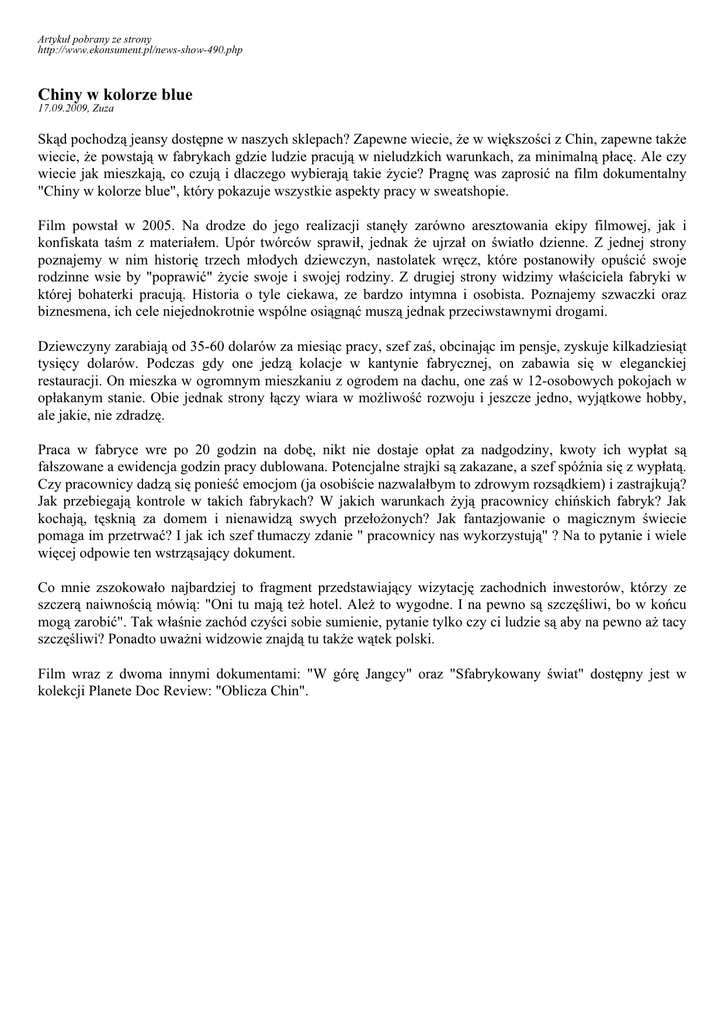 Artykuł pobrany ze strony http://www.ekonsument.pl/news-show-490.php Chiny w kolorze blue 17.09.2009, Zuza Skąd pochodzą jeansy dostępne w naszych sklepach? Zapewne wiecie, że w większości z Chin, zapewne także wiecie, że powstają w fabrykach gdzie ludzie pracują w nieludzkich warunkach, za minimalną płacę. Ale czy wiecie jak mieszkają, co czują i dlaczego wybierają takie życie? Pragnę was zaprosić na film dokumentalny "Chiny w kolorze blue", który pokazuje wszystkie aspekty pracy w sweatshopie. Film powstał w 2005. Na drodze do jego realizacji stanęły zarówno aresztowania ekipy filmowej, jak i konfiskata taśm z materiałem. Upór twórców sprawił, jednak że ujrzał on światło dzienne. Z jednej strony poznajemy w nim historię trzech młodych dziewczyn, nastolatek wręcz, które postanowiły opuścić swoje rodzinne wsie by "poprawić" życie swoje i swojej rodziny. Z drugiej strony widzimy właściciela fabryki w której bohaterki pracują. Historia o tyle ciekawa, ze bardzo intymna i osobista. Poznajemy szwaczki oraz biznesmena, ich cele niejednokrotnie wspólne osiągnąć muszą jednak przeciwstawnymi drogami. Dziewczyny zarabiają od 35-60 dolarów za miesiąc pracy, szef zaś, obcinając im pensje, zyskuje kilkadziesiąt tysięcy dolarów. Podczas gdy one jedzą kolacje w kantynie fabrycznej, on zabawia się w eleganckiej restauracji. On mieszka w ogromnym mieszkaniu z ogrodem na dachu, one zaś w 12-osobowych pokojach w opłakanym stanie. Obie jednak strony łączy wiara w możliwość rozwoju i jeszcze jedno, wyjątkowe hobby, ale jakie, nie zdradzę. Praca w fabryce wre po 20 godzin na dobę, nikt nie dostaje opłat za nadgodziny, kwoty ich wypłat są fałszowane a ewidencja godzin pracy dublowana. Potencjalne strajki są zakazane, a szef spóźnia się z wypłatą. Czy pracownicy dadzą się ponieść emocjom (ja osobiście nazwalałbym to zdrowym rozsądkiem) i zastrajkują? Jak przebiegają kontrole w takich fabrykach? W jakich warunkach żyją pracownicy chińskich fabryk? Jak kochają, tęsknią za domem i nienawidzą swych przełożonych? Jak fantazjowanie o magicznym świecie pomaga im przetrwać? I jak ich szef tłumaczy zdanie " pracownicy nas wykorzystują" ? Na to pytanie i wiele więcej odpowie ten wstrząsający dokument. Co mnie zszokowało najbardziej to fragment przedstawiający wizytację zachodnich inwestorów, którzy ze szczerą naiwnością mówią: "Oni tu mają też hotel. Ależ to wygodne. I na pewno są szczęśliwi, bo w końcu mogą zarobić". Tak właśnie zachód czyści sobie sumienie, pytanie tylko czy ci ludzie są aby na pewno aż tacy szczęśliwi? Ponadto uważni widzowie znajdą tu także wątek polski. Film wraz z dwoma innymi dokumentami: "W górę Jangcy" oraz "Sfabrykowany świat" dostępny jest w kolekcji Planete Doc Review: "Oblicza Chin".