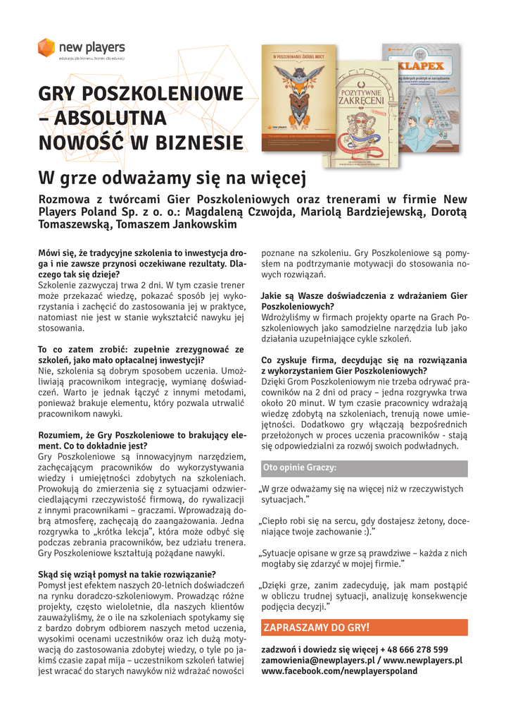 GRY POSZKOLENIOWE – ABSOLUTNA NOWOŚĆ W BIZNESIE W grze odważamy się na więcej Rozmowa z twórcami Gier Poszkoleniowych oraz trenerami w firmie New Players Poland Sp. z o. o.: Magdaleną Czwojda, Mariolą Bardziejewską, Dorotą Tomaszewską, Tomaszem Jankowskim Mówi się, że tradycyjne szkolenia to inwestycja droga i nie zawsze przynosi oczekiwane rezultaty. Dlaczego tak się dzieje? Szkolenie zazwyczaj trwa 2 dni. W tym czasie trener może przekazać wiedzę, pokazać sposób jej wykorzystania i zachęcić do zastosowania jej w praktyce, natomiast nie jest w stanie wykształcić nawyku jej stosowania. To co zatem zrobić: zupełnie zrezygnować ze szkoleń, jako mało opłacalnej inwestycji? Nie, szkolenia są dobrym sposobem uczenia. Umożliwiają pracownikom integrację, wymianę doświadczeń. Warto je jednak łączyć z innymi metodami, ponieważ brakuje elementu, który pozwala utrwalić pracownikom nawyki. Rozumiem, że Gry Poszkoleniowe to brakujący element. Co to dokładnie jest? Gry Poszkoleniowe są innowacyjnym narzędziem, zachęcającym pracowników do wykorzystywania wiedzy i umiejętności zdobytych na szkoleniach. Prowokują do zmierzenia się z sytuacjami odzwierciedlającymi rzeczywistość firmową, do rywalizacji z innymi pracownikami – graczami. Wprowadzają dobrą atmosferę, zachęcają do zaangażowania. Jedna rozgrywka to „krótka lekcja”, która może odbyć się podczas zebrania pracowników, bez udziału trenera. Gry Poszkoleniowe kształtują pożądane nawyki. Skąd się wziął pomysł na takie rozwiązanie? Pomysł jest efektem naszych 20-letnich doświadczeń na rynku doradczo-szkoleniowym. Prowadząc różne projekty, często wieloletnie, dla naszych klientów zauważyliśmy, że o ile na szkoleniach spotykamy się z bardzo dobrym odbiorem naszych metod uczenia, wysokimi ocenami uczestników oraz ich dużą motywacją do zastosowania zdobytej wiedzy, o tyle po jakimś czasie zapał mija – uczestnikom szkoleń łatwiej jest wracać do starych nawyków niż wdrażać nowości poznane na szkoleniu. Gry Poszkoleniowe są pomysłem na podtrzymanie motywacji do stosowania nowych rozwiązań. Jakie są Wasze doświadczenia z wdrażaniem Gier Poszkoleniowych? Wdrożyliśmy w firmach projekty oparte na Grach Poszkoleniowych jako samodzielne narzędzia lub jako działania uzupełniające cykle szkoleń. Co zyskuje firma, decydując się na rozwiązania z wykorzystaniem Gier Poszkoleniowych? Dzięki Grom Poszkoleniowym nie trzeba odrywać pracowników na 2 dni od pracy – jedna rozgrywka trwa około 20 minut. W tym czasie pracownicy wdrażają wiedzę zdobytą na szkoleniach, trenują nowe umiejętności. Dodatkowo gry włączają bezpośrednich przełożonych w proces uczenia pracowników - stają się odpowiedzialni za rozwój swoich podwładnych. Oto opinie Graczy: „W grze odważamy się na więcej niż w rzeczywistych sytuacjach.” „Ciepło robi się na sercu, gdy dostajesz żetony, doceniające twoje zachowanie :).” „Sytuacje opisane w grze są prawdziwe – każda z nich mogłaby się zdarzyć w mojej firmie.” „Dzięki grze, zanim zadecyduję, jak mam postąpić w obliczu trudnej sytuacji, analizuję konsekwencje podjęcia decyzji.” ZAPRASZAMY DO GRY! zadzwoń i dowiedz się więcej + 48 666 278 599 [email protected] / www.newplayers.pl www.facebook.com/newplayerspoland
