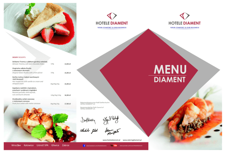 DESERY DESSERTS Delikatne Tiramisu z płatkami gorzkiej czekolady Delicate Tiramisu with dark chocolate flakes 120g 13,90 zł Oryginalna włoska Ricotta z owocowym akcentem Original Italian Ricotta with a hint of fruit 150g 15,90 zł Gorące maliny z lodami waniliowymi i bitą śmietaną Hot raspberries with vanilla ice cream and whipped cream 80g/90g/20g 15,90 zł Zapiekane naleśniki z kajmakiem, orzechami i prażonymi migdałami Roasted pancakes with kaymak, nuts and burnt almonds 120g/30g/150g 16,90 zł Orzeźwiający sorbet owocowy z melonowym concasse Fresh fruit sorbet with melon concasse 80g/90g/20g 17,90 zł DIAMENT Rekomendowane przez Radę Szefów Kuchni HOTELE DIAMENT S.A. Recommended by Chefs Council of HOTELE DIAMENT S.A. www.hotelediament.pl Wrocław Katowice Ustroń SPA Gliwice Zabrze www.facebook.com/HoteleDiament www.cateringdiament.pl www.youtube.com/user/HoteleDiament SAŁATKI SALADS Pikantna pierś z kurczaka na sałacie rzymskiej z miodowo - cytrynowym vinaigrette, pomidorkami cherry, świeżą pomarańczą i miętą Spicy chicken breast on Romaine lettuce with honey-lemon vinaigrette, cherry tomatoes, fresh orange and mint Panierowany w ziarnach słonecznika Camembert na bukiecie chrupiących sałat z sosem żurawinowo - winnym Sunflower seed crusted Camembert on salad mix with cranberry-wine sauce Sałatka z soczewicy z faszerowanym sercem karczocha i filetami cytrusów Lentil salad with stuffed artichoke hearts and citrus fillets 250g 21,90 zł 250g 23,90 zł RYBY I OWOCE MORZA 250g 25,90 zł PRZYSTAWKI STARTERS Bruschetta z guacamole i tuńczykiem Bruschetta with guacamole and tuna Tatar ze śledzia z pieczonymi ziemniakami, podany z flambirowanymi jabłkami i konfiturą z czerwonej cebuli Herring tartare with roasted potatoes, served with flambé apples and red onion jam Grillowana cukinia z prosciutto i orzeszkami pini w oliwie aromatyzowanej rozmarynem Grilled courgette with prosciutto and pine nuts in rosemary olive oil Carpaccio z polędwicy wołowej z kaparami, rukolą i świeżo tartym Parmezanem Beef carpaccio with capers, rocket salad and grated Parmesan cheese 180g 150g/20g 120g 80g/130g 17,90 zł 19,90 zł 25,90 zł 27,90 zł ZUPY SOUPS Zupa cebulowa z serem Mimolette zapieczonym na grzance Onion soup with Mimolette cheese, roasted on toast Tradycyjny polski rosół z makaronem Traditional Polish broth with noodles Zupa kokosowa z kurczakiem i makaronem Wonton Coconut soup with chicken and Wonton noodles 220ml/50g 220ml 220ml 13,90 zł 13,90 zł DANIA GŁÓWNE MAIN COURSES Delikatna pierś z kurczaka aromatyzowana czosnkiem i imbirem, podana z grillowanymi ziemniakami, groszkiem cukrowym i pieczonymi pomidorami koktajlowymi Delicate chicken breast flavoured with garlic and ginger, served with grilled potatoes, green peas and roasted cherry tomatoes Polędwiczka wieprzowa w sosie gorgonzola z kluseczkami ziołowymi i bukietem gotowanych warzyw Pork fillet in gorgonzola sauce with herb dumplings and boiled vegetables Pieczone udko kaczki podane na flambirowanych jabłkach z żurawiną, z ciemnymi kluskami i czerwoną kapustą Roasted duck leg, served on flambé apples with cranberry, dark dumplings and red cabbage Stek z polędwicy wołowej zapiekany z gruszką, serem Roquefort, z ziemniaczanym puree i zielonym pieprzem Sirloin steak roasted with pear, Roquefort cheese, with mashed potatoes and green pepper Katowice Ustroń SPA Gliwice 160g/150g/150g 300g/150g/150g 160g/150g/150g 27,90 zł 45,90 zł 53,90 zł 67,90 zł Stek z łososia na makaronie pappardelle w śmietanie, podany z brokułami smażonymi na maśle Salmon steak on pappardelle pasta in cream sauce, served with broccoli sauteed in butter 120g/150g/140g 37,90 zł Krewetki Black Tiger smażone na maśle z kolendrą, na sosie z papryki chilli i mango, podane z dzikim ryżem Black Tiger prawns sauteed in butter with coriander, on chilli-mango sauce, served with wild rice 7szt/30g/100g 47,90 zł Sandacz z grilla na warzywnym tagliatelle, podany z tartą ziemniaczaną i sosem na winie Muscat Grilled pike perch on vegetable tagliatelle, served with potato tart and Muscat wine sauce 160g/150g/150g 53,90 zł Pieczona dorada podana z grillowanymi warzywami i sosem bazyliowym Roasted sea bream served with grilled vegetables and basil sauce 250g/160g/50g 55,90 zł Penne z pomidorkami cherry i świeżą bazylią Penne pasta with cherry tomatoes and fresh basil 300g 23,90zł Tagliatelle z aromatycznymi grzybami leśnymi i płatkami świeżo tartego Parmezanu Tagliatelle with aromatic mushrooms and freshly grated Parmesan cheese 300g 23,90 zł Farfalle z wędzonym łososiem i ziołami Farfalle pasta with smoked salmon and herbs 300g 27,90 zł MAKARONY PASTA 17,90 zł Danie wegetariańskie Wrocław 150g/150g/140g FISH AND SEAFOOD Zabrze Wrocław suitable for vegetarians Katowice Ustroń SPA Gliwice Zabrze Wrocław Katowice Ustroń SPA Gliwice Zabrze