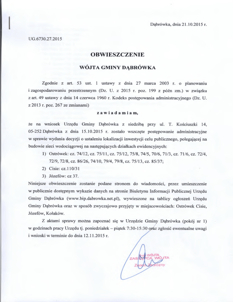 Dąbrówka, dnia 21.10.2015 r. UG.6730.27.2015 OBWIESZCZENIE WÓJTA GMINY DĄBRÓWKA Zgodnie z art. 53 ust. 1 ustawy z dnia 27 marca 2003 r. o planowaniu i zagospodarowaniu przestrzennym (Dz. U. z 2015 r. poz. 199 z późn zm.) w związku z art. 49 ustawy z dnia 14 czerwca 1960 r. Kodeks postępowania administracyjnego (Dz. U. z 2013 r. poz. 267 ze zmianami) zawiadamiam, że na wniosek Urzędu Gminy Dąbrówka z siedzibą przy ul. T. Kościuszki 14, 05-252 Dąbrówka z dnia 15.10.2015 r. zostało wszczęte postępowanie administracyjne w sprawie wydania decyzji o ustaleniu lokalizacji inwestycji celu publicznego, polegającej na budowie sieci wodociągowej na następujących działkach ewidencyjnych: 1) Ostrówek: cz. 74/12, cz. 75/11, cz. 75/12, 75/8, 74/5, 70/6, 71/3, cz. 71/6, cz. 72/4, 72/9, 72/8, cz. 86/26, 74/10, 79/4, 79/8, cz. 75/13, cz. 85/37; 2) Cisie: cz. 110/31 3) Józefów: cz 37. Niniejsze obwieszczenie zostanie podane stronom do wiadomości, przez umieszczenie w publicznie dostępnym wykazie danych na stronie Biuletynu Informacji Publicznej Urzędu Gminy Dąbrówka (www.bip.dabrowka.net.pl), wywieszone na tablicy ogłoszeń Urzędu Gminy Dąbrówka oraz w sposób zwyczajowo przyjęty w miejscowościach: Ostrówek Cisie, Józefów, Kołaków. Z aktami sprawy można zapoznać się w Urzędzie Gminy Dąbrówka (pokój nr 1) w godzinach pracy Urzędu tj. poniedziałek - piątek 7:30-15:30 gróz zgłosić ewentualne uwagi i wnioski w terminie do dnia 12.11.2015 r.