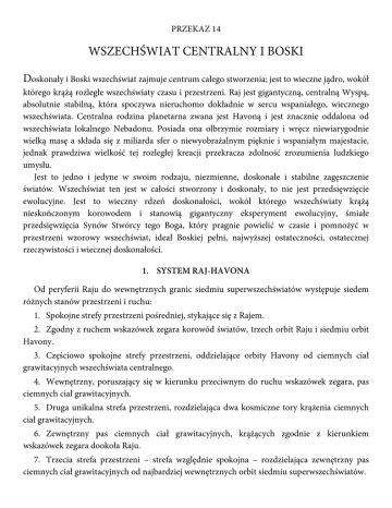 PRZEKAZ 14 WSZECHŚWIAT CENTRALNY I BOSKI Doskonały i Boski wszechświat zajmuje centrum całego stworzenia; jest to wieczne jądro, wokół którego krążą rozległe wszechświaty czasu i przestrzeni. Raj jest gigantyczną, centralną Wyspą, absolutnie stabilną, która spoczywa nieruchomo dokładnie w sercu wspaniałego, wiecznego wszechświata. Centralna rodzina planetarna zwana jest Havoną i jest znacznie oddalona od wszechświata lokalnego Nebadonu. Posiada ona olbrzymie rozmiary i wręcz niewiarygodnie wielką masę a składa się z miliarda sfer o niewyobrażalnym pięknie i wspaniałym majestacie, jednak prawdziwa wielkość tej rozległej kreacji przekracza zdolność zrozumienia ludzkiego umysłu. Jest to jedno i jedyne w swoim rodzaju, niezmienne, doskonałe i stabilne zagęszczenie światów. Wszechświat ten jest w całości stworzony i doskonały, to nie jest przedsięwzięcie ewolucyjne. Jest to wieczny rdzeń doskonałości, wokół którego wszechświaty krążą nieskończonym korowodem i stanowią gigantyczny eksperyment ewolucyjny, śmiałe przedsięwzięcia Synów Stwórcy tego Boga, który pragnie powielić w czasie i pomnożyć w przestrzeni wzorowy wszechświat, ideał Boskiej pełni, najwyższej ostateczności, ostatecznej rzeczywistości i wiecznej doskonałości. 1. SYSTEM RAJ-HAVONA Od peryferii Raju do wewnętrznych granic siedmiu superwszechświatów występuje siedem różnych stanów przestrzeni i ruchu: 1. Spokojne strefy przestrzeni pośredniej, stykające się z Rajem. 2. Zgodny z ruchem wskazówek zegara korowód światów, trzech orbit Raju i siedmiu orbit Havony. 3. Częściowo spokojne strefy przestrzeni, oddzielające orbity Havony od ciemnych ciał grawitacyjnych wszechświata centralnego. 4. Wewnętrzny, poruszający się w kierunku przeciwnym do ruchu wskazówek zegara, pas ciemnych ciał grawitacyjnych. 5. Druga unikalna strefa przestrzeni, rozdzielająca dwa kosmiczne tory krążenia ciemnych ciał grawitacyjnych. 6. Zewnętrzny pas ciemnych ciał grawitacyjnych, krążących zgodnie z kierunkiem wskazówek zegara dookoła Raju. 7. Trzecia strefa przestrzeni – strefa względnie spokojna – rozdzielająca zewnętrzny pas ciemnych ciał grawitacyjnych od najbardziej wewnętrznych orbit siedmiu superwszechświatów. Miliard światów Havony jest rozłożonych na siedmiu koncentrycznych orbitach, bezpośrednio otaczających trzy orbity satelitów Raju. Ponad trzydzieści pięć milionów światów jest na najbardziej wewnętrznej orbicie Havony i ponad dwieście czterdzieści pięć milionów na najbardziej zewnętrznej, z proporcjonalną liczbą światów pośrodku. Każda orbita jest inna, ale wszystkie one są doskonale zrównoważone i znakomicie zorganizowane a każda z nich przesycona jest wyspecjalizowanym reprezentantem Nieskończonego Ducha, jednym z Siedmiu Duchów Orbit. Nieosobowy Duch, w dodatku do innych funkcji, koordynuje bieg spraw niebiańskich na każdej orbicie. Orbity planet Havony nie układają się warstwowo; ich światy podążają uporządkowanym korowodem jeden za drugim. Wszechświat centralny krąży wokół stacjonarnej Wyspy Raj w jednej, rozległej płaszczyźnie, składającej się z dziesięciu współśrodkowych, stabilnych zespołów – trzech orbit sfer Raju i siedmiu orbit światów Havony. Fizycznie biorąc, orbity Havony i Raju stanowią jeden i ten sam system, podział wynika z ich segregacji funkcjonalnej i administracyjnej. Czasu nie liczy się w Raju; sekwencja kolejnych zdarzeń jest nieodłączna pojmowaniu tych, którzy są rodowitymi mieszkańcami centralnej Wyspy. Jednak czas związany jest z orbitami Havony i licznymi istotami na nich przebywającymi, zarówno niebiańskiego jak i ziemskiego pochodzenia. Każdy świat Havony ma swój czas lokalny, ustalony przez jego obieg. Wszystkie światy na danej orbicie mają taką samą długość roku, ponieważ krążą równomiernie wokół Raju a długość roku planetarnego zmniejsza się, od orbity najbardziej zewnętrznej do najbardziej wewnętrznej. Oprócz czasu obiegu po orbicie Havony, istnieje standartowy dzień Raju-Havony oraz inne określania czasowe, ustalane na siedmiu rajskich satelitach Nieskończonego Ducha i stamtąd wysyłane. Standartowy dzień Raju-Havony oparty jest na tym upływie czasu, jaki jest potrzebny do dokonania jednego obiegu dookoła Wyspy Raj przez planetarne mieszkania, znajdujące się na pierwszej albo wewnętrznej orbicie Havony i chociaż ich prędkość jest ogromna, dzięki ich położeniu pomiędzy ciemnymi ciałami grawitacyjnymi a gigantycznym Rajem, potrzeba prawie tysiąca lat, aby te sfery dopełniły swego obiegu. Bezwiednie czytaliście prawdę, gdy oczy wasze spoczęły na wypowiedzi: „Bo tysiąc lat w oczach Boga jest jak dzień, który minął, niby straż nocna”. Jeden dzień Raju-Havony jest tylko o siedem minut, trzy i jedna ósma sekundy krótszy, niż tysiąc lat obecnego kalendarza Urantii, opartego na roku przestępnym. Ten dzień Raju-Havony jest standartową jednostką czasu dla siedmiu superwszechświatów, chociaż każdy z nich zachowuje swoje własne, wewnętrzne standardy czasowe. Na krańcach rozległego wszechświata centralnego, daleko poza siódmym pasem światów Havony, krąży niewiarygodna ilość olbrzymich, ciemnych ciał grawitacyjnych. Ten bezmiar ciemnych mas pod wieloma względami nie przypomina wcale innych ciał niebieskich; nawet w swej formie są one bardzo odmienne. Ciemne ciała grawitacyjne ani nie odbijają ani nie pochłaniają światła; nie reagują z fizyczno-energetycznym światłem i tak kompletnie okalają i spowijają Havonę, jak gdyby ją skrywały przed wzrokiem nawet najbliższych, zamieszkałych wszechświatów czasu i przestrzeni. Unikalna szczelina przestrzenna rozdziela wielki pas ciemnych ciał grawitacyjnych na dwie eliptyczne orbity. Wewnętrzny pas obraca się w kierunku przeciwnym ruchowi wskazówek zegara; zewnętrzny obraca się w kie