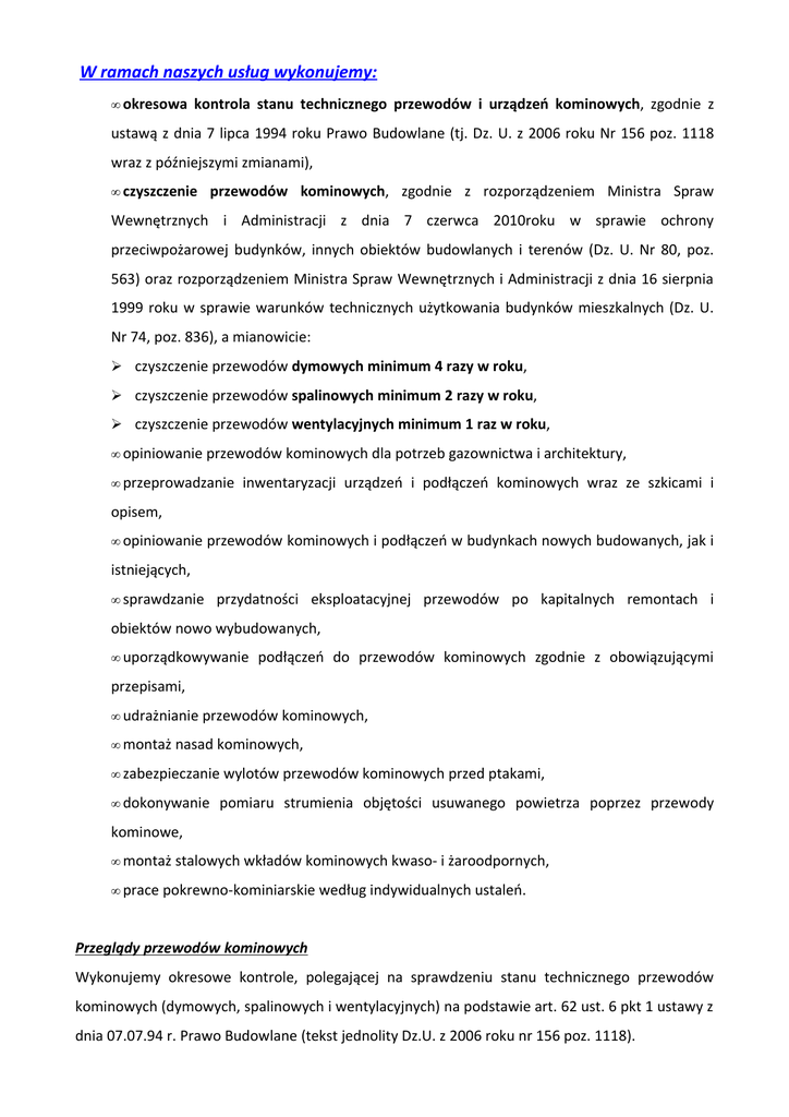 W ramach naszych usług wykonujemy: • okresowa kontrola stanu technicznego przewodów i urządzeń kominowych, zgodnie z ustawą z dnia 7 lipca 1994 roku Prawo Budowlane (tj. Dz. U. z 2006 roku Nr 156 poz. 1118 wraz z późniejszymi zmianami), • czyszczenie przewodów kominowych, zgodnie z rozporządzeniem Ministra Spraw Wewnętrznych i Administracji z dnia 7 czerwca 2010roku w sprawie ochrony przeciwpożarowej budynków, innych obiektów budowlanych i terenów (Dz. U. Nr 80, poz. 563) oraz rozporządzeniem Ministra Spraw Wewnętrznych i Administracji z dnia 16 sierpnia 1999 roku w sprawie warunków technicznych użytkowania budynków mieszkalnych (Dz. U. Nr 74, poz. 836), a mianowicie: czyszczenie przewodów dymowych minimum 4 razy w roku, czyszczenie przewodów spalinowych minimum 2 razy w roku, czyszczenie przewodów wentylacyjnych minimum 1 raz w roku, • opiniowanie przewodów kominowych dla potrzeb gazownictwa i architektury, • przeprowadzanie inwentaryzacji urządzeń i podłączeń kominowych wraz ze szkicami i opisem, • opiniowanie przewodów kominowych i podłączeń w budynkach nowych budowanych, jak i istniejących, • sprawdzanie przydatności eksploatacyjnej przewodów po kapitalnych remontach i obiektów nowo wybudowanych, • uporządkowywanie podłączeń do przewodów kominowych zgodnie z obowiązującymi przepisami, • udrażnianie przewodów kominowych, • montaż nasad kominowych, • zabezpieczanie wylotów przewodów kominowych przed ptakami, • dokonywanie pomiaru strumienia objętości usuwanego powietrza poprzez przewody kominowe, • montaż stalowych wkładów kominowych kwaso- i żaroodpornych, • prace pokrewno-kominiarskie według indywidualnych ustaleń. Przeglądy przewodów kominowych Wykonujemy okresowe kontrole, polegającej na sprawdzeniu stanu technicznego przewodów kominowych (dymowych, spalinowych i wentylacyjnych) na podstawie art. 62 ust. 6 pkt 1 ustawy z dnia 07.07.94 r. Prawo Budowlane (tekst jednolity Dz.U. z 2006 roku nr 156 poz. 1118). Wykonujemy przeglądy przewodów kominowych w budynkach: • wspólnot mieszkaniowych • mieszkalnych jednorodzinnych • mieszkalnych wielorodzinnych • użytkowych • gospodarczych • garaże • inne Odbiór przewodów kominowych w stanie surowym i użytkowym Wykonujemy odbiory przewodów kominowych w budynkach: • mieszkalnych jednorodzinnych • mieszkalnych wielorodzinnych • użytkowych • garaże • inne w stanie surowym i użytkowym. Opinia Kominiarska do urządzeń grzewczo - kominowych Wykonujemy Opinie Kominiarskie do urządzeń grzewczo - kominowych (gazowe, olejowe, węglowe, kominki i wentylacyjne). Czyszczenie i udrażnianie przewodów kominowych Wykonujemy czyszczenia i udrożnienia przewodów kominowych • wentylacyjnych • spalinowych • dymowych • inne w budynkach jednorodzinnych i wielorodzinnych i użytkowych na indywidualne za mówienie, zlecenia oraz umowy. Montaż wkładów kominowych Wysoka sprawność kotłów grzewczych wymusza stosowanie wkładów kominowych chroniących istniejące już kominy murowane przed działaniem skroplin (kondensatu). Proste przewody z blachy kwasoodpornej w odcinkach: 1m; 0,5m; i 0,30m, o grubości 0,6mm charakteryzują się wysoką szczelnością (rury spawane techniką plazmową), prostotą montażu i gwarantują dużą sztywność konstrukcji. Oferta dla Wspólnot Mieszkaniowych Obsługujemy Wspólnoty Mieszkaniowe Nieruchomości w zakresie: • Okresowe przeglądy przewodów kominowych • Czyszczenie przewodów kominowych • Udrażnianie przewodów kominowych • Usuwanie usterek przewodów kominowych • Bezpłatny serwis w przypadku awarii (dotyczy wspólnot mieszkaniowych na stałe korzystających z usług kominiarskich) Serdecznie zapraszamy do współpracy.
