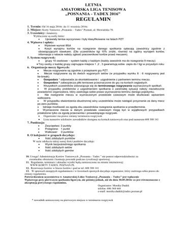 LETNIA AMATORSKA LIGA TENISOWA „POSNANIA - TADEX 2016” REGULAMIN 1. Termin: Od 16 maja 2016r. do 11 września 2016r. 2. Miejsce: Korty Tenisowe „Posnania – Tadex” Poznań, ul. Słowiańska 78. 3. Uczestnicy: Amatorzy. 4. 5. 6. 7. 8. Wykluczone są osoby które: Uprawiały tenisa wyczynowo i były klasyfikowane na listach PZT Wpisowe i opłaty: Wpisowe wynosi 80zł. Koszt wynajmu kortów na rozegranie danego spotkania opłacają zawodnicy zgodnie z obowiązującymi stawkami. (Dla uczestników ligi 10% zniżki, również na ogólny wynajem kortów, informacje o rabacie należy zgłosić pracownikowi kortów przed meczem). System rozgrywek: grupy 10 osobowe – system każdy z każdym (każdy zawodnik ma do rozegrania 9 meczy) Trzy osoby z każdej grupy zajmujące miejsca 1 ,2 , 3 gwarantują sobie zapis do I ligi w przyszłym roku Organizacja meczy ligowych: Mecze rozgrywane są zgodnie z przepisami gry PZT. Mecze rozgrywane są do dwóch wygranych setów (w przypadku wyniku 6 : 6 rozgrywany jest tie-break). Gospodarz * odpowiada za skontaktowanie i uzgodnienie z partnerem terminu meczu. Gospodarz * zabezpiecza piłki tenisowe przeznaczone do gry na kortach ceglastych. Wszystkich uczestników zobowiązuje się do terminowego rozgrywania wyznaczonych spotkań. W przypadku problemów z uzgodnieniem spotkania o zaistniałej sytuacji należy niezwłocznie powiadomić organizatora, który zastrzega sobie prawo wyznaczenia terminu danego pojedynku. Nie rozegranie meczu w wyznaczonym przedziale czasowym może skutkować wpisaniem walkowera. W przypadku stwierdzenia obustronnej winy uczestników może nastąpić przyznanie za dany mecz po zero punktów. Istnieje możliwość za zgodą obu zawodników rozegrania spotkania w przedterminie. Wyznaczone mecze w danym przedziale czasowym mogą być w wyjątkowych przypadkach przełożone tylko za zgodą przeciwnika i prowadzącego rozgrywki. Organizator ma prawo zmiany terminarza rozgrywek Lista numerów telefonów zawodników dostępna na kortach tenisowych oraz pod numerem 608 588 141 Punktacja: Zwycięstwo: 3 punkty Przegrana: 1 punkt Walkower: 0 punktów O kolejności w grupach decyduje: Ilość zdobytych punktów W razie zdobycia takiej samej ilości punktów decyduje: Wynik bezpośredniego spotkania Ilość zdobytych setów Ilość zdobytych gemów 10. Uwaga! Administracja Kortów Tenisowych „Posnania - Tadex ” nie ponosi odpowiedzialności za ewentualne obrażenia i kontuzje powstałe podczas rywalizacji sportowej. 11. Regulamin, terminarz i aktualne wyniki będą zamieszczone na stronie internetowej: WWW.KORTY.TADEX. POZNAN.PL 12. Rezerwacje kortów w biurze kortów i pod nr tel. 608 588 141 13. W sprawach nieujętych regulaminem i w kwestiach spornych decyduje organizator, który zastrzega sobie prawo do zmiany regulaminu. Potwierdzeniem uczestnictwa w Amatorskiej Lidze Tenisowej „Posnania – Tadex” jest wpłacenie Wpisowego przy pierwszym spotkaniu ligowym, nie później jednak, niż do dnia 30.05.2016r co jest równoznaczne z akceptacją powyższego regulaminu. Organizator: Monika Dudek telefon: 606 568 668 e-mail: [email protected] * zawodnik umieszczony na pierwszym miejscu w terminarzu rozgrywek