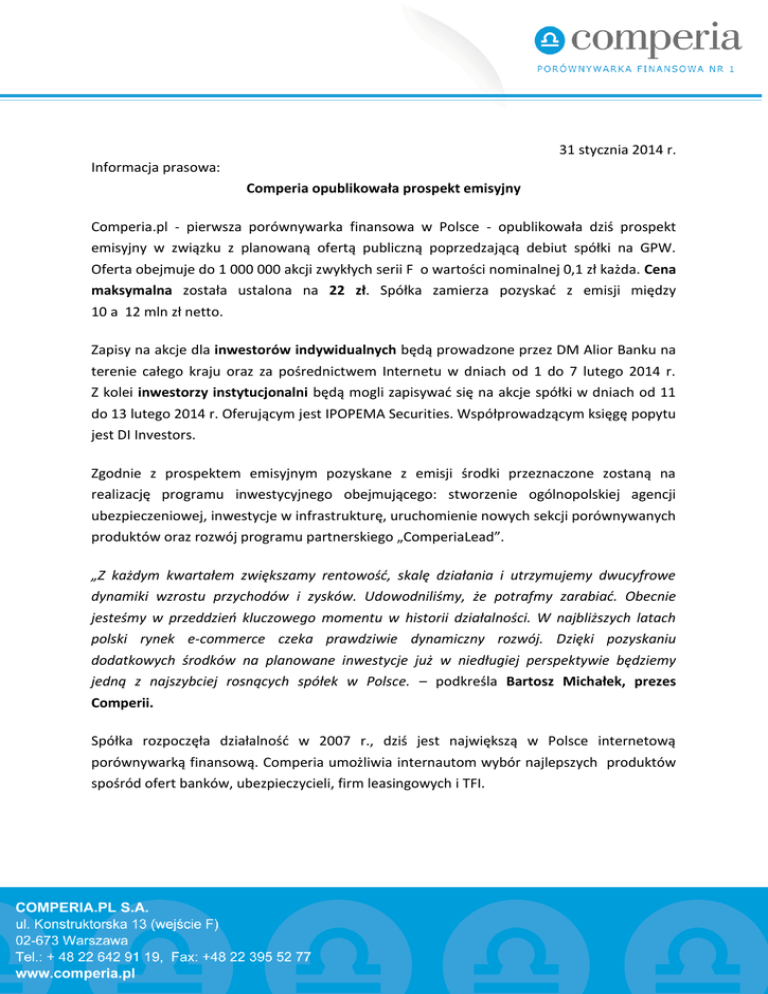 31 stycznia 2014 r. Informacja prasowa: Comperia opublikowała prospekt emisyjny Comperia.pl - pierwsza porównywarka finansowa w Polsce - opublikowała dziś prospekt emisyjny w związku z planowaną ofertą publiczną poprzedzającą debiut spółki na GPW. Oferta obejmuje do 1 000 000 akcji zwykłych serii F o wartości nominalnej 0,1 zł każda. Cena maksymalna została ustalona na 22 zł. Spółka zamierza pozyskać z emisji między 10 a 12 mln zł netto. Zapisy na akcje dla inwestorów indywidualnych będą prowadzone przez DM Alior Banku na terenie całego kraju oraz za pośrednictwem Internetu w dniach od 1 do 7 lutego 2014 r. Z kolei inwestorzy instytucjonalni będą mogli zapisywać się na akcje spółki w dniach od 11 do 13 lutego 2014 r. Oferującym jest IPOPEMA Securities. Współprowadzącym księgę popytu jest DI Investors. Zgodnie z prospektem emisyjnym pozyskane z emisji środki przeznaczone zostaną na realizację programu inwestycyjnego obejmującego: stworzenie ogólnopolskiej agencji ubezpieczeniowej, inwestycje w infrastrukturę, uruchomienie nowych sekcji porównywanych produktów oraz rozwój programu partnerskiego „ComperiaLead”. „Z każdym kwartałem zwiększamy rentowość, skalę działania i utrzymujemy dwucyfrowe dynamiki wzrostu przychodów i zysków. Udowodniliśmy, że potrafmy zarabiać. Obecnie jesteśmy w przeddzień kluczowego momentu w historii działalności. W najbliższych latach polski rynek e-commerce czeka prawdziwie dynamiczny rozwój. Dzięki pozyskaniu dodatkowych środków na planowane inwestycje już w niedługiej perspektywie będziemy jedną z najszybciej rosnących spółek w Polsce. – podkreśla Bartosz Michałek, prezes Comperii. Spółka rozpoczęła działalność w 2007 r., dziś jest największą w Polsce internetową porównywarką finansową. Comperia umożliwia internautom wybór najlepszych produktów spośród ofert banków, ubezpieczycieli, firm leasingowych i TFI. W latach 2010-2013 przychody ze sprzedaży wygenerowane przez spółkę wzrosły z 1,6 mln PLN do 12,8 mln PLN, co oznacza, że średnioroczne tempo wzrostu przychodów w tym okresie wyniosło 102%. Zysk netto wzrósł z 0,4 mln PLN w 2010 roku do 3,1 mln PLN w 2013 r., co oznacza 95% średnioroczne tempo wzrostu. Zarówno w 2011 jak i w 2012 roku Comperia wygenerowała wyższe przychody i wyniki w stosunku do ogłoszonych prognoz. Przeniesienie notowań na główny parkiet Giełdy Papierów Wartościowych w Warszawie planowane jest po zarejestrowaniu przez sąd podwyższenia kapitału. Doradcami spółki w procesie oferty publicznej i przejścia na GPW są IPOPEMA Securities, DI Investors oraz Kancelaria GESSEL, KOZIOROWSKI. Harmonogram oferty Publikacja Prospektu 31 stycznia 2014 roku Okres składania zapisów przez inwestorów od 1 lutego 2014 roku do 7 lutego indywidualnych 2014 roku Proces budowy księgi popytu Ustalenie ostatecznej Ceny Akcji ostatecznej liczby Akcji Oferowanych od 31 stycznia 2014 roku do 10 lutego 2014 roku oraz 10 lutego 2014 roku Okres składania zapisów przez inwestorów od 11 lutego 2014 roku do 13 lutego instytucjonalnych 2014 roku Data przydziału / Zamknięcie Oferty 13 lutego 2014 roku *** O Comperii Comperia jest pierwszą i najbardziej popularną w Polsce internetową porównywarką produktów finansowych. Obecnie za jej pośrednictwem aż kilkanaście tysięcy internautów miesięcznie znajduje produkty finansowe dobrane do swoich potrzeb. Czołowy gracz e-commerce w Polsce Comperia to partner dla wszystkich banków poszukujących klientów w sieci. Jej serwis www.comperia.pl tematycznych w Polsce. jest jednym z najpopularniejszych serwisów Doskonała ekspozycja na zmiany nawyków zakupowych Model biznesowy spółki doskonale współgra z zachodzącymi zmianami zakupowymi. Aktywność konsumencka, również w zakresie zakupu produktów finansowych, przenosi się do Internetu. Polska jest jednym z najszybciej rosnących rynków e-commerce w Unii Europejskiej. Według badań SMB, Kelkoo i Forrester Research, opublikowanych w raporcie „Ecommerce”przez portal Interaktywnie.com z marca 2013 roku, Polska jest w grupie państw Unii Europejskiej charakteryzujących się najszybszym rozwojem rynku ecommerce. Szacunki ekspertów w raporcie z marca 2013 roku wskazują, że polski rynek e- commerce wzrósł w 2012 roku o 23,0% do wartości 21,5 miliarda PLN, zaś wzrost w 2013 roku ma wynieść zgodnie z prognozami około 21,4%. Korzystne perspektywy rozwoju rynku e-commerce w Polsce znajdują potwierdzenie w raporcie „Online Retailing: Britain and Europe 2012” przygotowanym przez Center for Retail Research. Zgodnie z raportem udział kanału online w łącznej sprzedaży detalicznej w Polsce w 2012 roku wyniósł 3,8%, podczas gdy średnia wartość tego wskaźnika dla krajów europejskich analizowanych przez autorów raportu wyniosła 7,6%. Dowodzi to że polski rynek e-commerce posiada duży potencjał wzrostu. Biznes generujący solidne zyski Średnioroczny wzrost przychodów Comperii w latach 2010-2013 wyniósł 102%, EBITDA 133%, zysku netto: 95%. Według prognoz w 2013 r. Comperia ma wypracować 3,1 mln zł zysku netto i 6,1 mln EBITDA przy obrotach sięgających 12,8 mln zł. Marża EBITDA ma wynieść 48%, a marża zysku netto 24%. *** Niniejszy materiał ma wyłącznie charakter promocyjny. Nie stanowi on jakiejkolwiek oferty ani propozycji nabycia instrumentów finansowych, jak również nie należy traktować go jako źródła wiedzy wystarczającej do podjęcia decyzji inwestycyjnej. Jedynym prawnie wiążącym dokumentem zawierającym informacje o emitencie - Comperia.pl S.A. i jego akcjach, w tym ich pierwszej ofercie publicznej, jest prospekt emisyjny zatwierdzony w dniu 30 stycznia 2014 roku przez Komisję Nadzoru Finansowego, który zgodnie z wymogami prawa został w dniu 31 stycznia 2014 roku udostępniony do publicznej wiadomości w postaci elektronicznej, tj. na stronach internetowych; (i) Comperia.p