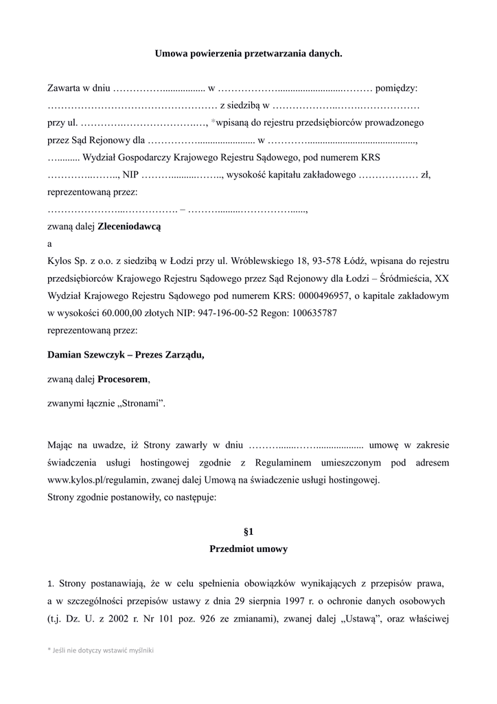 Umowa powierzenia przetwarzania danych. Zawarta w dniu ……………................. w ………………..........................……… pomiędzy: …………………………………………… z siedzibą w ………………..…….……………… przy ul. ………….………………….…, *wpisaną do rejestru przedsiębiorców prowadzonego przez Sąd Rejonowy dla ……………....................... w …………..........................................., …......... Wydział Gospodarczy Krajowego Rejestru Sądowego, pod numerem KRS …………..…….., NIP ………..........…….., wysokość kapitału zakładowego ……………… zł, reprezentowaną przez: …………………...……………. – ……….........……………......, zwaną dalej Zleceniodawcą a Kylos Sp. z o.o. z siedzibą w Łodzi przy ul. Wróblewskiego 18, 93-578 Łódź, wpisana do rejestru przedsiębiorców Krajowego Rejestru Sądowego przez Sąd Rejonowy dla Łodzi – Śródmieścia, XX Wydział Krajowego Rejestru Sądowego pod numerem KRS: 0000496957, o kapitale zakładowym w wysokości 60.000,00 złotych NIP: 947-196-00-52 Regon: 100635787 reprezentowaną przez: Damian Szewczyk – Prezes Zarządu, zwaną dalej Procesorem, zwanymi łącznie „Stronami”. Mając na uwadze, iż Strony zawarły w dniu ……….......……................... umowę w zakresie świadczenia usługi hostingowej zgodnie z Regulaminem umieszczonym pod adresem www.kylos.pl/regulamin, zwanej dalej Umową na świadczenie usługi hostingowej. Strony zgodnie postanowiły, co następuje: §1 Przedmiot umowy 1. Strony postanawiają, że w celu spełnienia obowiązków wynikających z przepisów prawa, a w szczególności przepisów ustawy z dnia 29 sierpnia 1997 r. o ochronie danych osobowych (t.j. Dz. U. z 2002 r. Nr 101 poz. 926 ze zmianami), zwanej dalej „Ustawą”, oraz właściwej * Jeśli nie dotyczy wstawić myślniki realizacji postanowień Umowy o świadczenie usługi hostingowej (zwanej dalej Umową Główną), na rzecz Zleceniodawcy, jako Administrator danych osobowych, powierza Procesorowi do przetwarzania dane osobowe w zakresie określonym niniejszą Umową. 2. Zleceniodawca oświadcza, że jest Administratorem danych osobowych w rozumieniu Ustawy w stosunku do danych powierzonych Procesorowi. §2 Zakres powierzonych danych i cel przetwarzania 3. Administrator danych powierza Procesorowi przetwarzanie danych osobowych, znajdujących się w bazach danych i serwisach internetowych, które w całości lub w części działają z wykorzystaniem zasobów dostarczanych przez Procesora na podstawie Umowy Głównej. 4. Procesor zobowiązuje się przetwarzać powierzone do przetwarzania dane osobowe wyłącznie w celu wywiązania się z postanowień niniejszej Umowy oraz Umowy Głównej. §3 Prawa i obowiązki Stron 5. Procesor stosuje środki techniczne i organizacyjne, które spełniają wymagania Ustawy (Art. 36- 39) oraz obowiązujących do niej aktów wykonawczych. 6. Administrator danych, powierza Procesorowi do przetwarzania dane osobowe, które zgromadził zgodnie z obowiązującymi przepisami prawa. 7. Na pisemny wniosek Administratora Danych, Procesor jest zobowiązany do udzielenia informacji na temat przetwarzania powierzonych danych osobowych, w tym na temat zastosowanych przy przetwarzaniu danych osobowych środków technicznych i organizacyjnych, w terminie 14 dni od otrzymania wniosku. §4 Odpowiedzialność 8. Każda ze Stron odpowiada za szkody wyrządzone drugiej Stronie oraz osobom trzecim w związku z wykonywaniem niniejszej Umowy zgodnie z przepisami Kodeksu cywilnego, Ustawy oraz niniejszej Umowy. 9. W przypadku szkody spowodowanej działaniem Procesora, Procesor odpowiadać będzie na zasadzie winy za szkody rzeczywiste poniesione przez Administratora Danych. 10. Procesor jest wyłączony z odpowiedzialności za prawidłowe zabezpieczenie danych osobowych na zasadach opisanych w §3 pkt 5. niniejszej Umowy w tej części systemu informatycznego, która jest zarządzana przez Administratora Danych. §5 Postanowienia końcowe. 11. Procesor oświadcza, że przetwarzanie powierzonych danych osobowych będzie się odbywało na terenie Europejskiego Obszaru Gospodarczego. 12. Wynagrodzenie Procesora z tytułu niniejszej Umowy zawiera się w wynagrodzeniu ustalonym przez Strony w Umowie Głównej. 13. Niniejsza Umowa została zawarta na czas obowiązywania Umowy Głównej. 14. Niniejsza Umowa może zostać wypowiedziana przez każdą ze Stron z zachowaniem miesięcznego okresu wypowiedzenia. 15. W przypadku rozwiązania Umowy, Administrator Danych w ciągu 7 dni od dnia wygaśnięcia Umowy samodzielnie zabezpieczy dane osobowe powierzone do przetwarzania Procesorowi. Procesor po 14 dniach od dnia wygaśnięcia Umowy trwale usunie wszelkie sporządzone, w związku lub przy okazji wykonywania Umowy Głównej, zapisy zawierające powierzone do przetwarzania dane osobowe. 16. Wszelkie zmiany lub uzupełnienia w Umowie wymagają zachowania formy pisemnej pod rygorem nieważności. 17. W kwestiach nie uregulowanych niniejszą umową mają zastosowanie przepisy Kodeksu Cywilnego oraz Ustawy. 18. Umowę sporządzono w dwóch jednobrzmiących egzemplarzach, po jednym dla każdej ze Stron. …………………………………….. Zleceniodawca (Administrator Danych) …………………………… Procesor