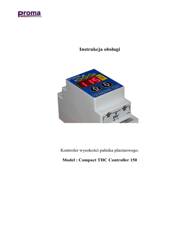 Instrukcja obsługi Kontroler wysokości palnika plazmowego. Model : Compact THC Controller 150 Uwagi dotyczące bezpieczeństwa PODCZAS PRACY URZĄDZENIA WEWNĄTRZ JEGO OBUDOWY ORAZ NA ZACISKACH PRZYŁĄCZENIOWYCH WYSTĘPUJĄ NAPIĘCIA NIEBEZPIECZNE DLA ZDROWIA I śYCIA CZŁOWIEKA Urządzenie moŜe być podłączane tylko i wyłącznie przez wykwalifikowaną i uprawnioną osobę. Nieprawidłowe podłączenie moŜe spowodować zagroŜenie zdrowia i Ŝycia. Przed montaŜem i uruchomieniem przeczytaj uwaŜnie niniejszą instrukcję montaŜu i obsługi. Pamiętaj, Ŝe wewnątrz urządzenia oraz na zaciskach przyłączeniowych moŜe występować niebezpieczne dla zdrowia i Ŝycia napięcie. Zabronione jest w szczególności: podłączanie urządzenia przez osobę nie posiadającą odpowiednich uprawnień, dotykanie zacisków pracującego urządzenia, obsługi urządzenia przez niewykwalifikowany personel, obsługi urządzenia mokrymi rękami, mokrymi rękawicami/odzieŜą. Przed włączeniem urządzenia zapewnij bezpieczeństwo innych osób i przeczytaj ze zrozumieniem niniejszą instrukcję. OstrzeŜenie: Zapewnij zabezpieczenia odpowiednie dla ryzyka związanego z procesem cięcia plazmowego. W celu uzyskania szczegółowych informacji odwołaj się do instrukcji obsługi podłączanego źródła plazmowego. Dotyk nie-izolowanych i nie-uziemionych elementów moŜe grozić śmiercią. Zapewnij bezpieczne miejsce dla urządzenia. Po zamontowaniu zapewnij ochronę zacisków przyłączeniowych przed dotykiem operatora. Zabronione jest rozbieranie urządzenia i/oraz dokonywanie jakichkolwiek napraw i modyfikacji urządzenia – moŜe to spowodować zagroŜenie dla Ŝycia i zdrowia osób montujących i obsługujących urządzenie. Proma-Elektronika nie ponosi odpowiedzialności za jakiekolwiek straty pośrednie w mieniu związane z uszkodzeniem czy teŜ nieprawidłowym funkcjonowaniem urządzenia. W przypadku problemów poproś o pomoc specjalistę lub skontaktuj się z dostawcą lub centrum serwisowym firmy Proma-Elektronika aby uzyskać pomoc. 2 Informacje o urządzeniu Urządzenie jest nowoczesnym analogowo - mikroprocesorowym kontrolerem wysokości palnika plazmowego nad ciętym materiałem na podstawie analizy zmian napięcia generowanego przez źródło plazmy. Dzięki wyposaŜeniu w czytelny wyświetlacz LED oraz klawisze obsługa jest banalnie prosta i nie wymaga Ŝadnych dodatkowych przyrządów pomiarowych. W swojej budowie posiada opatentowane rozwiązania wykonane z najwyŜszej klasy elementów zapewniających bezpieczną, komfortową oraz niezawodną wieloletnią pracę. Uproszczony schemat blokowy: Eliminator Napięcia Łuku Pilotującego – układ zabezpieczający, odpowiedzialny za likwidację groźnych dla elektroniki ewentualnych „szpilek” AC, które mogą pochodzić od układów źródła plazmy z bezstykowym zajarzaniem łuku (łuk pilotujący HV/HF) generujących wysokie napięcie lub od przepięć pochodzących z przecinarek plazmowych wyposaŜonych w stykowy system zajarzania łuku. Dzielnik Napięcia Łuku Głównego – podczas pracy przecinarki podaje ona niebezpieczne dla elektroniki precyzyjnej napięcie, które w układzie dzielnika jest obniŜane do bezpiecznej wartości. Układy filtrów są szybkimi filtrami które likwidują zakłócenia, które mogą się przedostawać za dzielnik napięcia. Blok mikroprocesora otrzymuje odfiltrowane i przeskalowane napięcie głównego łuku tnącego. Jest najwaŜniejszym blokiem urządzenia. Jego „mózgiem” jest zaprogramowany mikroprocesor, który poza analizą parametrów napięciowych cięcia oraz odpowiednim sterowaniem blokiem wyjściowym obsługuje równieŜ wyświetlacz LED oraz klawisze funkcyjne. Wbudowany impulsowy zasilacz zapewnia pracę w szerokim zakresie napięć zasilających bez potrzeby odprowadzania ciepła z elementów wchodzących w jego skład. Blok zasilacza jest odseparowany galwanicznie od pozostałej części układu co pozwala wykorzystać do zasilenia napięcie z istniejących układów. Ostatnim blokiem jest przekaźnikowy układ wyjściowy do którego podłącza się sterowniki/wejścia komputera odpowiedzialne np. za sterowanie silnikiem osi Z przecinarki plazmowej CNC. 3 Główne parametry urządzenia : Nazwa parametru Napięcie zasilania (V) Maksymalny prąd zasilania Maksymalne napięcie wejściowe bezpośrednie Maksymalne napięcie wejściowe z dzielnika 1:50 Zdolność eliminacji napięcia HV/HF jonizującego Zdolność eliminacji częstotliwości HV/HF jonizującej Cykl pracy (%) Cykl pracy eliminacji HV / HF (%) ObciąŜalność styków przekaźnikowych śywotność zastosowanych przekaźników (deklarowana minimalna ilość przełączeń) przy obciąŜeniu 5V / 10mA Stopień ochrony CięŜar (g) Wymiary zewnętrzne (szer.*dł*wys) [mm] Sposób montaŜu Dopuszczalne 7 – 35V DC 120mA 300VDC 10VDC 0.3kVAC >100kHz 100% 100% 50mA / 60V DC 500 000 000 cykli TEST* 36VDC* 1000V DC* 60V DC* 30kV AC* 75kHz* - IP20 130g 33*89*65 Szyna DIN35 - *Testowane w warunkach laboratoryjnych. Podłączenie zasilania: Opcjonalne podłączenie zasilania 35-50V: Do dolnych skrajnych zacisków pomiarowych urządzenia moŜna doprowadzić pełne napięcie wyjściowe źródła plazmy. Przy takim podłączeniu nie wolno nic podłączać do pozostałych zacisków wejściowych kontrolera. Przy podłączeniu bezpośrednim naleŜy uŜyć najkrótszych jak to moŜliwe przewodów łączących źródło plazmowe z kontrolerem THC – zaleca się aby kontroler THC znajdował się bezpośrednio przy źródle plazmy. 4 Przykładowy sposób podłączenia wejścia pomiarowego kontrolera THC z wyjściem popularnego źródła plazmowego PowerMax45® cenionej firmy Hypertherm® wyposaŜonego w niskonapięciowe wyjście o podziale 1:50. Jest to najczęściej stosowany podział napięcia w urządzeniach renomowanych firm. Opis przekaźnikowych wyjść sterujących: Wyjścia przekaźnikowe są wyjściami sterowniczymi i nie 