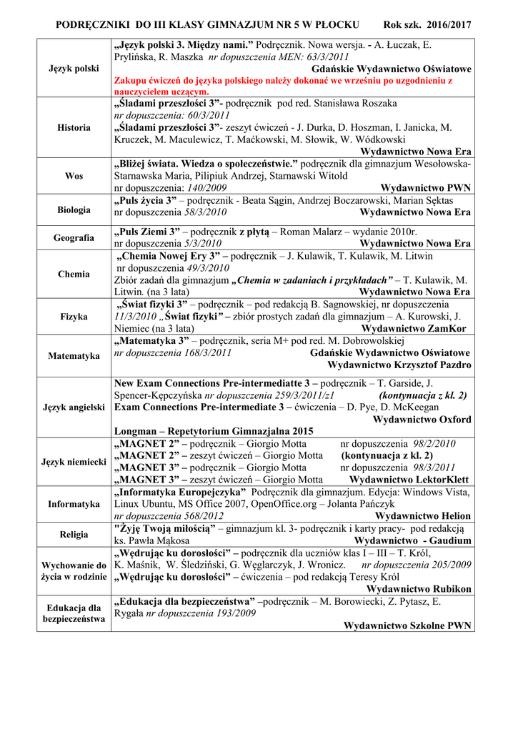 PODRĘCZNIKI DO III KLASY GIMNAZJUM NR 5 W PŁOCKU Język polski Rok szk. 2016/2017 „Język polski 3. Między nami.” Podręcznik. Nowa wersja. - A. Łuczak, E. Prylińska, R. Maszka nr dopuszczenia MEN: 63/3/2011 Gdańskie Wydawnictwo Oświatowe Zakupu ćwiczeń do języka polskiego należy dokonać we wrześniu po uzgodnieniu z nauczycielem uczącym. Historia Wos Biologia Geografia Chemia Fizyka Matematyka Język angielski Język niemiecki Informatyka Religia Wychowanie do życia w rodzinie Edukacja dla bezpieczeństwa „Śladami przeszłości 3”- podręcznik pod red. Stanisława Roszaka nr dopuszczenia: 60/3/2011 „Śladami przeszłości 3”- zeszyt ćwiczeń - J. Durka, D. Hoszman, I. Janicka, M. Kruczek, M. Maculewicz, T. Maćkowski, M. Słowik, W. Wódkowski Wydawnictwo Nowa Era „Bliżej świata. Wiedza o społeczeństwie.” podręcznik dla gimnazjum WesołowskaStarnawska Maria, Pilipiuk Andrzej, Starnawski Witold nr dopuszczenia: 140/2009 Wydawnictwo PWN „Puls życia 3” – podręcznik - Beata Sągin, Andrzej Boczarowski, Marian Sęktas nr dopuszczenia 58/3/2010 Wydawnictwo Nowa Era „Puls Ziemi 3” – podręcznik z płytą – Roman Malarz – wydanie 2010r. nr dopuszczenia 5/3/2010 Wydawnictwo Nowa Era „Chemia Nowej Ery 3” – podręcznik – J. Kulawik, T. Kulawik, M. Litwin nr dopuszczenia 49/3/2010 Zbiór zadań dla gimnazjum „Chemia w zadaniach i przykładach” – T. Kulawik, M. Litwin. (na 3 lata) Wydawnictwo Nowa Era „Świat fizyki 3” – podręcznik – pod redakcją B. Sagnowskiej, nr dopuszczenia 11/3/2010 „Świat fizyki” – zbiór prostych zadań dla gimnazjum – A. Kurowski, J. Niemiec (na 3 lata) Wydawnictwo ZamKor „Matematyka 3” – podręcznik, seria M+ pod red. M. Dobrowolskiej nr dopuszczenia 168/3/2011 Gdańskie Wydawnictwo Oświatowe Wydawnictwo Krzysztof Pazdro New Exam Connections Pre-intermediatte 3 – podręcznik – T. Garside, J. Spencer-Kępczyńska nr dopuszczenia 259/3/2011/z1 (kontynuacja z kl. 2) Exam Connections Pre-intermediate 3 – ćwiczenia – D. Pye, D. McKeegan Wydawnictwo Oxford Longman – Repetytorium Gimnazjalna 2015 „MAGNET 2” – podręcznik – Giorgio Motta nr dopuszczenia 98/2/2010 „MAGNET 2” – zeszyt ćwiczeń – Giorgio Motta (kontynuacja z kl. 2) „MAGNET 3” – podręcznik – Giorgio Motta nr dopuszczenia 98/3/2011 „MAGNET 3” – zeszyt ćwiczeń – Giorgio Motta Wydawnictwo LektorKlett „Informatyka Europejczyka” Podręcznik dla gimnazjum. Edycja: Windows Vista, Linux Ubuntu, MS Office 2007, OpenOffice.org – Jolanta Pańczyk nr dopuszczenia 568/2012 Wydawnictwo Helion "Żyję Twoją miłością” – gimnazjum kl. 3- podręcznik i karty pracy- pod redakcją ks. Pawła Mąkosa Wydawnictwo - Gaudium „Wędrując ku dorosłości” – podręcznik dla uczniów klas I – III – T. Król, K. Maśnik, W. Śledziński, G. Węglarczyk, J. Wronicz. nr dopuszczenia 205/2009 „Wędrując ku dorosłości” – ćwiczenia – pod redakcją Teresy Król Wydawnictwo Rubikon „Edukacja dla bezpieczeństwa” –podręcznik – M. Borowiecki, Z. Pytasz, E. Rygała nr dopuszczenia 193/2009 Wydawnictwo Szkolne PWN