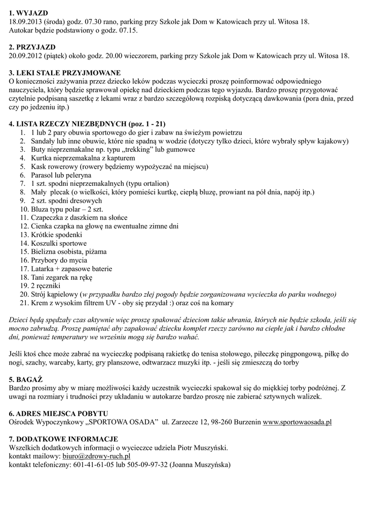 1. WYJAZD 18.09.2013 (środa) godz. 07.30 rano, parking przy Szkole jak Dom w Katowicach przy ul. Witosa 18. Autokar będzie podstawiony o godz. 07.15. 2. PRZYJAZD 20.09.2012 (piątek) około godz. 20.00 wieczorem, parking przy Szkole jak Dom w Katowicach przy ul. Witosa 18. 3. LEKI STALE PRZYJMOWANE O konieczności zażywania przez dziecko leków podczas wycieczki proszę poinformować odpowiedniego nauczyciela, który będzie sprawował opiekę nad dzieckiem podczas tego wyjazdu. Bardzo proszę przygotować czytelnie podpisaną saszetkę z lekami wraz z bardzo szczegółową rozpiską dotyczącą dawkowania (pora dnia, przed czy po jedzeniu itp.) 4. LISTA RZECZY NIEZBĘDNYCH (poz. 1 - 21) 1. 1 lub 2 pary obuwia sportowego do gier i zabaw na świeżym powietrzu 2. Sandały lub inne obuwie, które nie spadną w wodzie (dotyczy tylko dzieci, które wybrały spływ kajakowy) 3. Buty nieprzemakalne np. typu „trekking” lub gumowce 4. Kurtka nieprzemakalna z kapturem 5. Kask rowerowy (rowery będziemy wypożyczać na miejscu) 6. Parasol lub peleryna 7. 1 szt. spodni nieprzemakalnych (typu ortalion) 8. Mały plecak (o wielkości, który pomieści kurtkę, ciepłą bluzę, prowiant na pół dnia, napój itp.) 9. 2 szt. spodni dresowych 10. Bluza typu polar – 2 szt. 11. Czapeczka z daszkiem na słońce 12. Cienka czapka na głowę na ewentualne zimne dni 13. Krótkie spodenki 14. Koszulki sportowe 15. Bielizna osobista, piżama 16. Przybory do mycia 17. Latarka + zapasowe baterie 18. Tani zegarek na rękę 19. 2 ręczniki 20. Strój kąpielowy (w przypadku bardzo złej pogody będzie zorganizowana wycieczka do parku wodnego) 21. Krem z wysokim filtrem UV - oby się przydał :) oraz coś na komary Dzieci będą spędzały czas aktywnie więc proszę spakować dzieciom takie ubrania, których nie będzie szkoda, jeśli się mocno zabrudzą. Proszę pamiętać aby zapakować dziecku komplet rzeczy zarówno na ciepłe jak i bardzo chłodne dni, ponieważ temperatury we wrześniu mogą się bardzo wahać. Jeśli ktoś chce może zabrać na wycieczkę podpisaną rakietkę do tenisa stołowego, piłeczkę pingpongową, piłkę do nogi, szachy, warcaby, karty, gry planszowe, odtwarzacz muzyki itp. - jeśli się zmieszczą do torby 5. BAGAŻ Bardzo prosimy aby w miarę możliwości każdy uczestnik wycieczki spakował się do miękkiej torby podróżnej. Z uwagi na rozmiary i trudności przy układaniu w autokarze bardzo proszę nie zabierać sztywnych walizek. 6. ADRES MIEJSCA POBYTU Ośrodek Wypoczynkowy „SPORTOWA OSADA” ul. Zarzecze 12, 98-260 Burzenin www.sportowaosada.pl 7. DODATKOWE INFORMACJE Wszelkich dodatkowych informacji o wycieczce udziela Piotr Muszyński. kontakt mailowy: [email protected] kontakt telefoniczny: 601-41-61-05 lub 505-09-97-32 (Joanna Muszyńska)