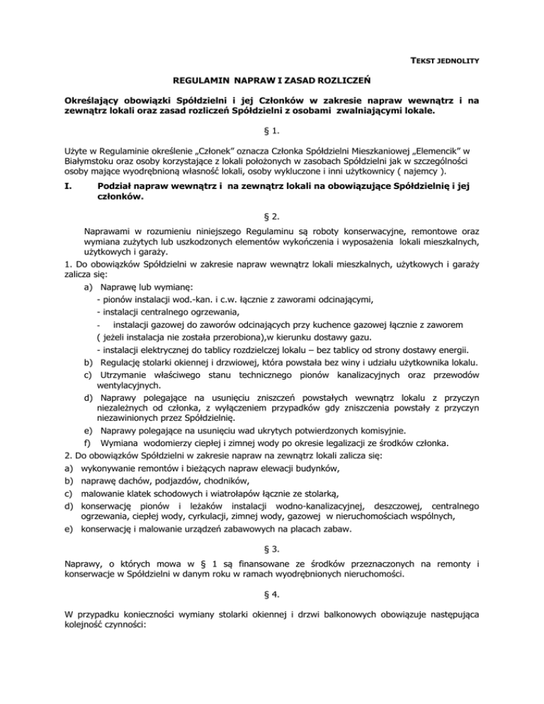 TEKST JEDNOLITY REGULAMIN NAPRAW I ZASAD ROZLICZEŃ Określający obowiązki Spółdzielni i jej Członków w zakresie napraw wewnątrz i na zewnątrz lokali oraz zasad rozliczeń Spółdzielni z osobami zwalniającymi lokale. § 1. Użyte w Regulaminie określenie „Członek” oznacza Członka Spółdzielni Mieszkaniowej „Elemencik” w Białymstoku oraz osoby korzystające z lokali położonych w zasobach Spółdzielni jak w szczególności osoby mające wyodrębnioną własność lokali, osoby wykluczone i inni użytkownicy ( najemcy ). I. Podział napraw wewnątrz i na zewnątrz lokali na obowiązujące Spółdzielnię i jej członków. § 2. Naprawami w rozumieniu niniejszego Regulaminu są roboty konserwacyjne, remontowe oraz wymiana zużytych lub uszkodzonych elementów wykończenia i wyposażenia lokali mieszkalnych, użytkowych i garaży. 1. Do obowiązków Spółdzielni w zakresie napraw wewnątrz lokali mieszkalnych, użytkowych i garaży zalicza się: a) Naprawę lub wymianę: - pionów instalacji wod.-kan. i c.w. łącznie z zaworami odcinającymi, - instalacji centralnego ogrzewania, - instalacji gazowej do zaworów odcinających przy kuchence gazowej łącznie z zaworem ( jeżeli instalacja nie została przerobiona),w kierunku dostawy gazu. - instalacji elektrycznej do tablicy rozdzielczej lokalu – bez tablicy od strony dostawy energii. b) Regulację stolarki okiennej i drzwiowej, która powstała bez winy i udziału użytkownika lokalu. c) Utrzymanie właściwego stanu technicznego pionów kanalizacyjnych oraz przewodów wentylacyjnych. d) Naprawy polegające na usunięciu zniszczeń powstałych wewnątrz lokalu z przyczyn niezależnych od członka, z wyłączeniem przypadków gdy zniszczenia powstały z przyczyn niezawinionych przez Spółdzielnię. e) Naprawy polegające na usunięciu wad ukrytych potwierdzonych komisyjnie. f) Wymiana wodomierzy ciepłej i zimnej wody po okresie legalizacji ze środków członka. 2. Do obowiązków Spółdzielni w zakresie napraw na zewnątrz lokali zalicza się: a) wykonywanie remontów i bieżących napraw elewacji budynków, b) naprawę dachów, podjazdów, chodników, c) malowanie klatek schodowych i wiatrołapów łącznie ze stolarką, d) konserwację pionów i leżaków instalacji wodno-kanalizacyjnej, deszczowej, centralnego ogrzewania, ciepłej wody, cyrkulacji, zimnej wody, gazowej w nieruchomościach wspólnych, e) konserwację i malowanie urządzeń zabawowych na placach zabaw. § 3. Naprawy, o których mowa w § 1 są finansowane ze środków przeznaczonych na remonty i konserwacje w Spółdzielni w danym roku w ramach wyodrębnionych nieruchomości. § 4. W przypadku konieczności wymiany stolarki okiennej i drzwi balkonowych obowiązuje następująca kolejność czynności: 1. Kwalifikacja przez komisję stolarki okiennej i drzwi balkonowych do wymiany. 2. Wymiana zakwalifikowanej w ust. 1 stolarki przez Członka Spółdzielni na własny koszt. 3. Protokolarnie potwierdzenie przez komisję wymiany stolarki po uprzednim zgłoszeniu jej przez Członka Spółdzielni. 4. Zwrot członkowi kosztów wymienionej stolarki okiennej i drzwi balkonowych wraz z montażem, udokumentowane rachunkiem lub fakturą VAT. a) zwrot kosztów stolarki nie może przekroczyć kosztów stolarki standardowej drewnianej wg cennika, „Sekocenbud” z IV kwartału poprzedniego roku. b) procentowy zwrot Członkowi Spółdzielni kosztów wymienionej stolarki okiennej i drzwiowej w zależności od terminu oddania budynku do użytkowania wg następujących zasad: - w budynkach oddanych do użytku od 10 do 15 lat – 30%, - w budynkach oddanych do użytku od 15 do 20 lat – 35%. - W budynkach oddanych do użytku po 20 latach – 40% c) warunki ustalone w ust. 4 lit. a i b niniejszego paragrafu nie dotyczą wewnętrznej stolarki drzwiowej oraz drzwi wejściowych z klatki schodowej do mieszkania. 5. Zwrot kosztów wymienionej stolarki nastąpi jedynie w przypadku wymiany stolarki na zgodną z projektem architektonicznym budynku w trakcie jego odbioru do eksploatacji. 6. Wypłata za wymienioną stolarkę będzie odbywała się zgodnie z rejestrem wymiany stolarki i posiadanymi środkami przewidzianymi w planie remontów na dany rok. 7. W uzasadnionych przypadkach Zarząd Spółdzielni może przyśpieszyć zwrot w/w kosztów za wymienioną stolarkę. § 5. 1. Naprawy wewnątrz lokalu nie zaliczone w Regulaminie do obowiązków Spółdzielni obciążają członków zajmujących te lokale. Jako szczególne obowiązki członka zajmującego lokal mieszkalny ustala się: a) obowiązek odnawiania lokalu polegający na malowaniu ścian i sufitów z częstotliwością wynikającą z właściwości techniczno-estetycznych, malowaniu farbą olejną (od strony wewnętrznej i zewnętrznej) okien i drzwi z zachowaniem kolorystyki oraz przewodów instalacyjnych – nie rzadziej niż raz na 5 lat. W przypadku napraw głównych elewacji i klatek schodowych wykonanych przez Spółdzielnię w zakres naprawy wchodzi również zewnętrzne malowanie stolarki. b) naprawę i wymianę stolarki drzwiowej ( poza balkonową ) c) naprawę i wymianę: podejść, rozprowadzeń oraz urządzeń sanitarnych, gazowych, osprzętu elektrycznego i telewizyjnego. d) utrzymanie szczelności podejść, rozprowadzeń oraz urządzeń wod.-kan. i gazu od miejsca ich włączenia do zaworów odcinających. Utrzymanie drożności przewodów kanalizacyjnych na odcinku od urządzenia do pionu głównego. e) naprawę i wymianę podłóg. f) wymianę unifonów oraz instalacji telewizji kablowej (wykonanych z własnych środków członka). 2. Użytkownik garażu obowiązany jest do: a) dokonywania napraw instalacji i urządzeń znajdujących się w garażu łącznie z ich wymianą, b) powiadamiania Spółdzielni o zaistniałych awariach, c) udostępniania garażu w celu dokonania bieżących i okresowych kontroli i przeglądów. § 6. Członek Spółdzielni zobowiązany jest do utrzymania właściwego 