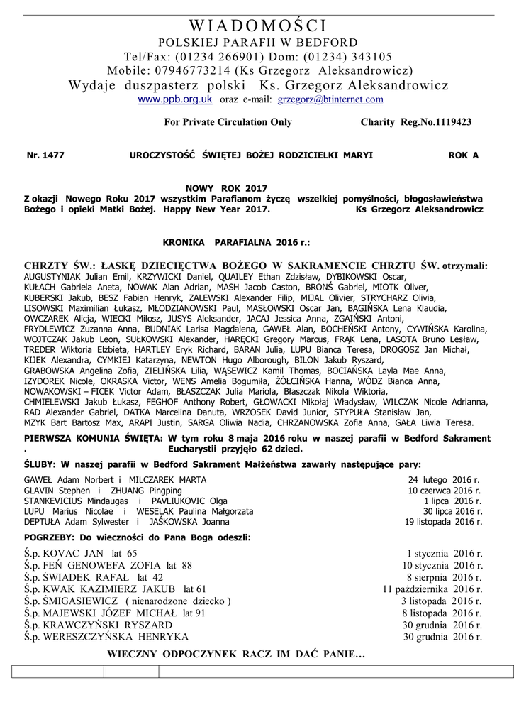WIADOMOŚCI POLSKIEJ PARAFII W BEDFORD Tel/Fax: (01234 266901) Dom: (01234) 343105 Mobile: 07946773214 (Ks Grzegorz Aleksandrowicz) Wydaje duszpasterz polski Ks. Grzegorz Aleksandrowicz www.ppb.org.uk oraz e-mail: [email protected] For Private Circulation Only Nr. 1477 Charity Reg.No.1119423 UROCZYSTOŚĆ ŚWIĘTEJ BOŻEJ RODZICIELKI MARYI ROK A NOWY ROK 2017 Z okazji Nowego Roku 2017 wszystkim Parafianom życzę wszelkiej pomyślności, błogosławieństwa Bożego i opieki Matki Bożej. Happy New Year 2017. Ks Grzegorz Aleksandrowicz KRONIKA PARAFIALNA 2016 r.: CHRZTY ŚW.: ŁASKĘ DZIECIĘCTWA BOŻEGO W SAKRAMENCIE CHRZTU ŚW. otrzymali: AUGUSTYNIAK Julian Emil, KRZYWICKI Daniel, QUAILEY Ethan Zdzisław, DYBIKOWSKI Oscar, KUŁACH Gabriela Aneta, NOWAK Alan Adrian, MASH Jacob Caston, BRONŚ Gabriel, MIOTK Oliver, KUBERSKI Jakub, BESZ Fabian Henryk, ZALEWSKI Alexander Filip, MIJAL Olivier, STRYCHARZ Olivia, LISOWSKI Maximilian Łukasz, MŁODZIANOWSKI Paul, MASŁOWSKI Oscar Jan, BAGIŃSKA Lena Klaudia, OWCZAREK Alicja, WIECKI Miłosz, JUSYS Aleksander, JACAJ Jessica Anna, ZGAIŃSKI Antoni, FRYDLEWICZ Zuzanna Anna, BUDNIAK Larisa Magdalena, GAWEŁ Alan, BOCHEŃSKI Antony, CYWIŃSKA Karolina, WOJTCZAK Jakub Leon, SUŁKOWSKI Alexander, HARĘCKI Gregory Marcus, FRĄK Lena, LASOTA Bruno Lesław, TREDER Wiktoria Elżbieta, HARTLEY Eryk Richard, BARAN Julia, LUPU Bianca Teresa, DROGOSZ Jan Michał, KIJEK Alexandra, CYMKIEJ Katarzyna, NEWTON Hugo Alborough, BILON Jakub Ryszard, GRABOWSKA Angelina Zofia, ZIELIŃSKA Lilia, WĄSEWICZ Kamil Thomas, BOCIAŃSKA Layla Mae Anna, IZYDOREK Nicole, OKRASKA Victor, WENS Amelia Bogumiła, ŻÓŁCIŃSKA Hanna, WÓDZ Bianca Anna, NOWAKOWSKI – FICEK Victor Adam, BŁASZCZAK Julia Mariola, Błaszczak Nikola Wiktoria, CHMIELEWSKI Jakub Łukasz, FEGHOF Anthony Robert, GŁOWACKI Mikołaj Władysław, WILCZAK Nicole Adrianna, RAD Alexander Gabriel, DATKA Marcelina Danuta, WRZOSEK David Junior, STYPUŁA Stanisław Jan, MZYK Bart Bartosz Max, ARAPI Justin, SARGA Oliwia Nadia, CHRZANOWSKA Zofia Anna, GAŁA Liwia Teresa. PIERWSZA KOMUNIA ŚWIĘTA: W tym roku 8 maja 2016 roku w naszej parafii w Bedford Sakrament . Eucharystii przyjęło 62 dzieci. ŚLUBY: W naszej parafii w Bedford Sakrament Małżeństwa zawarły następujące pary: GAWEŁ Adam Norbert i MILCZAREK MARTA GLAVIN Stephen i ZHUANG Pingping STANKEVICIUS Mindaugas i PAVLIUKOVIC Olga LUPU Marius Nicolae i WESELAK Paulina Małgorzata DEPTUŁA Adam Sylwester i JAŚKOWSKA Joanna 24 lutego 2016 r. 10 czerwca 2016 r. 1 lipca 2016 r. 30 lipca 2016 r. 19 listopada 2016 r. POGRZEBY: Do wieczności do Pana Boga odeszli: Ś.p. KOVAC JAN lat 65 Ś.p. FEŃ GENOWEFA ZOFIA lat 88 Ś.p. ŚWIADEK RAFAŁ lat 42 Ś.p. KWAK KAZIMIERZ JAKUB lat 61 Ś.p. ŚMIGASIEWICZ ( nienarodzone dziecko ) Ś.p. MAJEWSKI JÓZEF MICHAŁ lat 91 Ś.p. KRAWCZYŃSKI RYSZARD Ś.p. WERESZCZYŃSKA HENRYKA WIECZNY ODPOCZYNEK RACZ IM DAĆ PANIE… 1 stycznia 2016 r. 10 stycznia 2016 r. 8 sierpnia 2016 r. 11 pażdziernika 2016 r. 3 listopada 2016 r. 8 listopada 2016 r. 30 grudnia 2016 r. 30 grudnia 2016 r. NOWY ROK 2017 - UROCZYSTOŚĆ ŚWIĘTEJ BOŻEJ RODZICIELKI MARYI Niedziela,1.01.2016 Godz. 9.30 W int. Samuela z ok. urodzin z prośbą o błog. Boże i opiekę M.Bożej–int. rodziny. Godz.11.00 - za dusze ś.p. Otylii Chmielewskiej - int. córki. Godz.18.00 - ADORACJA NAJŚWIĘTSZEGO SAKRAMENTU. Godz.19.00 W int.Mieczysławy z ok.urodzin z prośbą o błog.Boże i opiekę M.Bożej–int.rodziny Poniedziałek, 2.1.20 Godz. 9.30 za ś.p.Tadeusza Grzywacza w 3-cią rocznicę śmierci i w pewnej intencji- int. żony. Św.Bazylego i Godz.19.00 - O błogosławieństwo Boże i potrzebne łaski dla rodziny Allan, Nash i Eaton Św. Grzegorza w 2017 r. – int. Pani Ewy Allan. Wtorek, 3.01.2017 Godz. 9.300 - O zdrowie i błogosławieństwo Boże i szczęśliwą operacje dla Ewy- int. mamy. Środa, 4.01.2017 Godz. 9.30 - O zdrowie i łaskę wiary w mojej rodzinie - int. Pani Ireny Budarkiewicz. Czwartek,5.01.2017 Godz. 9.30 - za dusze ś.p. Jadwigi Rekowskiej w rocznicę śmierci - int. córki z rodziną. Piątek, 6.01.2017 PIERWSZY PIĄTEK miesiąca STYCZNIA Godz.15.00 - za dusze ś.p. Edmunda Markowskiego w rocznicę śmierci - int. żony. KORONKA DO MIŁOSIERDZIA BOŻEGO. Godz.18.00 - SPOWIEDŹ ŚW z okazji Pierwszego Piątku miesiąca. Godz.19.00 - Intencja wolna. Sobota, 7.01.2017 Godz. 9.30 za dusze ś.p.Konstantego Budarkiewicz i zmarłych z rodziny–int. P.I.Budarkiewicz - ADORACJA NAJŚWIĘTSZEGO SAKRAMENTU. SPOWIEDŹ ŚWIĘTA. z Godz.19.00 - za dusze ś.p. Rafała Miśkiewicz w 1-szą rocznicę śmierci i ś.p. Krzysztofy Pępek – int. rodziny. Niedziela. 8.1.2017 UROCZYSTOŚĆ TRZECH KRÓLI - OBJAWIENIE PAŃSKIE CHRZEST ŚW.: W naszym kościele w Bedford Sakrament Chrztu świętego otrzymała LIWIA TERESA GAŁA w drugi dzień świąt Bożego Narodzenia w poniedziałek 26 grudnia 2016 r. Nowo ochrzczonemu dziecku i jej rodzicom życzymy błogosławieństwa i opieki Bożej. OGŁOSZENIA PARAFIALNE: W okresie miesiąca stycznia 2017 r. nie będzie Mszy świętych wieczornych (od poniedziałku do piątku). Są jeszcze do nabycia kalendarze ścienne na 2017 rok w cenie Ł 1.50, Ł 2.00 i Ł 2.50 Z okazji Kolędy Parafialnej są również do nabycia komplety kolędowe w cenie Ł 5. Jak zwykle są do nabycia: „Gość Niedzielny” w cenie Ł 2 i „Mały Gość Niedzielny” w cenie Ł 1.50 W kruchcie kościoła jest wywieszona lista tych osób, które wpłaciły składki parafialne i Gift Aid na utrzymanie naszej parafii w 2016 roku. Serdeczne „BÓG ZAPŁAĆ!” 6. W dalszym ciągu przyjmuję zgłoszenia na wizyty duszpasterskie w ramach Kolędy Parafialnej. 7. KOLĘDA PARAFIANA: Oto kolejność wizyt w tym tygodniu: Poniedziałek, 2 stycznia: Fortulański D, Kieś S.N, Motybel C.B, Badziak J.B, Skwarna J.J, Synus M.A, Wawrzynowski J.M, Skrobisz P, Czumaj G.A, Rajkowski R.K, Jagiełło A.M, Wiecki M.K, Bogdańska B, Panocha P.B, Oleksy M.W. Wtorek,3 