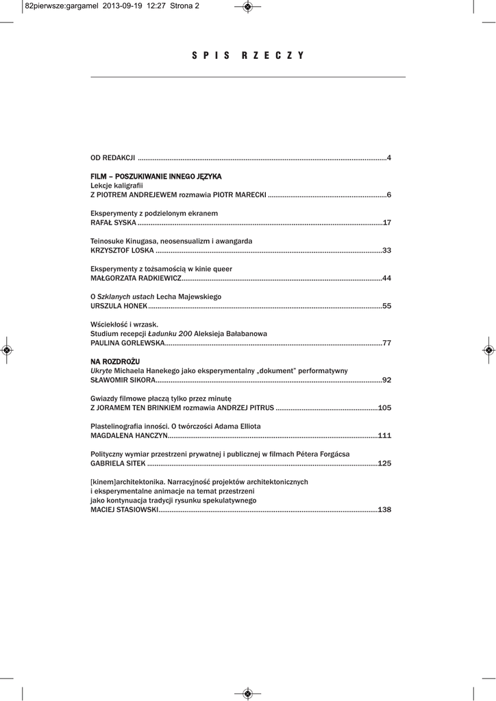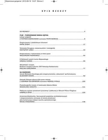 82pierwsze:gargamel 2013-09-19 12:27 Strona 2 S P I S R Z E C Z Y Od redakcji ......................................................................................................................................4 FiLM – POSZUkiWaNie iNNeGO jĘZYka Lekcje kaligrafii Z PiOtreM aNdrejeWeM rozmawia PiOtr Marecki ................................................................6 eksperymenty z podzielonym ekranem raFał SYSka ....................................................................................................................................17 teinosuke kinugasa, neosensualizm i awangarda krZYSZtOF LOSka ..........................................................................................................................33 eksperymenty z tożsamością w kinie queer MałGOrZata radkieWicZ............................................................................................................44 O Szklanych ustach Lecha Majewskiego UrSZULa HONek..............................................................................................................................55 Wściekłość i wrzask. Studium recepcji Ładunku 200 aleksieja Bałabanowa PaULiNa GOrLeWSka.....................................................................................................................77 Na rOZdrOŻU Ukryte Michaela Hanekego jako eksperymentalny „dokument” performatywny SłaWOMir SikOra..........................................................................................................................92 Gwiazdy filmowe płaczą tylko przez minutę Z jOraMeM teN BriNkieM rozmawia aNdrZej PitrUS .......................................................105 Plastelinografia inności. O twórczości adama elliota MaGdaLeNa HaNcZYN.................................................................................................................111 Polityczny wymiar przestrzeni prywatnej i publicznej w filmach Pétera Forgácsa GaBrieLa Sitek ............................................................................................................................125 [kinem]architektonika. Narracyjność projektów architektonicznych i eksperymentalne animacje na temat przestrzeni jako kontynuacja tradycji rysunku spekulatywnego Maciej StaSiOWSki......................................................................................................................138 82pierwsze:gargamel 2013-09-19 12:27 Strona 3 S P I S R Z E C Z Y POŻeGNaNie Z kiNeM? Między autonomią a hybrydycznością. Wprowadzenie do sztuki nowych mediów rYSZard W. kLUSZcZYńSki .......................................................................................................156 Looping, czyli ekstaza powtórzenia aLekSaNdra HirSZFeLd ............................................................................................................167 dziewczyńskie zapiski. O wczesnej twórczości Sadie Benning daGMara rOde ............................................................................................................................177 Four Songs Billa Violi – eksperymentalne pieśni wideo aNdrZej PitrUS ...........................................................................................................................193 interaktywna twórczość Grahame’a Weinbrena jako szczególny przypadek sztuki filmowej aNNa ŻakieWicZ...........................................................................................................................201 eksperyment w filmie i sztuce ruchomego obrazu Marek HeNdrYkOWSki ..............................................................................................................213 OkieM i UcHeM Włodzimierz iljicz king kong MarciN GiŻYcki ............................................................................................................................223 kSiĄŻki O FiLMie Opis gęsty – antropologia i film PatrYcja WłOdek .......................................................................................................................230 demony Goi okiem kamery kaMiLa ŻYtO..................................................................................................................................236 NOtY O aUtOracH .......................................................................................................................240 SUMMarY ......................................................................................................................................242 taBLe deS MatiÈreS ...................................................................................................................248