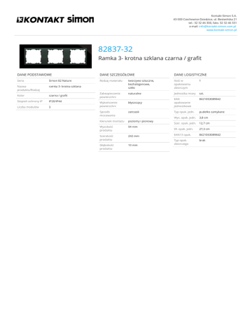 Kontakt-Simon S.A. 43-500 Czechowice-Dziedzice, ul. Bestwińska 21 tel.: 32 32 46 300, faks: 32 32 46 331 e-mail: [email protected] www.kontakt-simon.pl 82837-32 Ramka 3- krotna szklana czarna / grafit DANE PODSTAWOWE DANE SZCZEGÓŁOWE DANE LOGISTYCZNE Seria Simon 82 Nature Rodzaj materiału ramka 3- krotna szklana Ilość w opakowaniu zbiorczym 1 Nazwa produktu/Rodzaj tworzywo sztuczne, bezhalogenowe, szkło Kolor czarna / grafit Zabezpieczenie powierzchni naturalne Jednostka miary szt. Stopień ochrony IP IP20/IP44 błyszczący 3 EAN opakowanie jednostkowe 8421053089842 Liczba modulów Wykończenie powierzchni Sposób mocowania zatrzask Typ opak. jedn. pudełko zamykane Kierunek montażu poziomy i pionowy Wys. opak. jedn. 3,8 cm Wysokość produktu 94 mm Szer. opak. jedn. 12,7 cm Dł. opak. jedn. 27,3 cm Szerokość produktu 242 mm EAN13 opak. 8421053089842 10 mm Typ opak. zbiorczego brak Głębokość produktu