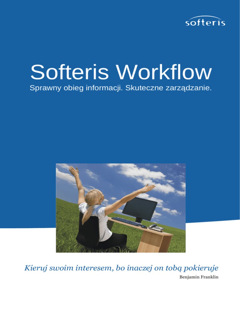 Softeris Workflow Sprawny obieg informacji. Skuteczne zarz¹dzanie. Kieruj swoim interesem, bo inaczej on tob¹ pokieruje Benjamin Franklin Platforma komunikacji Softeris Workflow Cyfrowy obieg informacji Softeris Workflow zapewnia obs³ugê obiegu dokumentów i informacji zwi¹zanych Dlaczego Softeris Workflow? ? przejrzyste i jednolite formularze ? zaawansowane wyszukiwanie z procesami biznesowymi. Zdefiniowany obieg informacji mo¿e odbywaæ siê wewn¹trz firmy, pomiêdzy firmami wspó³pracuj¹cymi lub pomiêdzy pracownikami a otoczeniem ? wielopoziomowe prawa dostêpu firmy. Obs³uga systemu odbywa siê poprzez ? pe³ne logowanie akcji i zdarzeñ ? dostêp przez przegl¹darkê WWW przegl¹darkê WWW, co znacz¹co zmniejsza koszty i czas trwania instalacji. ? integracja z Intranetem ? pomoc do ka¿dego pola i akcji Architektura systemu ? system powiadomieñ email/SMS Softeris Workflow bazuje na architekturze ? dostêp zawsze i z ka¿dego miejsca modu³owej. Taka konstrukcja umo¿liwia ³atwe i szybkie rozszerzanie funkcjonalnoœci oraz w³aœciwe dostosowanie do unikalnych wymagañ. Nasza oferta zawiera szereg gotowych systemów opartych na Softeris Workflow, które dziêki elastycznej strukturze platformy mo¿na szybko dostosowaæ do potrzeb klienta. Efektywna wymiana informacji w firmie Obieg dokumentów i informacji w firmie £atwoœæ obs³ugi Ka¿dy modu³ platformy Softeris Workflow korzysta z jednolitych formularzy i oferuje Wybrane zastosowania Softeris Workflow: pomoc kontekstow¹ do ka¿dego pola i akcji. ? kompletne cyfrowe biuro bez papieru W taki sam sposób realizowany jest dostêp ? obs³uga spraw i wniosków do wszystkich typów informacji. Mo¿liwe jest ? akceptacja urlopów tak¿e przes³anie odnoœnika do ka¿dego ? akceptacja i rozliczanie delegacji elementu systemu np. e-mailem. ? portale informacyjne ? komunikacja z placówkami Niskie koszty wdro¿enia ? zarz¹dzanie projektami Dziêki obs³udze przez przegl¹darkê WWW ? zarz¹dzanie kadrami ? zarz¹dzanie logistyk¹ i transportem ? udostêpnianie plików eliminowane s¹ koszty zakupu licencji dla wszystkich stanowisk a dostêp do systemu jest mo¿liwy z ka¿dego miejsca. Dziêki niskim cenom oraz rozwi¹zaniom ? rezerwacja zasobów hostingowym Softeris, systemy oparte na ? wspomaganie nauczania ? Intranet/Ekstranet naszej platformie s¹ idealne równie¿ dla ma³ych i œrednich firm. “Wdro¿yliœmy Softeris Workflow 5 lat temu, aby usprawniæ obieg dokumentów oraz zapewniæ sta³y, niezale¿ny od aktualnego miejsca pobytu, dostêp do informacji o aktualnym stanie wszelkich spraw prowadzonych przez naszych ludzi. System ca³kowicie spe³ni³ nasze wymagania, zapewniaj¹c 100% informacji i kontroli nad przebiegiem procesów biznesowych oraz demonstruj¹c elastycznoœæ, pozwalaj¹c¹ na ci¹g³e dostosowywanie go do naszych rosn¹cych potrzeb.” Marcin Okraska, Dyrektor IT sieci sklepów PEPCO Sprawny obieg informacji. Skuteczne zarz¹dzanie Softeris Systemy Informatyczne ul. Nad Sudo³em 24/40 31-228 Kraków tel/fax +48 12 415 44 49 tel. kom. +48 603 73 00 70 e-mail: [email protected] www.softeris.pl Szczegó³owe informacje oraz wersje demo naszych systemów znajdziecie Pañstwo na naszej stronie internetowej www.softeris.pl