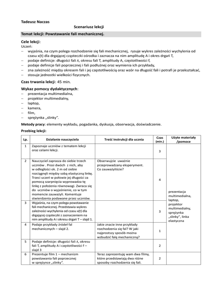 Tadeusz Naczas Scenariusz lekcji Temat lekcji: Powstawanie fali mechanicznej. Cele lekcji: Uczeń: wyjaśnia, na czym polega rozchodzenie się fali mechanicznej, rysuje wykres zależności wychylenia od czasu x(t) dla drgającej cząsteczki ośrodka i zaznacza na nim amplitudę A i okres drgań T, podaje definicje: długości fali ʎ, okresu fali T, amplitudy A, częstotliwości f, podaje definicje fali poprzecznej i fali podłużnej oraz wymienia ich przykłady, zna zależność między okresem fali i jej częstotliwością oraz wzór na długość fali i potrafi je przekształcać, stosuje jednostki wielkości fizycznych. Czas trwania lekcji: 45 min. Wykaz pomocy dydaktycznych: prezentacja multimedialna, projektor multimedialny, laptop, kamera, film, sprężynka „slinky”. Metody pracy: elementy wykładu, pogadanka, dyskusja, obserwacja, doświadczenie. Przebieg lekcji: Lp. 1 2 3 4 5 6 Działanie nauczyciela Treść instrukcji dla ucznia Zapoznaje uczniów z tematem lekcji oraz celami lekcji. Użyte materiały /pomoce 3 Nauczyciel zaprasza do siebie trzech uczniów . Prosi dwóch z nich, aby w odległości ok. 2 m od siebie rozciągnęli między sobą elastyczną linkę. Trzeci uczeń w połowie jej długości za pomocą szarpnięcia wyprowadza tę linkę z położenia równowagi. Zwraca się do uczniów o wyjaśnienie, co w tym momencie zauważyli. Komentuje stwierdzenia podawane przez uczniów. Wyjaśnia, na czym polega powstawanie fali mechanicznej. Przedstawia wykres zależności wychylenia od czasu x(t) dla drgającej cząsteczki z zaznaczeniem na nim amplitudy A i okresu drgań T – slajd 1. Obserwujcie uważnie przeprowadzany eksperyment. Co zauważyliście? Podaje przykłady źródeł fal mechanicznych – slajd 2. Jakie znacie inne przykłady rozchodzenia się fal? W jaki najprostszy sposób można wzbudzić falę mechaniczną? Podaje definicje: długości fali ʎ, okresu fali T, amplitudy A i częstotliwości f – slajd 3 Prezentuje film 1 – mechanizm powstawania fali poprzecznej w sprężynce „slinky”. Czas (min.) 4 3 1 2 Teraz zaprezentuję wam dwa filmy, które przedstawiają dwa różne sposoby rozchodzenia się fali. 2 prezentacja multimedialna, laptop, projektor multimedialny, sprężynka „slinky”, linka elastyczna 7 8 9 10 11 12 13 14 Prezentuje film 2 – mechanizm powstawania fali podłużnej w sprężynce „slinky”. Po projekcji filmów prosi uczniów o wykonanie doświadczenia przedstawionego na filmach. Podaje definicje fali poprzecznej i fali podłużnej – slajd 4. Podaje przykłady występowania fal poprzecznych i podłużnych – slajd 5 Przedstawia zależność między okresem fali i jej częstotliwością oraz wzór na długość fali i jego przekształcenia – slajd 6. Prezentuje do rozwiązania treść zadania nr 1, w którym trzeba obliczyć długość fali na wodzie znając jej szybkość rozchodzenia się i czas wykonania jednego pełnego drgania. Przedstawia prawidłowe rozwiązanie tego zadania Prezentuje do rozwiązania treść zadania nr 2, w którym trzeba obliczyć częstotliwość wysłanej fali znając jej długość i szybkość rozchodzenia się. Przedstawia prawidłowe rozwiązanie tego zadania. Podsumowuje lekcję i zadaje pracę domową. np.: Zad.1 Po powierzchni jeziora biegną fale o długości ʎ = 9 m, z prędkością v = 3 m/s. Jaka jest częstotliwość drgań boi pływającej na jeziorze? Zad.2 W czasie burzy od chwili zaobserwowania błyskawicy do chwili usłyszenia grzmotu upłynęło 12 sekund. Oblicz, w jakiej odległości od obserwatora nastąpiło uderzenie pioruna. Prędkość dźwięku przyjmij v = 330 m/s. Obejrzyjcie je uważnie i spróbujcie ocenić, jaka była różnica w samym sposobie wzbudzania fali na jednym i drugim filmie i w jaki sposób poruszała się drgająca sprężynka 2 4 2 2 4 Rozwiążcie samodzielnie w zeszycie zadanie zaprezentowane na tym slajdzie. 7 Rozwiążcie samodzielnie w zeszycie zadanie zaprezentowane na tym slajdzie. 7 Rozwiążcie w domu zadania zapisane na szkolnej platformie e-learningowej. 2 Wybór literatury dla nauczyciela: K. Horodecki, A. Ludwikowski, Fizyka 4 - podręcznik dla gimnazjum, GWO Gdańsk 2012 r. wydanie I. A. Kurowski, J Niemiec, Fizyka w prostych zadaniach- zbiór zadań dla gimnazjum, ZamKor Kraków 2007. M. Chyla, K. Chyla, Zbiór prostych zadań z fizyki dla gimnazjum, DEBIT. Zasoby internetowe na temat fal mechanicznych. Uwagi metodyczne dla nauczycieli dotyczące wykorzystania ICT: Prezentacja multimedialna powinna zawierać: Slajd 1 prezentuje definicję fali mechanicznej i wykres ruchu drgającego x(t) z zaznaczeniem amplitudy A i okresu drgań T. Slajd 2 przedstawia przykłady źródeł fal mechanicznych (fala na wodzie, fala dźwiękowa, fale sejsmiczne, poruszanie gumowym wężem, drgania stalowego pręta umocowanego z jednej strony. Slajd 3 podaje definicje: długości fali, okresu fali i jej częstotliwości oraz amplitudy. Film 1 prezentuje mechanizm powstawania fali poprzecznej w sprężynce „slinky”. Film 2 prezentuje mechanizm powstawania fali podłużnej w sprężynce „slinky”. Slajd 4 podaje definicje fali poprzecznej i fali podłużnej. Slajd 5 prezentuje przykłady powstawania fal poprzecznych i podłużnych. Slajd 6 podaje zależność między okresem fali i jej częstotliwością, wzór na długość fali i jego przekształcenia. Slajd 7 podaje treść zadania nr 1, w którym trzeba obliczyć długość fali na wodzie znając jej szybkość rozchodzenia się i czas wykonania jednego pełnego drgania. Slajd 8 przedstawia prawidłowe rozwiązanie zadania nr 1. Slajd 9 podaje treść zadania nr 2, w którym trzeba obliczyć częstotliwość wysłanej fali znając jej długość i szybkość rozchodzenia się. Slajd 10 przedstawia prawidłowe rozwiązanie zadania nr 2.