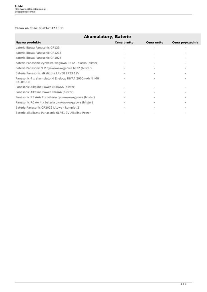 Robbi http://www.sklep.robbi.com.pl [email protected] Cennik na dzień: 03-03-2017 13:11 Akumulatory, Baterie Nazwa produktu Cena brutto Cena netto Cena poprzednia bateria litowa Panasonic CR123 - - - bateria litowa Panasonic CR1216 - - - bateria litowa Panasonic CR1025 - - - bateria Panasonic cynkowo-węglowa 3R12 - płaska (blister) - - - bateria Panasonic 9 V cynkowo-węglowa 6F22 (blister) - - - Bateria Panasonic alkaliczna LRV08 LR23 12V - - - Panasonic 4 x akumulatorki Eneloop R6/AA 2000mAh Ni-MH BK-3MCCE - - - Panasonic Alkaline Power LR3/AAA (blister) - - - Panasonic Alkaline Power LR6/AA (blister) - - - Panasonic R3 AAA 4 x bateria cynkowo-węglowa (blister) - - - Panasonic R6 AA 4 x bateria cynkowo-węglowa (blister) - - - Bateria Panasonic CR2016 Litowa - komplet 2 - - - Baterie alkaliczne Panasonic 6LR61 9V Alkaline Power - - - 1/1 Powered by TCPDF (www.tcpdf.org)