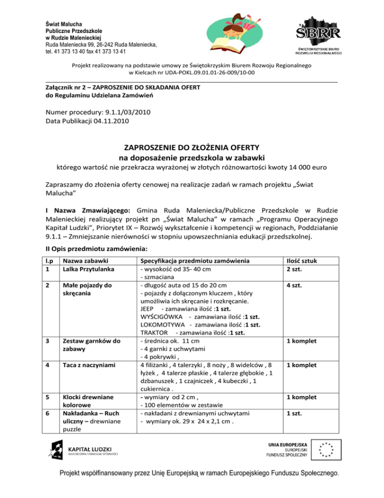 Świat Malucha Publiczne Przedszkole w Rudzie Malenieckiej Ruda Maleniecka 99, 26-242 Ruda Maleniecka, tel. 41 373 13 40 fax 41 373 13 41 Projekt realizowany na podstawie umowy ze Świętokrzyskim Biurem Rozwoju Regionalnego w Kielcach nr UDA-POKL.09.01.01-26-009/10-00 ___________________________________________________________________________________________ Załącznik nr 2 – ZAPROSZENIE DO SKŁADANIA OFERT do Regulaminu Udzielana Zamówieo Numer procedury: 9.1.1/03/2010 Data Publikacji 04.11.2010 ZAPROSZENIE DO ZŁOŻENIA OFERTY na doposażenie przedszkola w zabawki którego wartośd nie przekracza wyrażonej w złotych różnowartości kwoty 14 000 euro Zapraszamy do złożenia oferty cenowej na realizacje zadao w ramach projektu „Świat Malucha” I Nazwa Zmawiającego: Gmina Ruda Maleniecka/Publiczne Przedszkole w Rudzie Malenieckiej realizujący projekt pn „Świat Malucha” w ramach „Programu Operacyjnego Kapitał Ludzki”, Priorytet IX – Rozwój wykształcenie i kompetencji w regionach, Poddziałanie 9.1.1 – Zmniejszanie nierówności w stopniu upowszechniania edukacji przedszkolnej. II Opis przedmiotu zamówienia: l.p 1 Nazwa zabawki Lalka Przytulanka 2 Małe pojazdy do skręcania 3 Zestaw garnków do zabawy 4 Taca z naczyniami 5 Klocki drewniane kolorowe Nakładanka – Ruch uliczny – drewniane puzzle 6 Specyfikacja przedmiotu zamówienia - wysokośd od 35- 40 cm - szmaciana - długośd auta od 15 do 20 cm - pojazdy z dołączonym kluczem , który umożliwia ich skręcanie i rozkręcanie. JEEP - zamawiana ilośd :1 szt. WYŚCIGÓWKA - zamawiana ilośd :1 szt. LOKOMOTYWA - zamawiana ilośd :1 szt. TRAKTOR - zamawiana ilośd :1 szt. - średnica ok. 11 cm - 4 garnki z uchwytami - 4 pokrywki , 4 filiżanki , 4 talerzyki , 8 noży , 8 widelców , 8 łyżek , 4 talerze płaskie , 4 talerze głębokie , 1 dzbanuszek , 1 czajniczek , 4 kubeczki , 1 cukiernica . - wymiary od 2 cm , - 100 elementów w zestawie - nakładani z drewnianymi uchwytami - wymiary ok. 29 x 24 x 2,1 cm . Ilośd sztuk 2 szt. 4 szt. 1 komplet 1 komplet 1 komplet 1 szt. Projekt współfinansowany przez Unię Europejską w ramach Europejskiego Funduszu Społecznego . Świat Malucha Publiczne Przedszkole w Rudzie Malenieckiej Ruda Maleniecka 99, 26-242 Ruda Maleniecka, tel. 41 373 13 40 fax 41 373 13 41 Projekt realizowany na podstawie umowy ze Świętokrzyskim Biurem Rozwoju Regionalnego w Kielcach nr UDA-POKL.09.01.01-26-009/10-00 ___________________________________________________________________________________________ 7 Nakładanka geometryczna – Geometryczny kotek 1 szt. Miś Pluszowy - drewniane nakładanki , których elementami są figury geometryczne. - elementy można układad w podstawie , jak również budowad własne wzory poza nią . - wymiary ok. 19,5 x 24,5 cm - drewniane nakładanki , których elementami są figury geometryczne. - elementy można układad w podstawie , jak również budowad własne wzory poza nią . Wysokośd ok. 30 cm 8 Nakładanka geometryczna – Geometryczny piesek 9 10 Wózek spacerowy HELLO KITTY - wózek z wizerunkiem Kotki Kitty. - wózek przeznaczony dla lalek do 42 cm 2 szt 11 Wózek Gondola - z ruchomym siedziskiem - możliwośd zamiany na spacerówkę. - wyposażony w składany daszek przeciwsłoneczny. - dla lalek - bobasów do 42 cm długości. 2 szt. 12 Kid Cars 3D - Parking 3 poziomy + 4,6m drogi - parking 3 poziomy + 4,6m drogi - Jest to zestaw o łącznej długości 4,6m , w skład którego wchodzi parking 3-poziomowy, 2 autko. 2 szt. 13 Samochód z wywrotką 3 szt. 14 Samochód śmieciarka 15 Samochód dźwig 16 Klocki Bobi - zestaw XL - wywrotka - 38-cm - wywrotka ma podnoszoną i opuszczaną skrzynie ładunkową. – długośd ok. 60 -cm. - śmieciarka wyposażona w 2 kontenery na śmieci, ruchomy podnośnik umożliwiający opróżnianie kontenera oraz otwieraną tylną klapę. - samochód dźwig – ok. 37-cm. - auto posiada wysuwany dźwig o długości 54 cm w górę oraz możliwośd obracania nim dookoła. - do dźwigu dołączony jest hak, który można podciągad i opuszczad. - ogromna różnorodnością kształtów. -W zestawie dołączone okna, podwozia i koła (które umożliwiają złożenie jeżdżących pojazdów) - w zestawie barwna wycinanka, przy pomocy której dziecko z łatwością stworzy barwną 1 szt. 2 szt. 2 szt. 2 szt. 3 zestawy Projekt współfinansowany przez Unię Europejską w ramach Europejskiego Funduszu Społecznego . Świat Malucha Publiczne Przedszkole w Rudzie Malenieckiej Ruda Maleniecka 99, 26-242 Ruda Maleniecka, tel. 41 373 13 40 fax 41 373 13 41 Projekt realizowany na podstawie umowy ze Świętokrzyskim Biurem Rozwoju Regionalnego w Kielcach nr UDA-POKL.09.01.01-26-009/10-00 ___________________________________________________________________________________________ 17 18 Edukacyjne Puzzle 24, 48 el. Klub Myszki Mik Puzzle Królewna Śnieżka 20 el. maxi 19 Lalka Agatka 20 Kołyska dla lalek krainę. - w zestawie znajduje się 96 elementów Zestaw składa się z dwóch plansz po 24 i 48 elementów. - Puzzle z postaciami z bajki Królewna Śnieżka. - Po ułożeniu mogą byd wspaniałą ozdobą na ścianę w pokoju dziecka. - Lalka z włosami - w komplecie z ubrankami - wysokośd 20 cm. - Wykonana z drewna, - wym.: 33 x 30 x 50 cm 4 zestawy 2 zestawy 4 szt. 2 szt. III Warunki i zakres realizacji zamówienia: 1. Przedmiot Zarównia obejmuje dostawę na miejsce w/w zabawek. 2. Zabawki maja byd nowe , pełnowartościowe, pierwszego gatunku. 3. Kryterium wyboru oferty 100 % cena. 4. Do oferty należy dołączyd rysunek/zdjęcie oferowanego przedmiotu. 5. Forma płatności przelew 30 dni. 6. Prosimy o przesłanie oferty wg załącznika - Wzór oferty. 7. W ofercie Wykonawca określi cenę brutto (w rozbiciu na cenę netto i podatek VAT 8. Nie dopuszcza się cząstkowego ani wariantowego składania ofert. 9. Zamawiający dopuszcza dołączenie dodatkowych opisów przedmiotu zamówienia. 10. Zamawiający zawrze umowę 