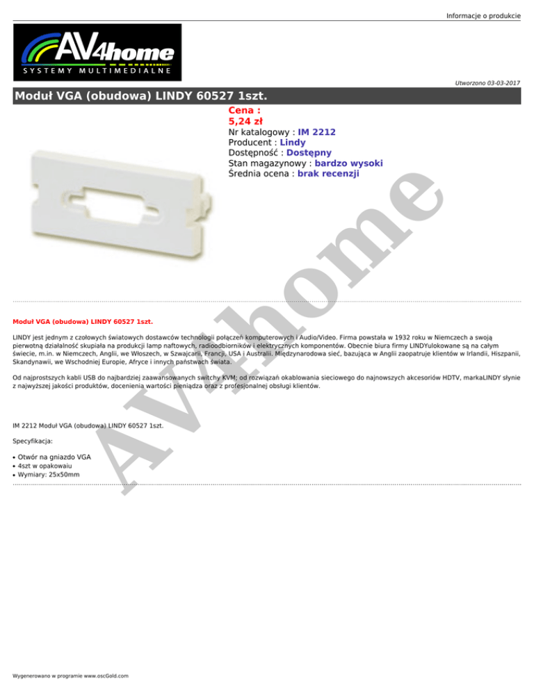 Informacje o produkcie Utworzono 03-03-2017 Moduł VGA (obudowa) LINDY 60527 1szt. Cena : 5,24 zł 4h Moduł VGA (obudowa) LINDY 60527 1szt. om e Nr katalogowy : IM 2212 Producent : Lindy Dostępność : Dostępny Stan magazynowy : bardzo wysoki Średnia ocena : brak recenzji LINDY jest jednym z czołowych światowych dostawców technologii połączeń komputerowych i Audio/Video. Firma powstała w 1932 roku w Niemczech a swoją pierwotną działalność skupiała na produkcji lamp naftowych, radioodbiorników i elektrycznych komponentów. Obecnie biura firmy LINDYulokowane są na całym świecie, m.in. w Niemczech, Anglii, we Włoszech, w Szwajcarii, Francji, USA i Australii. Międzynarodowa sieć, bazująca w Anglii zaopatruje klientów w Irlandii, Hiszpanii, Skandynawii, we Wschodniej Europie, Afryce i innych państwach świata. AV Od najprostszych kabli USB do najbardziej zaawansowanych switchy KVM; od rozwiązań okablowania sieciowego do najnowszych akcesoriów HDTV, markaLINDY słynie z najwyższej jakości produktów, docenienia wartości pieniądza oraz z profesjonalnej obsługi klientów. IM 2212 Moduł VGA (obudowa) LINDY 60527 1szt. Specyfikacja: ● ● ● Otwór na gniazdo VGA 4szt w opakowaiu Wymiary: 25x50mm Wygenerowano w programie www.oscGold.com